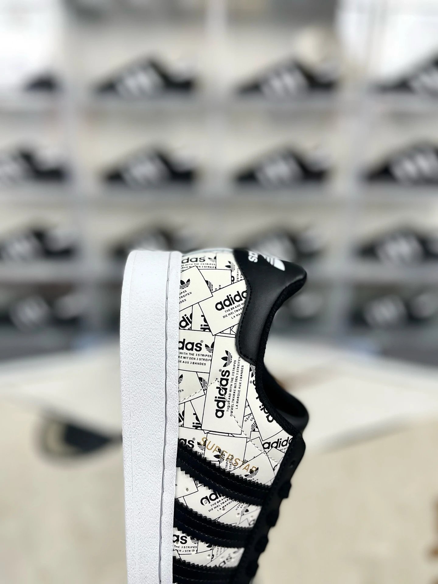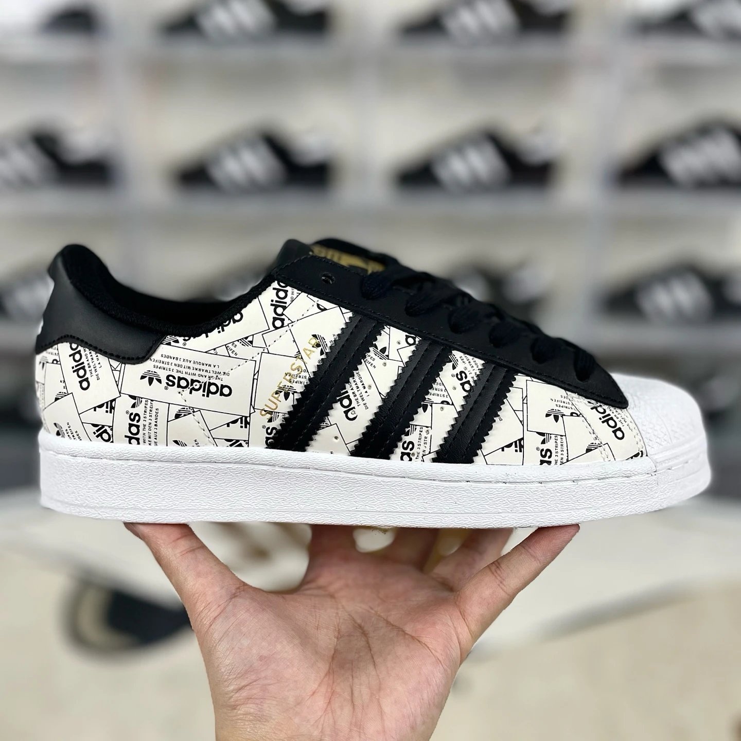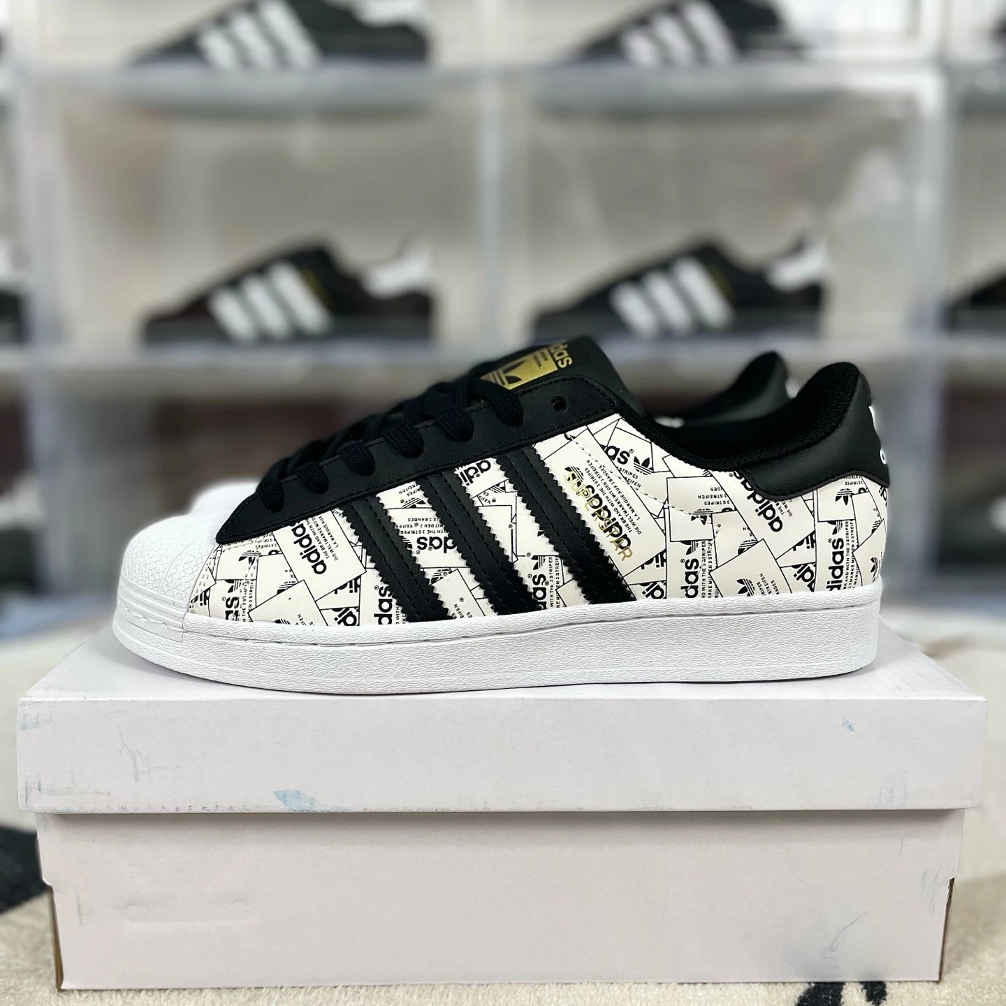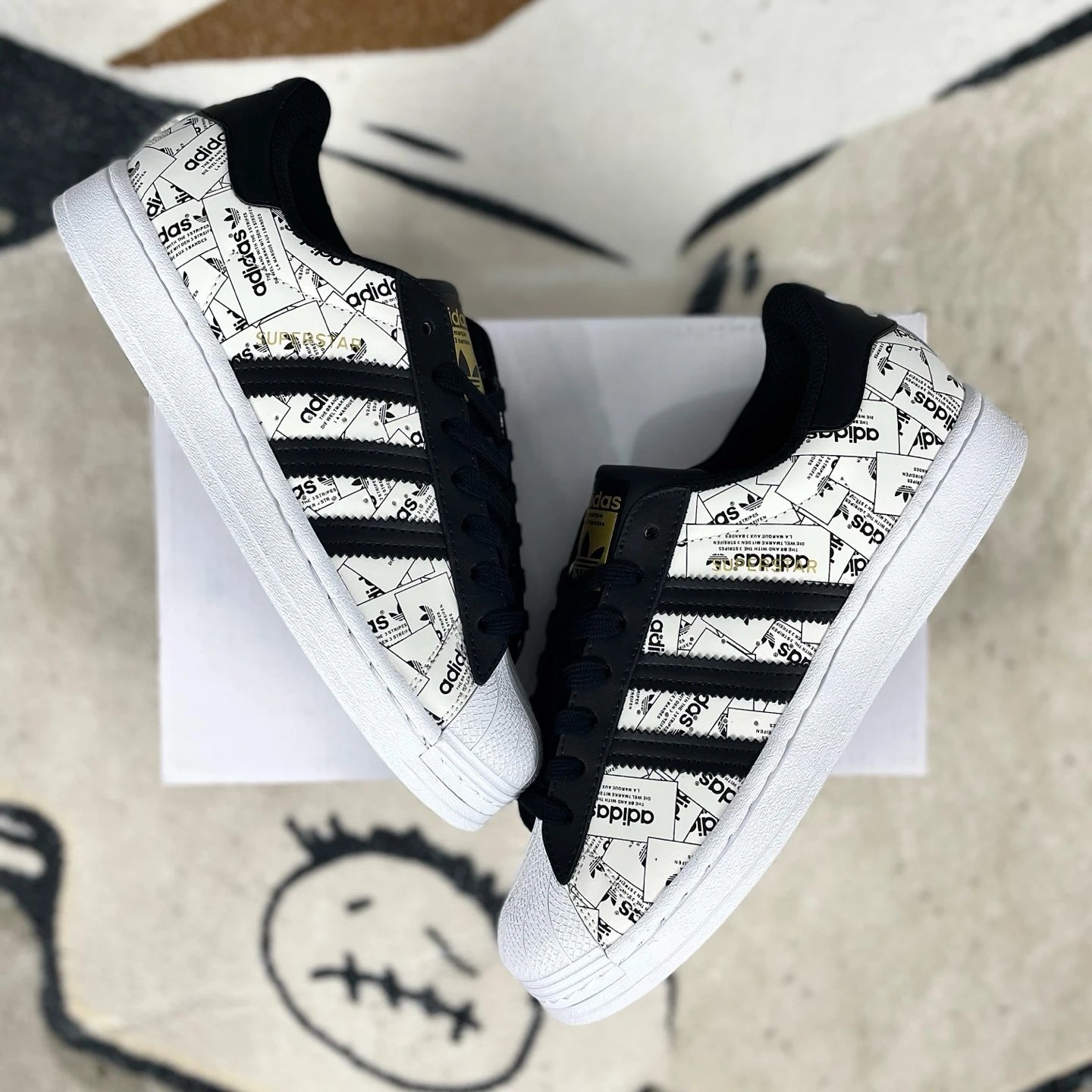 Adidas Originals Superstar Unisex Low-Top Sneakers (White Black) feature all-over logo print, rubber shell toe, non-slip & shock-absorbing.