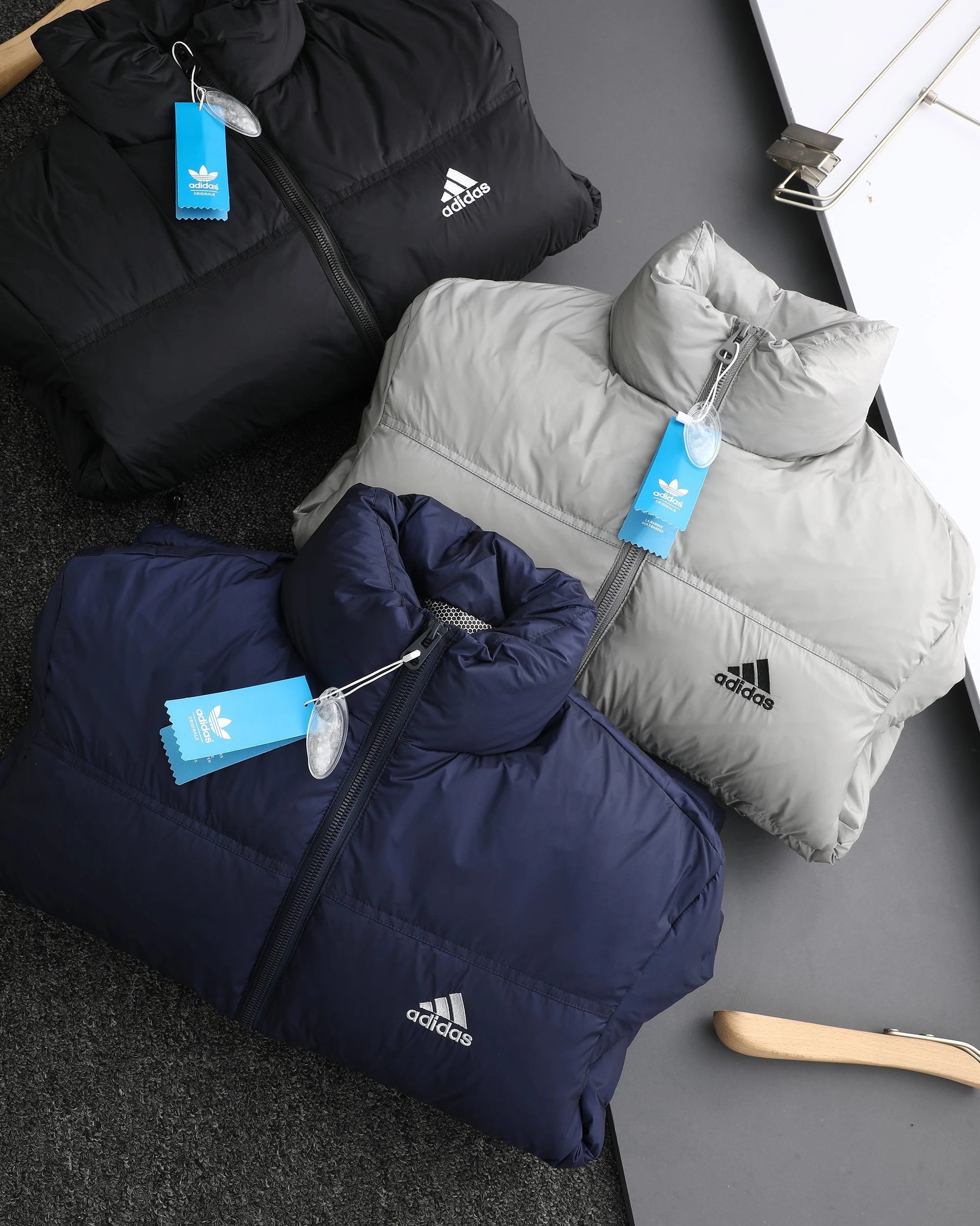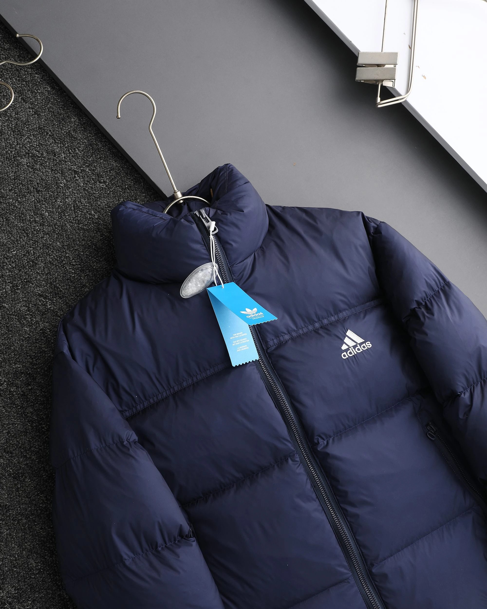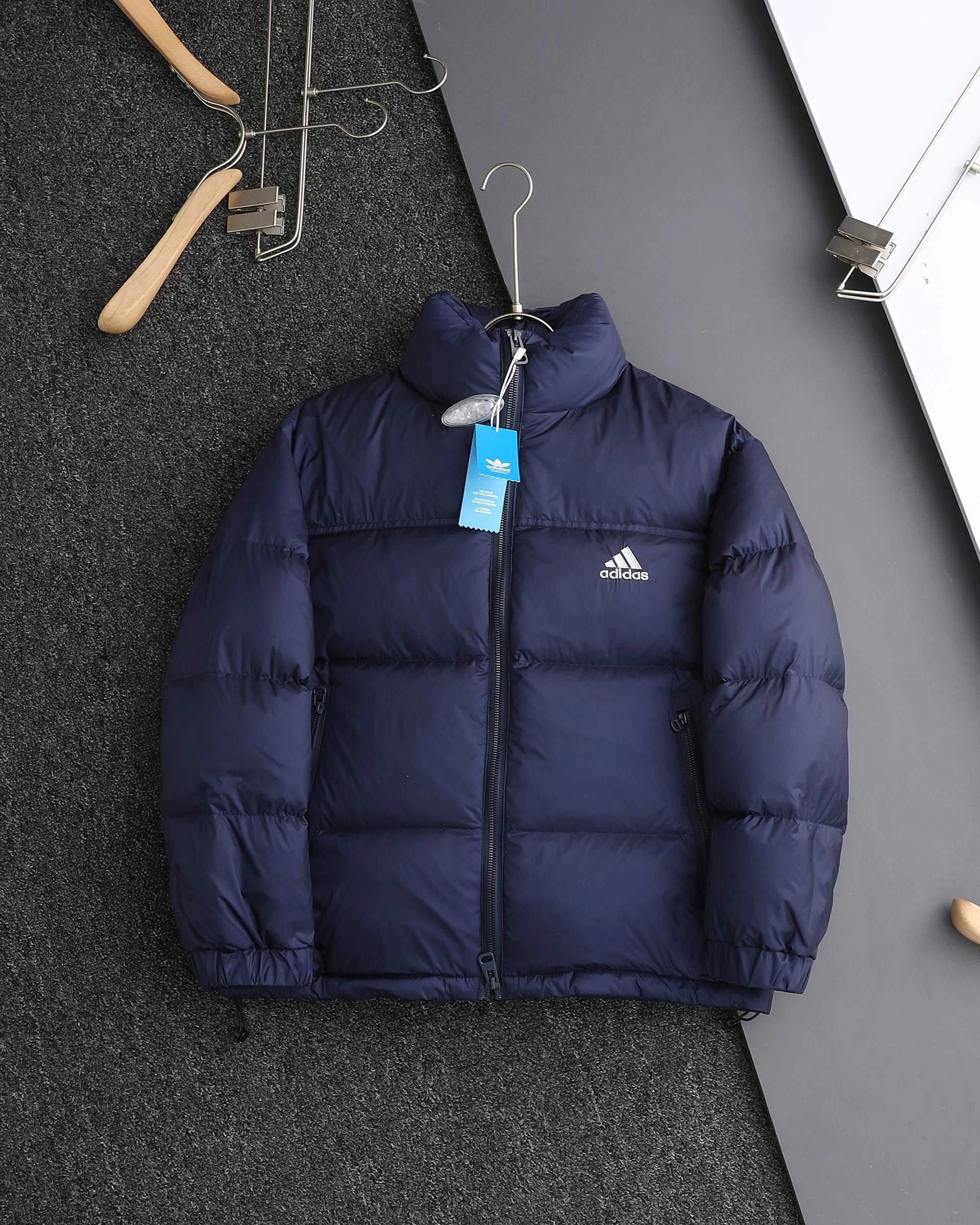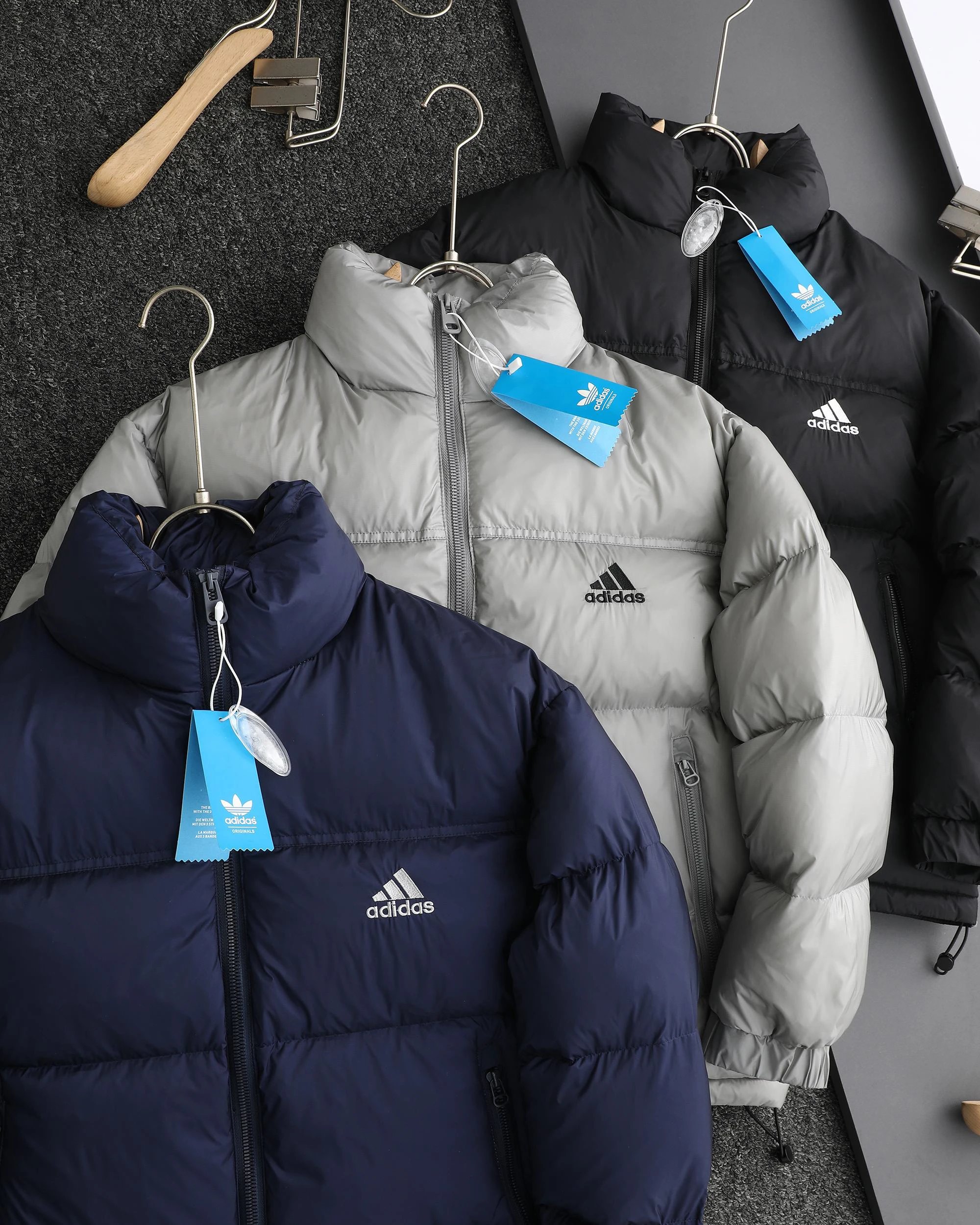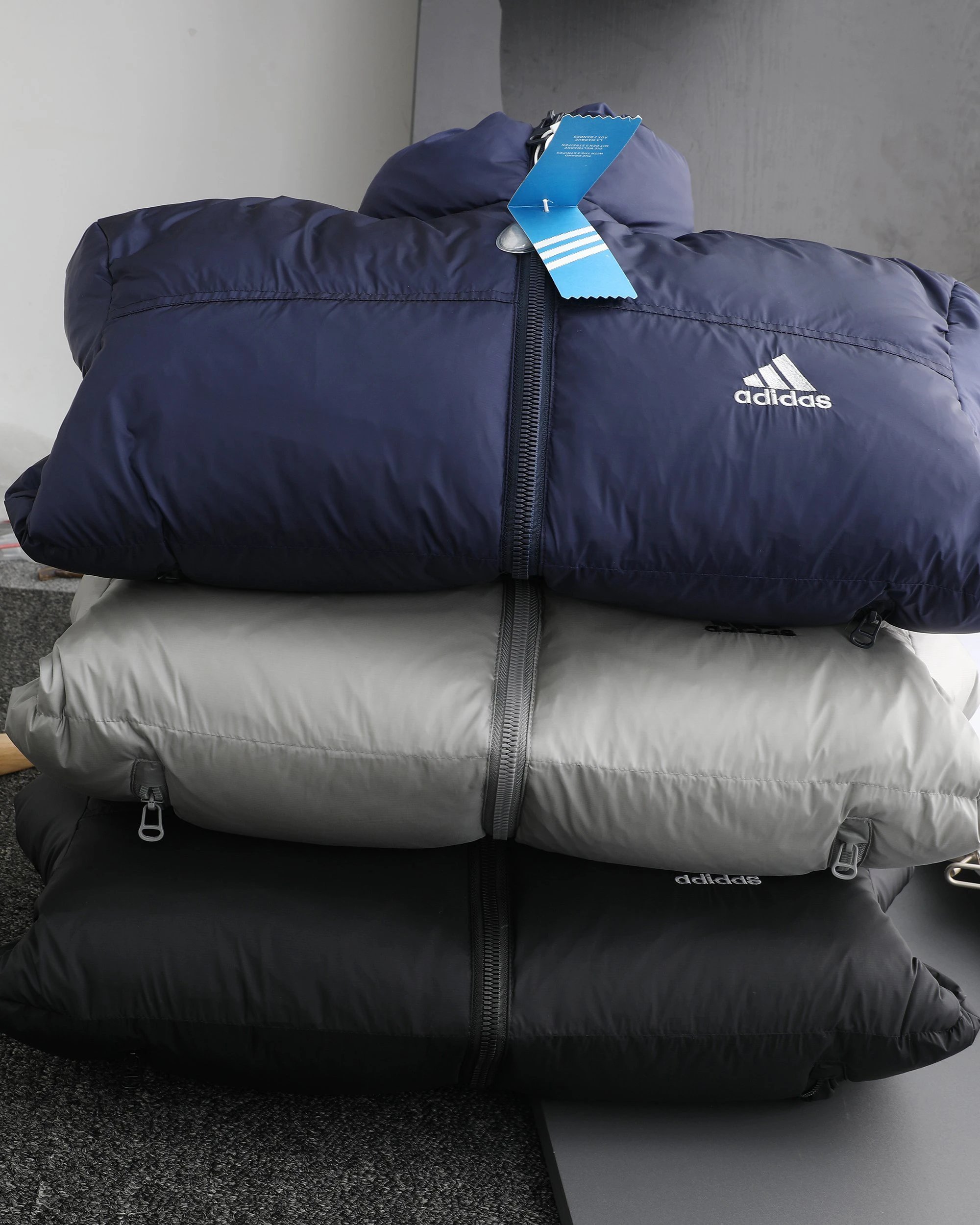 Adidas 3-Stripes unisex down jacket uses 80% white duck down for top warmth. 2025 winter style, available in black, navy, silver gray.