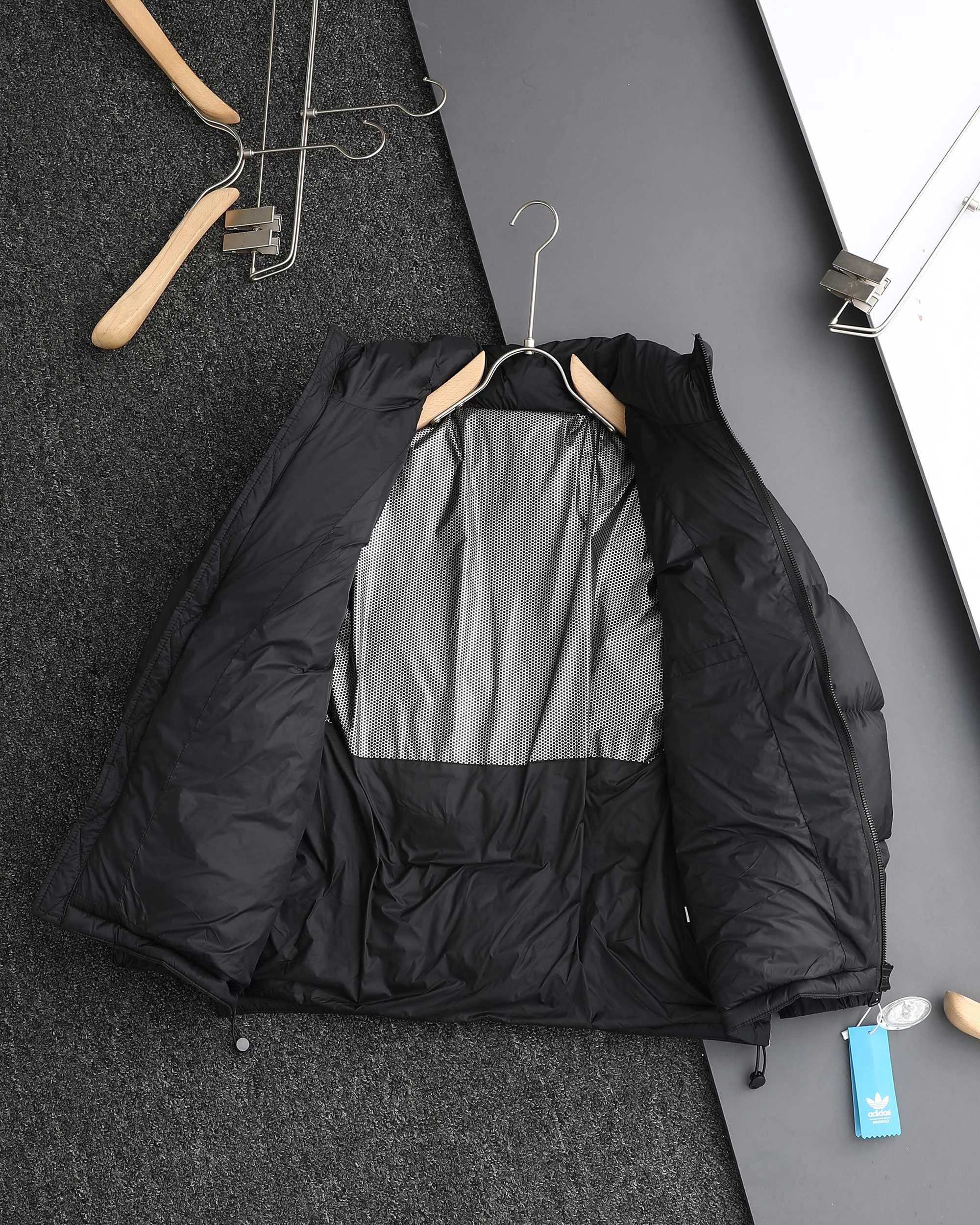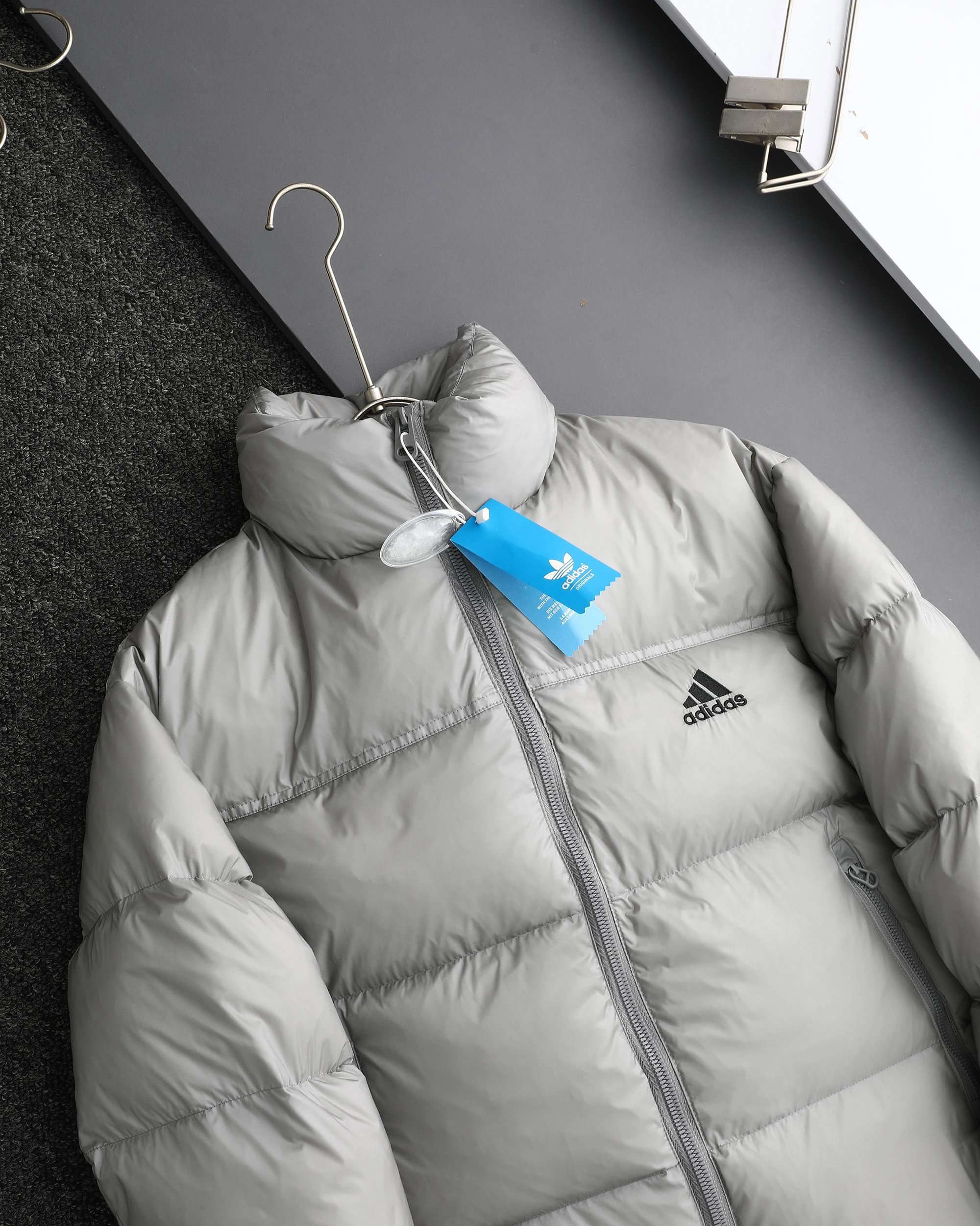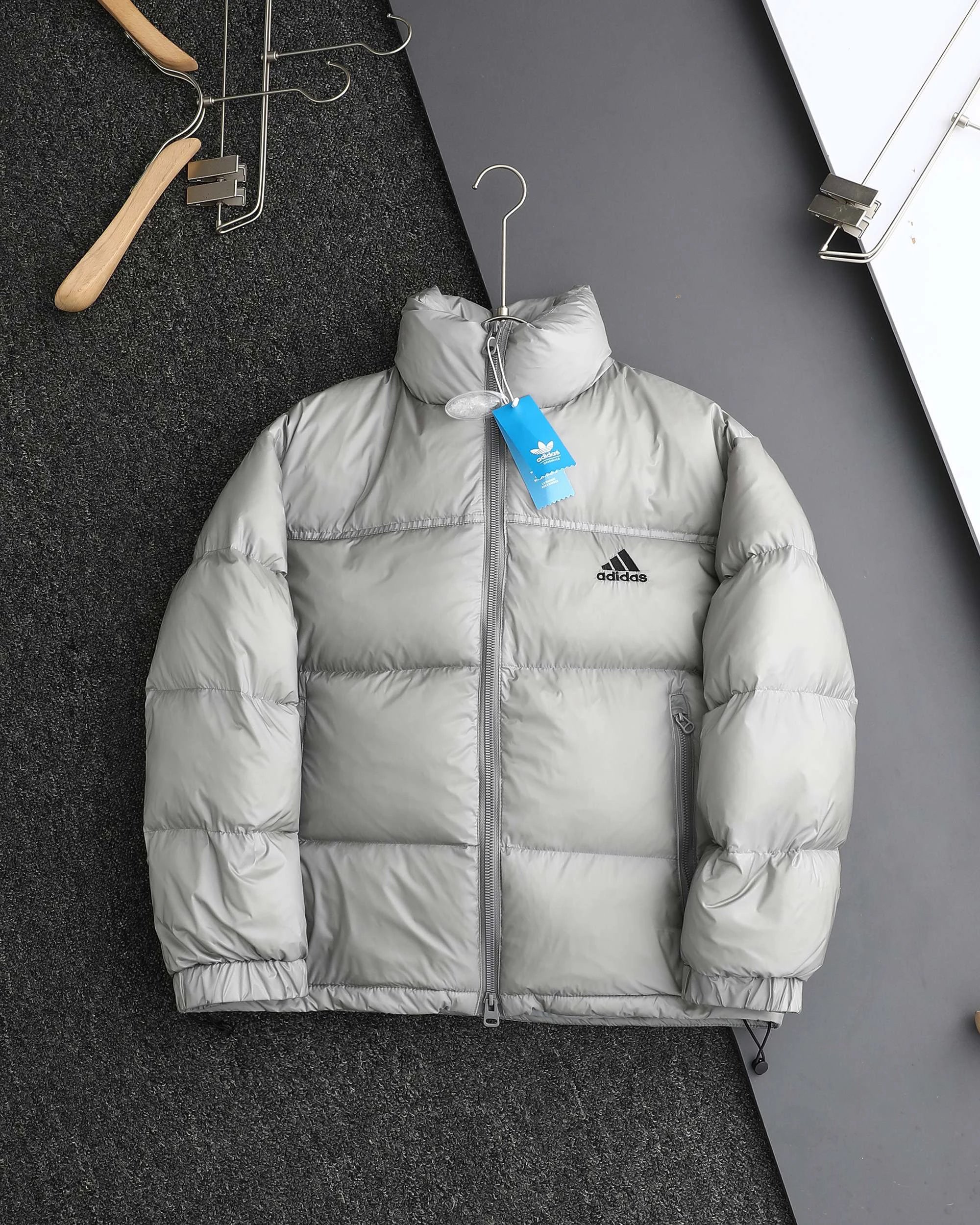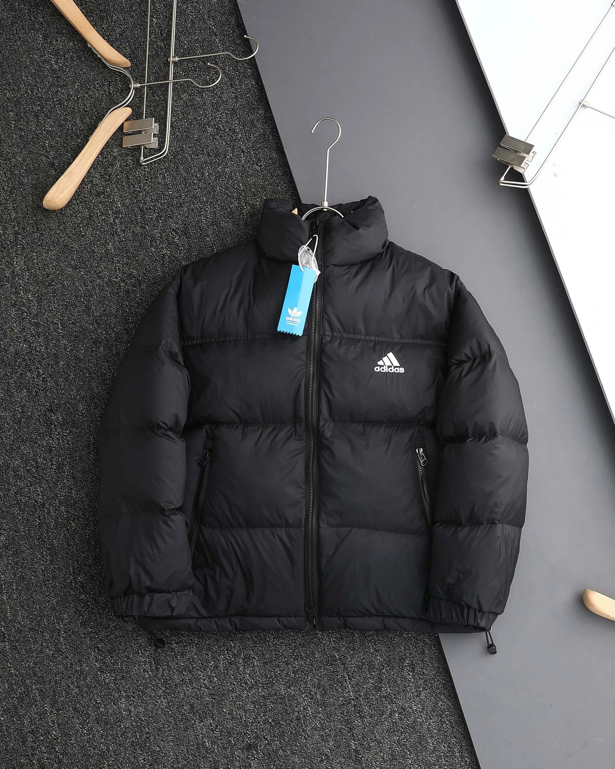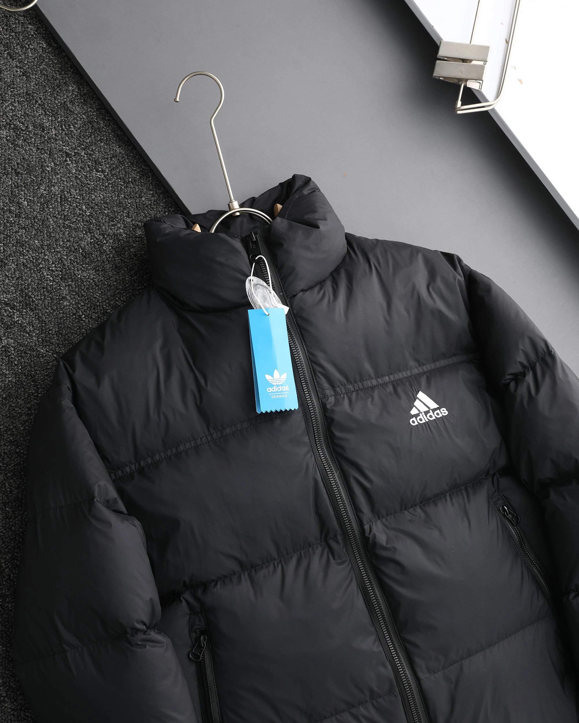 Adidas 3-Stripes unisex down jacket uses 80% white duck down for top warmth. 2025 winter style, available in black, navy, silver gray.