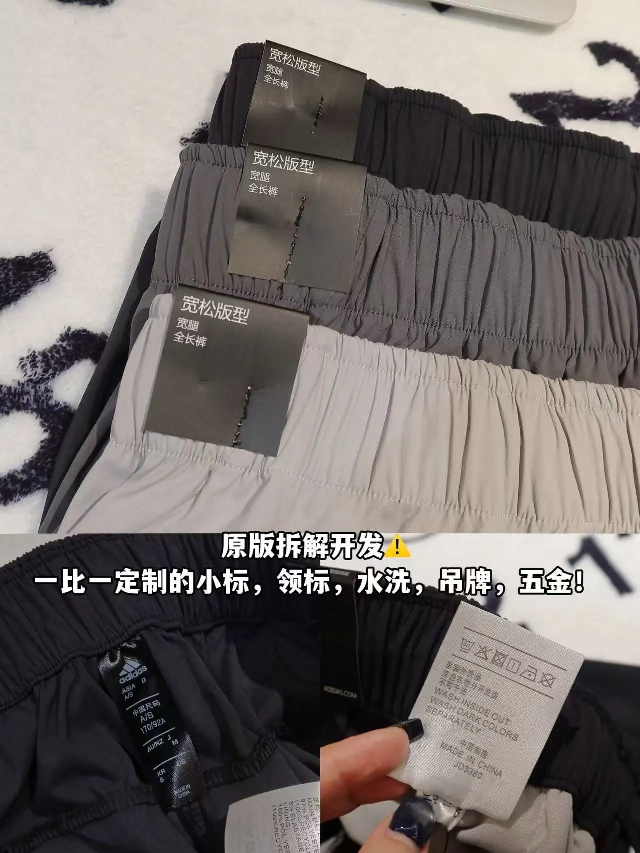 Original accessories/craftsmanship; reinforced pockets with mesh, drawstring cuffs (wide/tapered), button + drawstring waist.