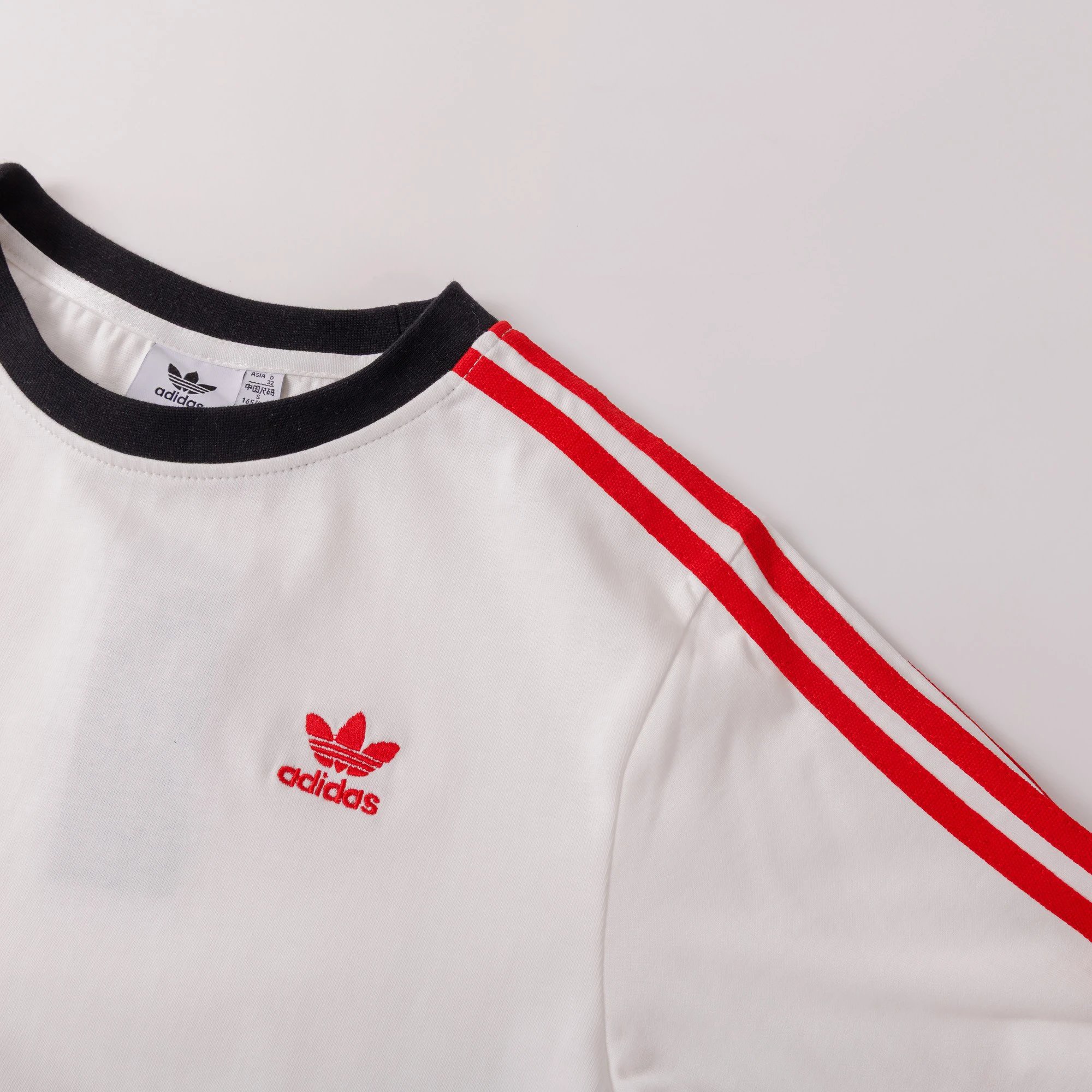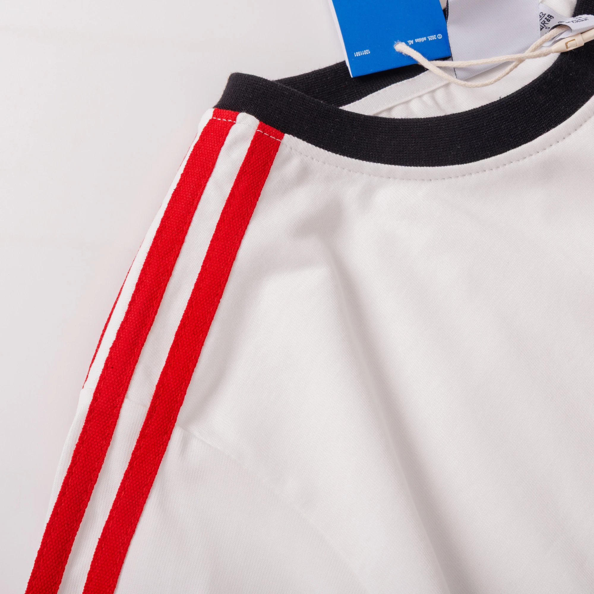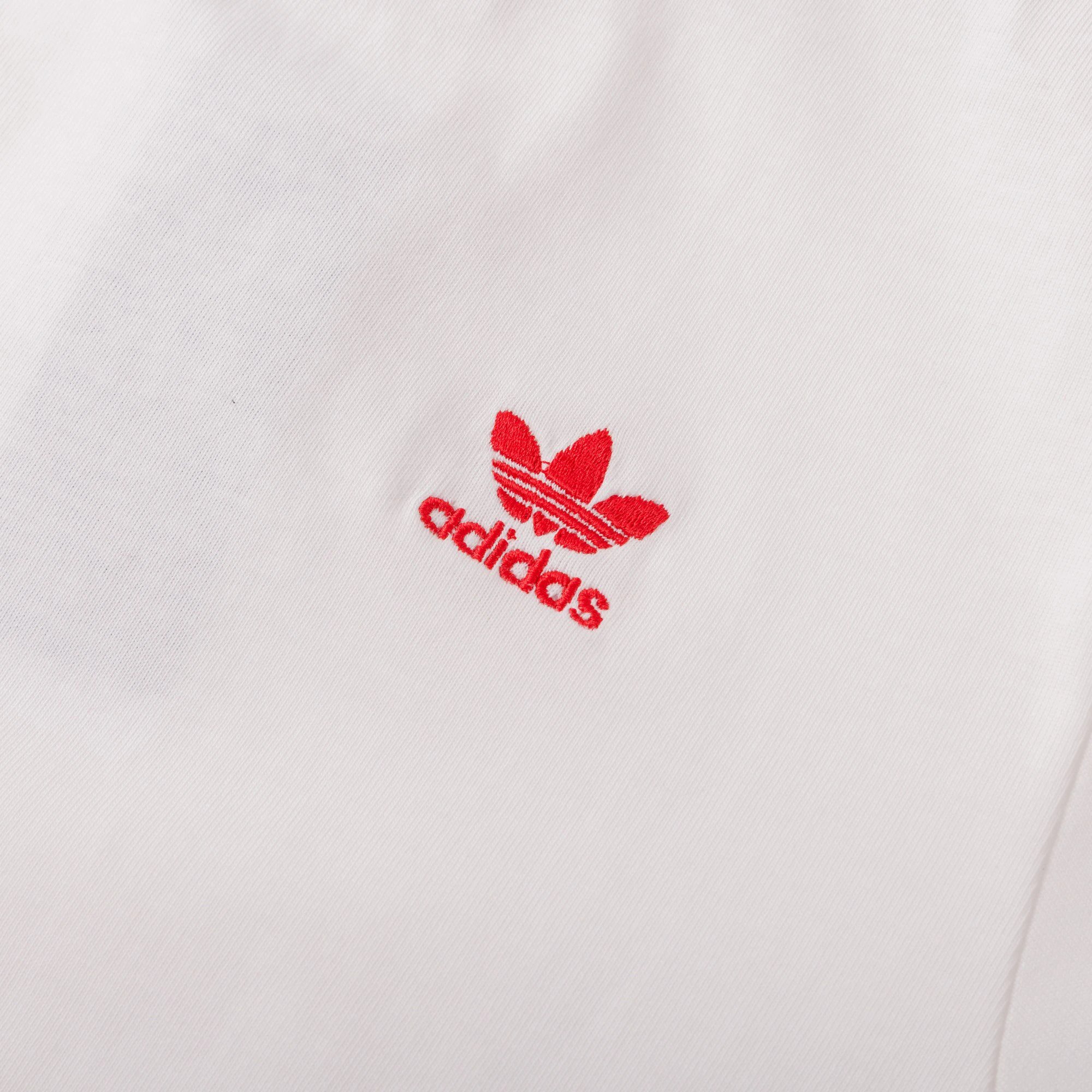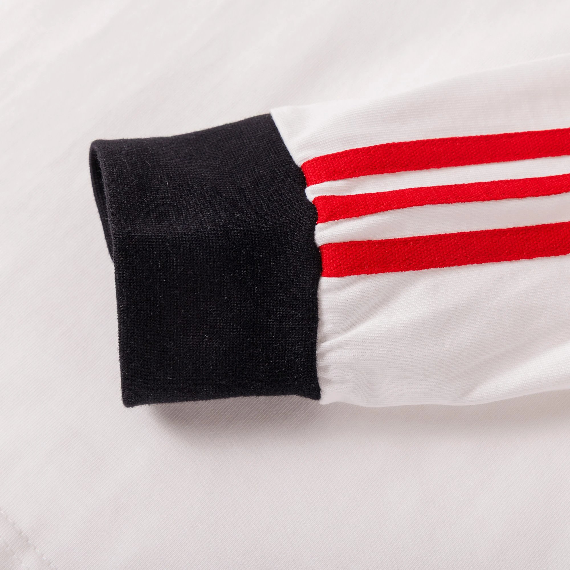 Adidas White 3-Stripes Long Sleeve Crew Neck T-Shirt uses 340g heavy double yarn cotton, color-fast red stripes & embroidered logo.