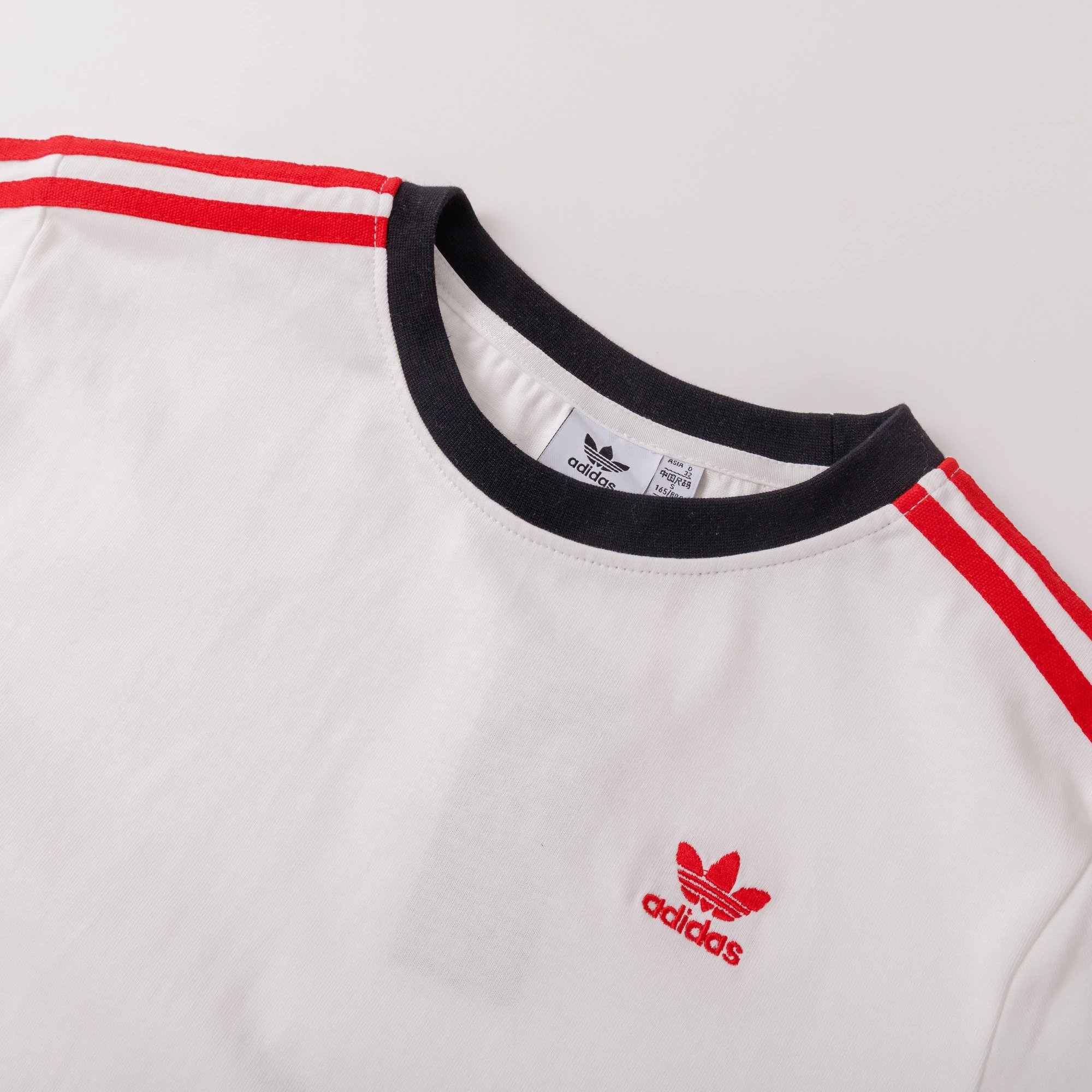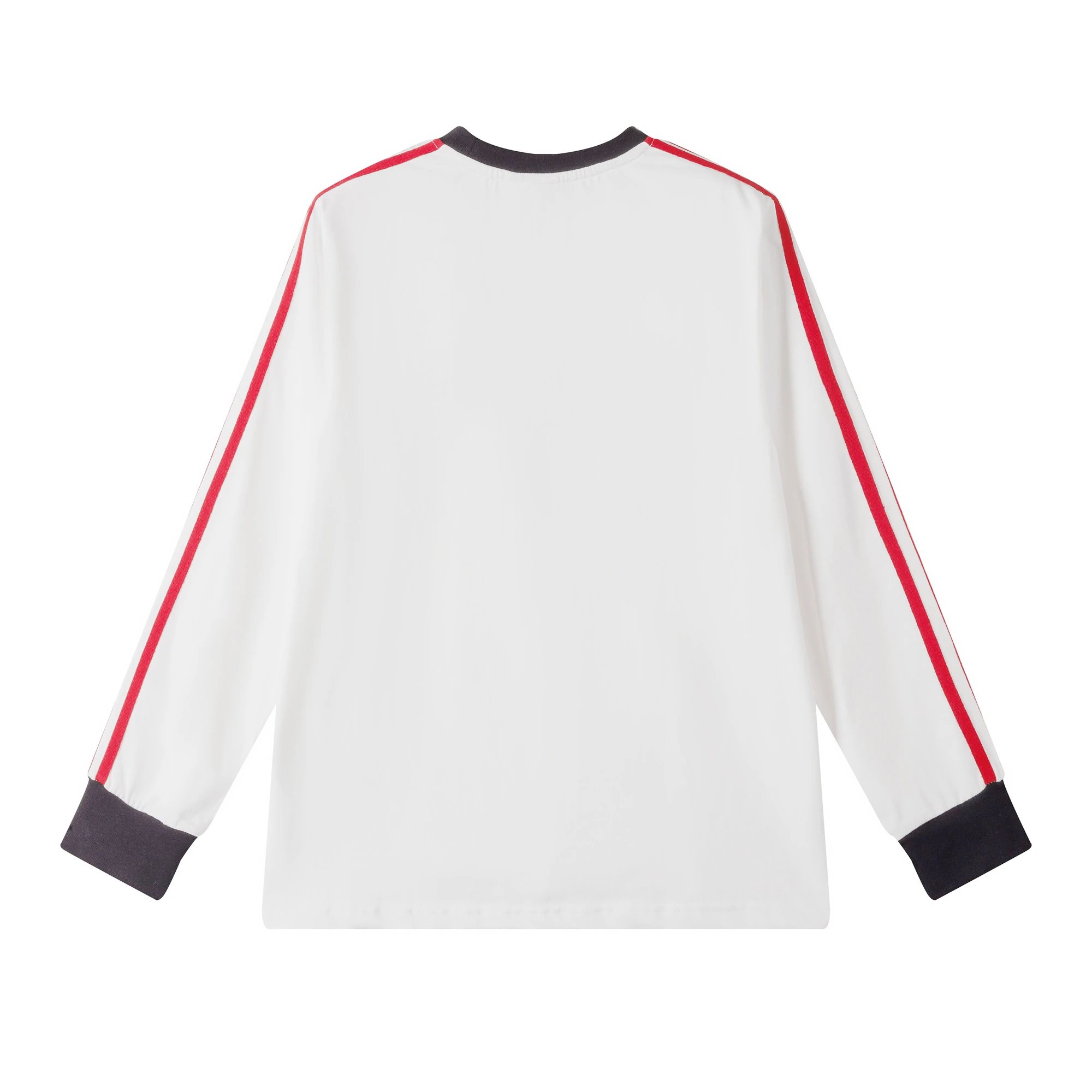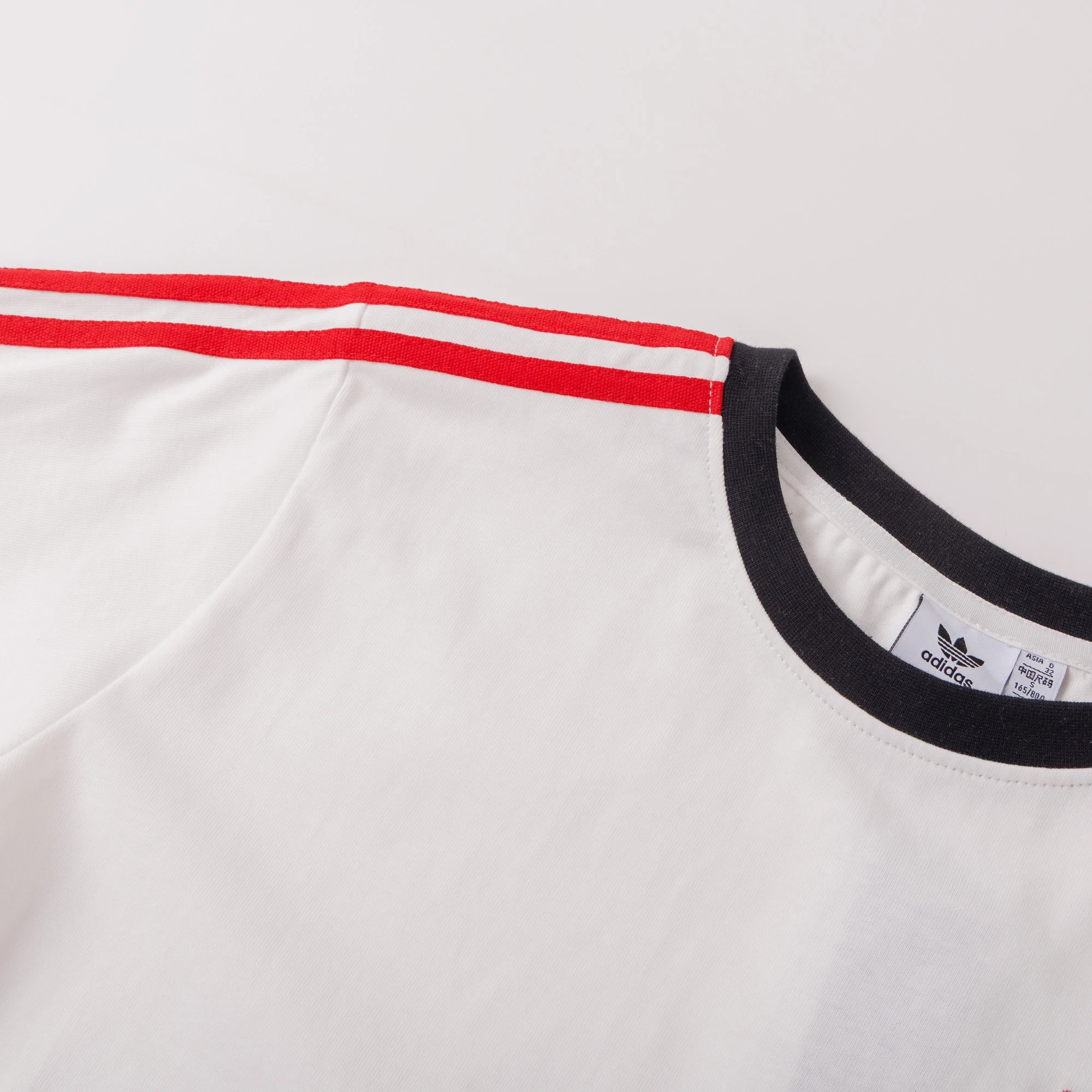 Adidas White 3-Stripes Long Sleeve Crew Neck T-Shirt uses 340g heavy double yarn cotton, color-fast red stripes & embroidered logo.