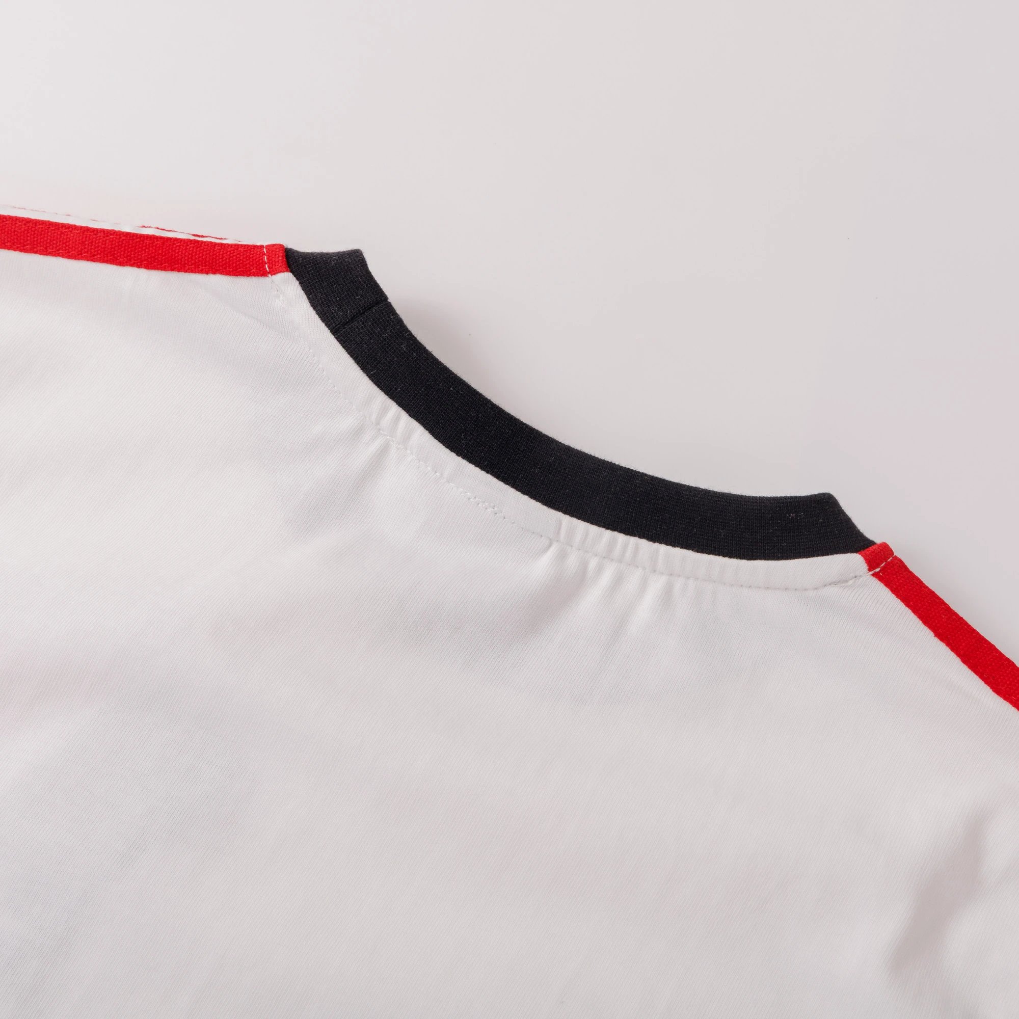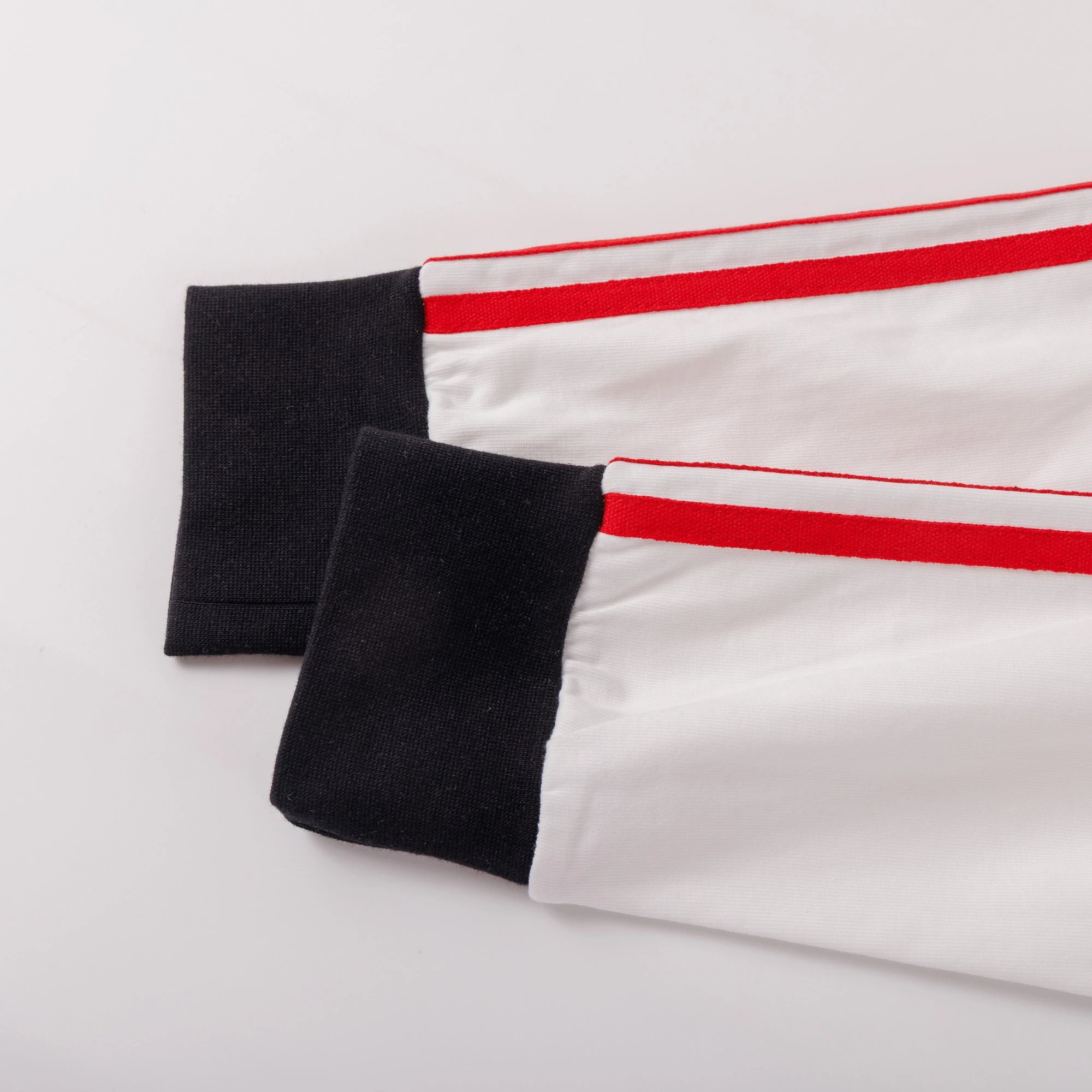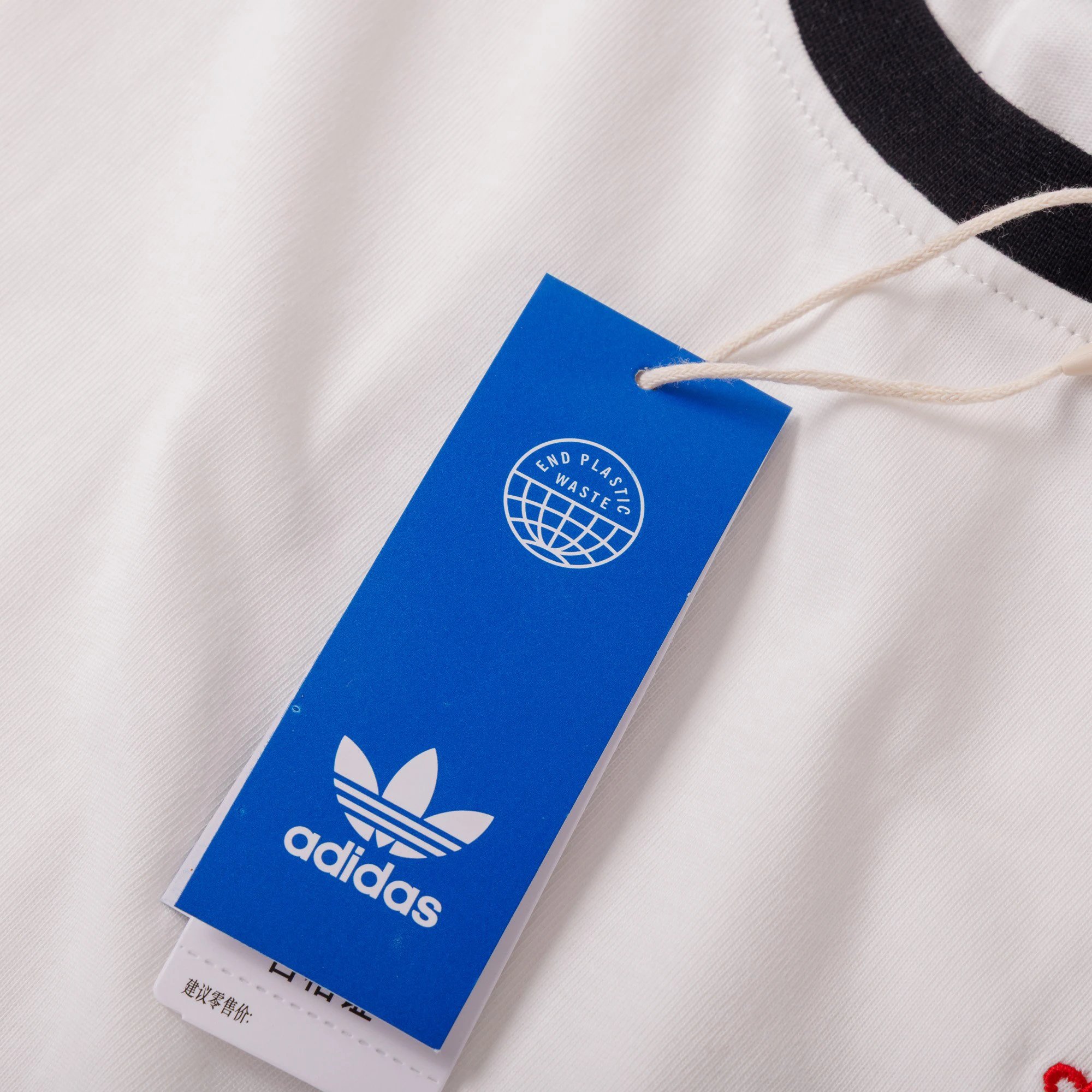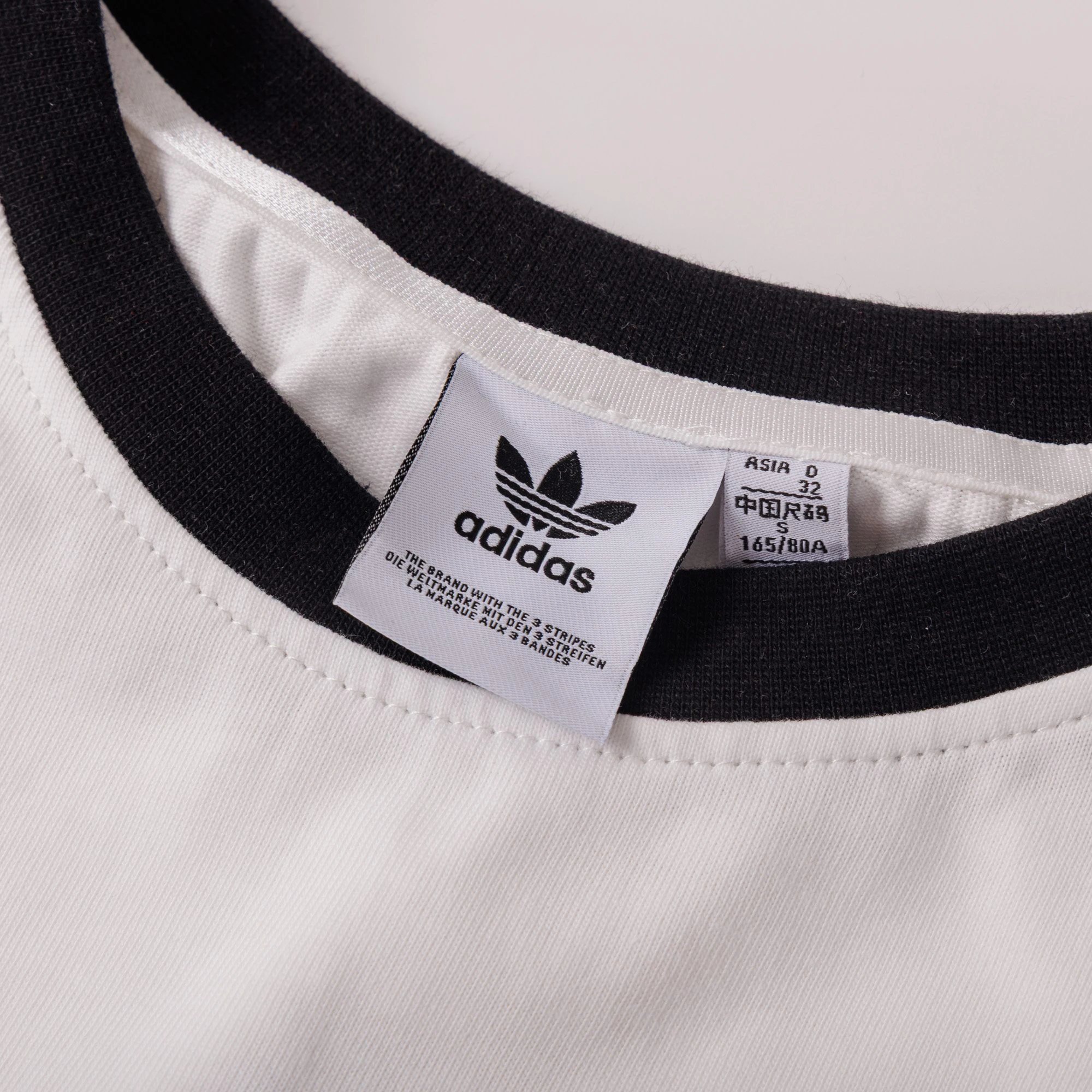 Adidas White 3-Stripes Long Sleeve Crew Neck T-Shirt uses 340g heavy double yarn cotton, color-fast red stripes & embroidered logo.