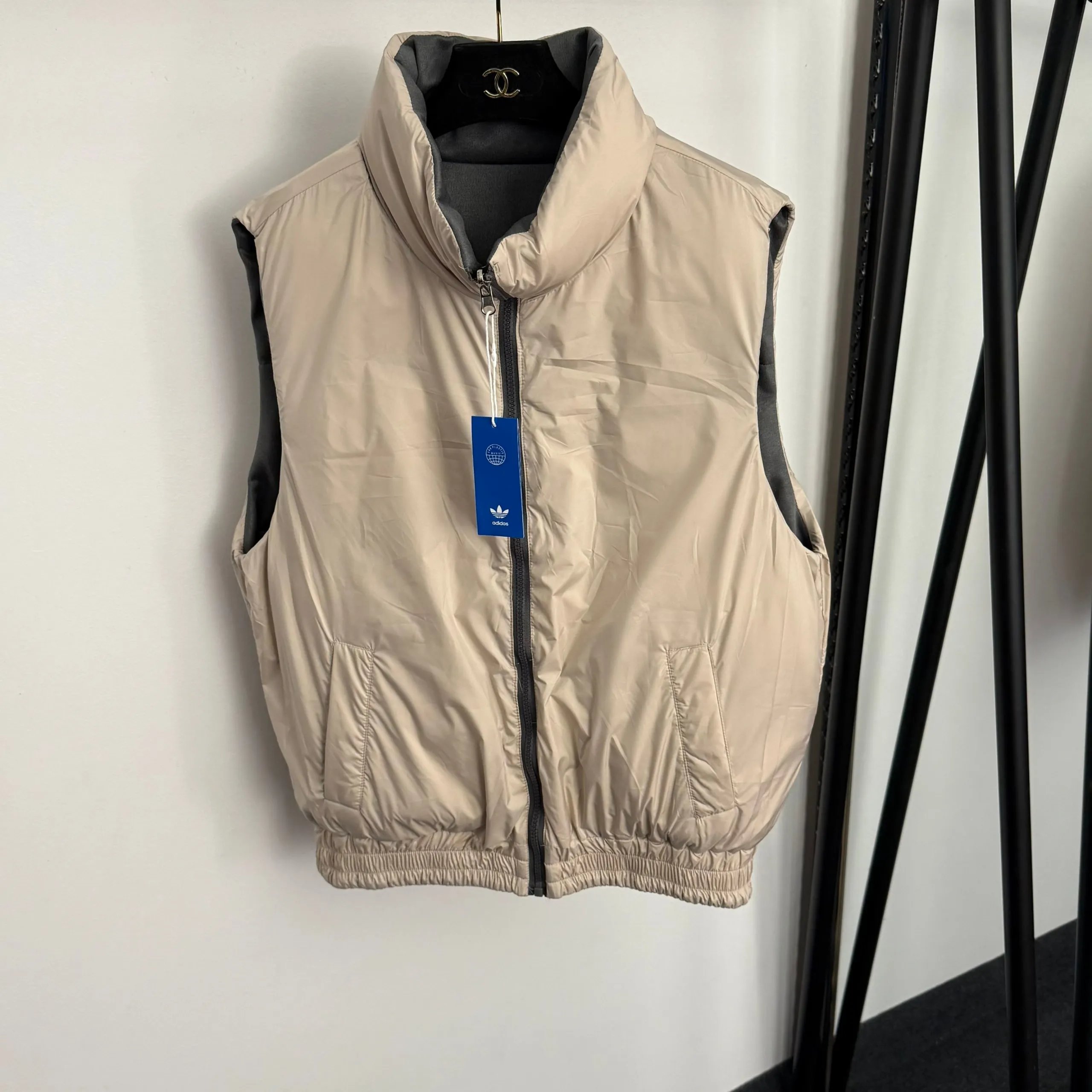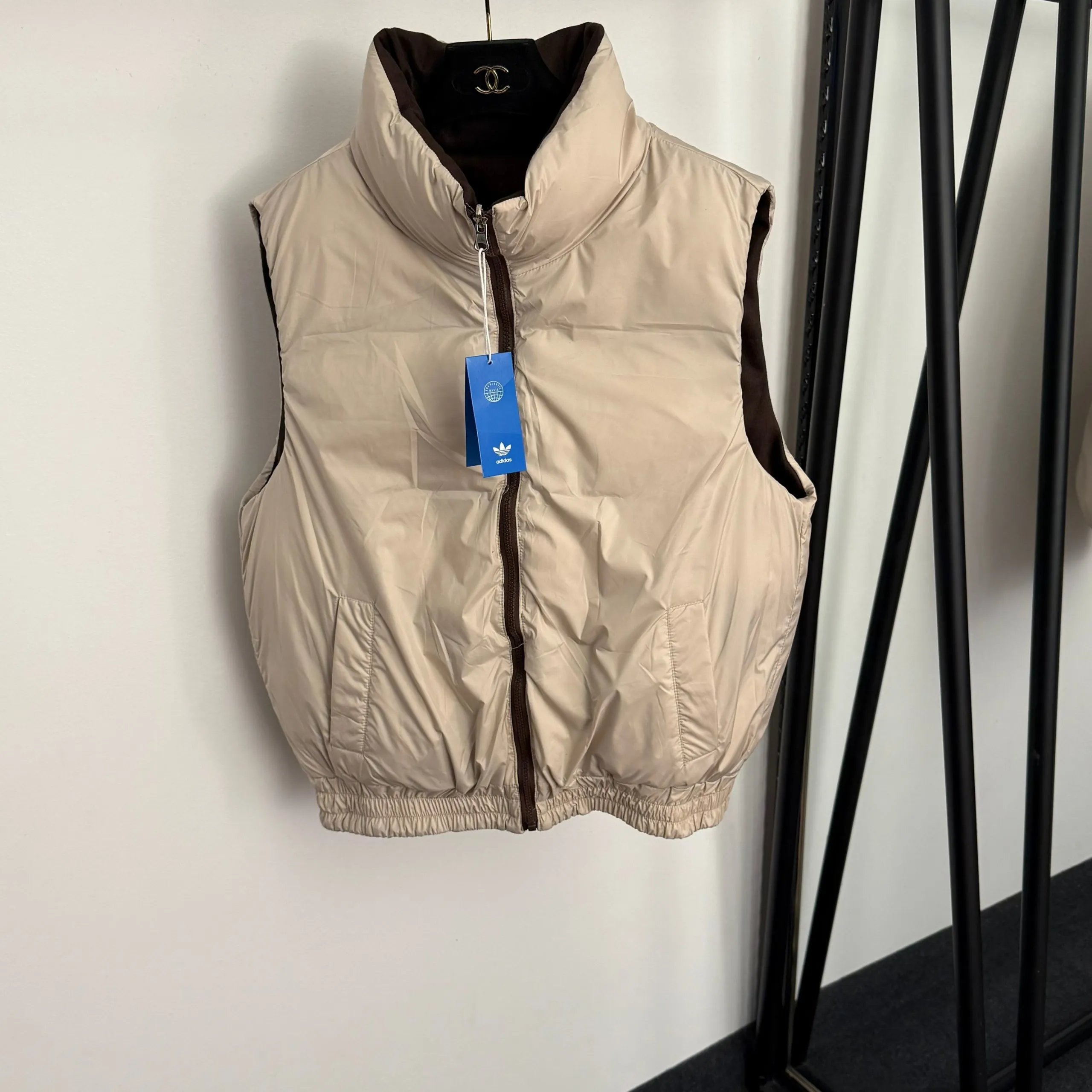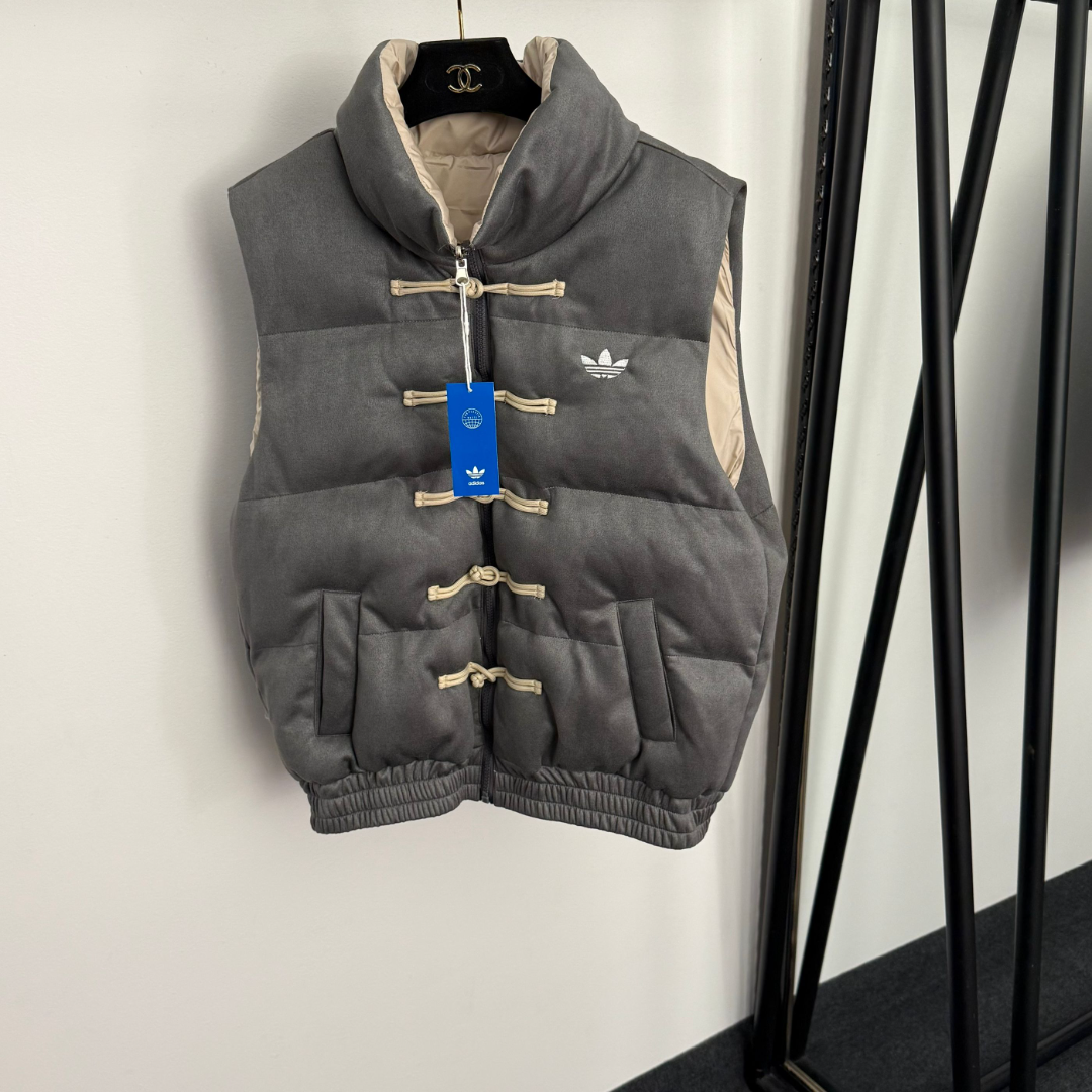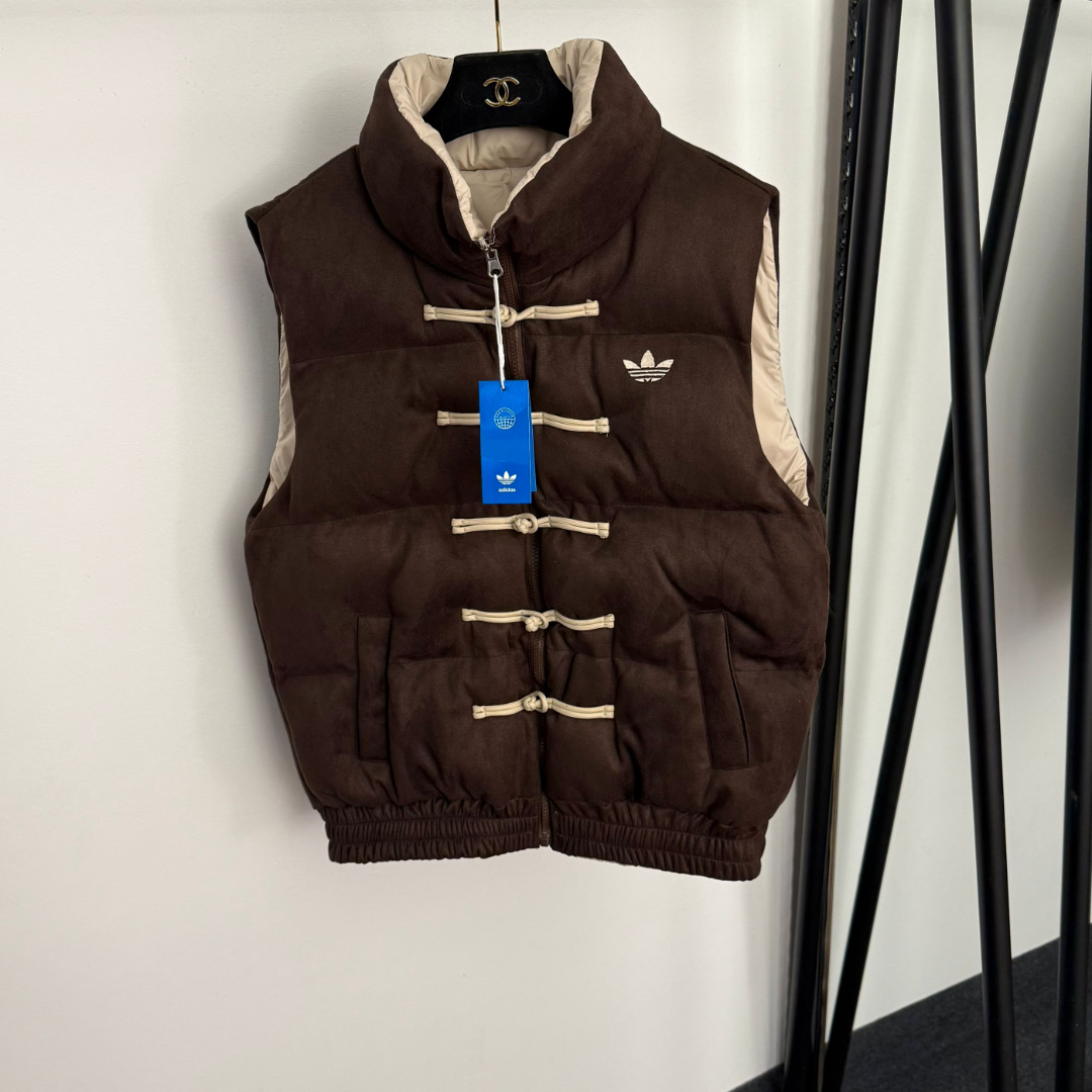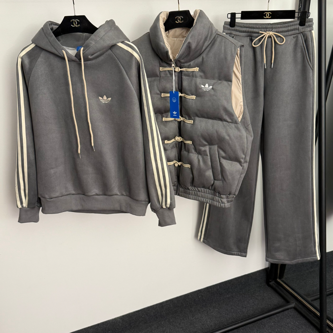 Adidas 3-Piece Warm Set has Chinese frog buttons, Trefoil embroidery, fleece-lined hooded sleeves, elastic waist.