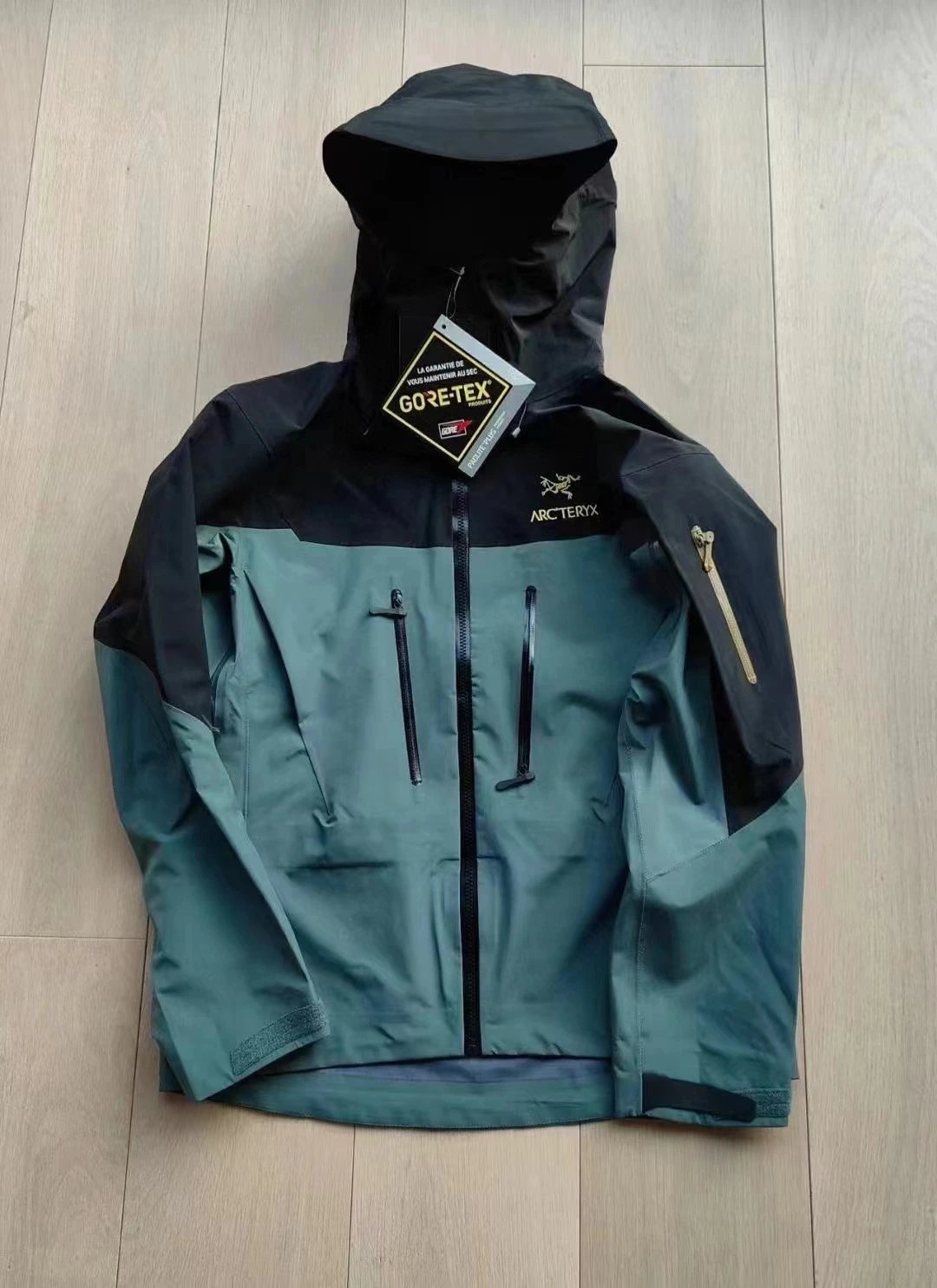 Made with GORE-TEX Pro, it has embroidered logo, underarm vents, water-repellent hood, easy zippers, large pockets, windproof hem.