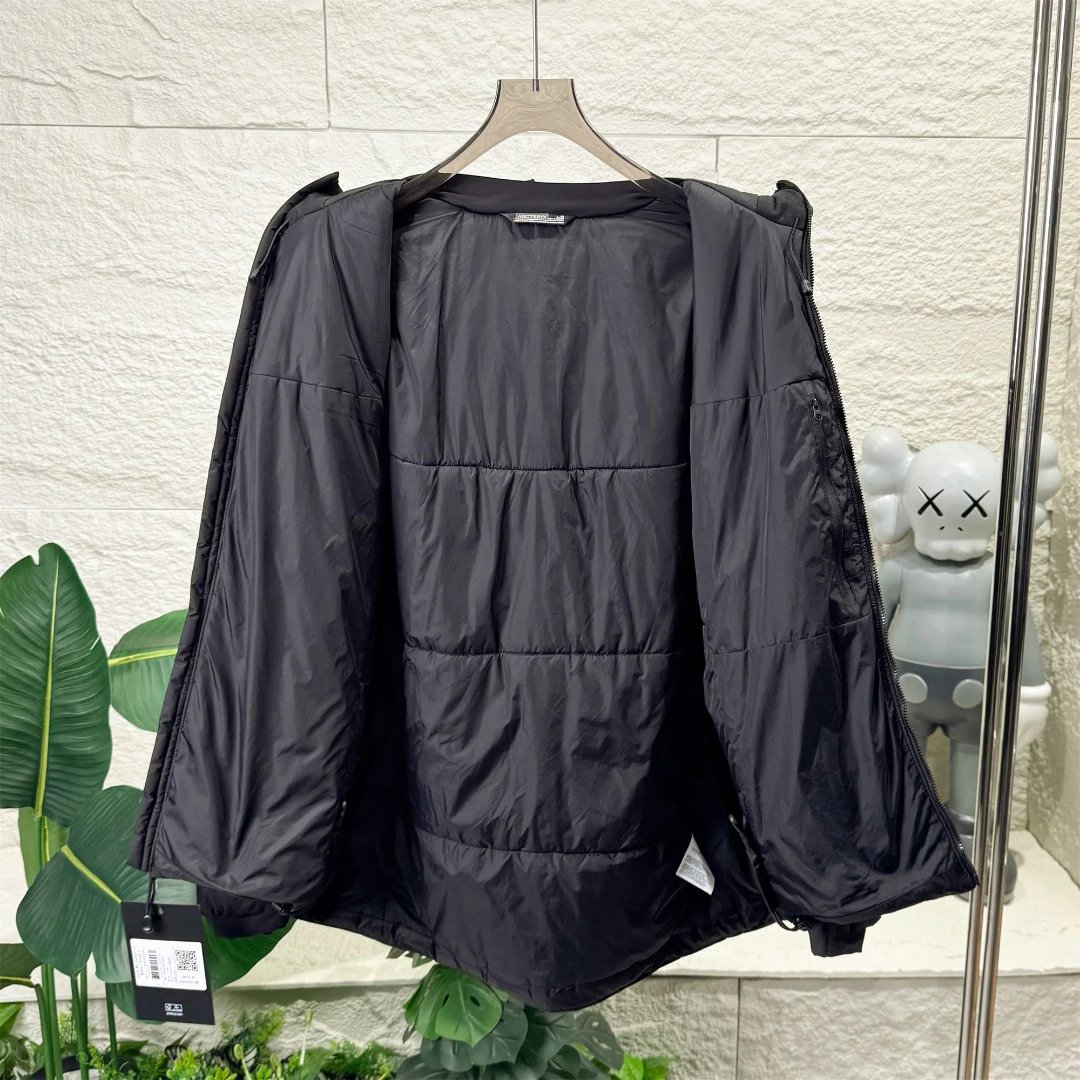 Stereo cut at shoulders/elbows for mobility; internal waist cinch, vertical zipper to avoid belt snagging.