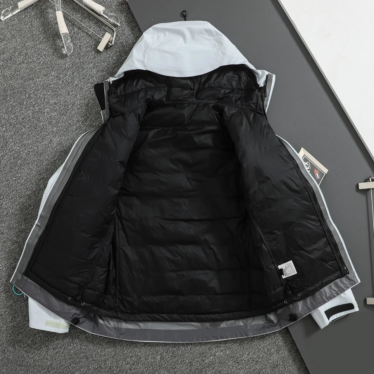 Waterproof hardshell + warm down inner, 3 ways to wear. GORETEX fabric: windproof, breathable.