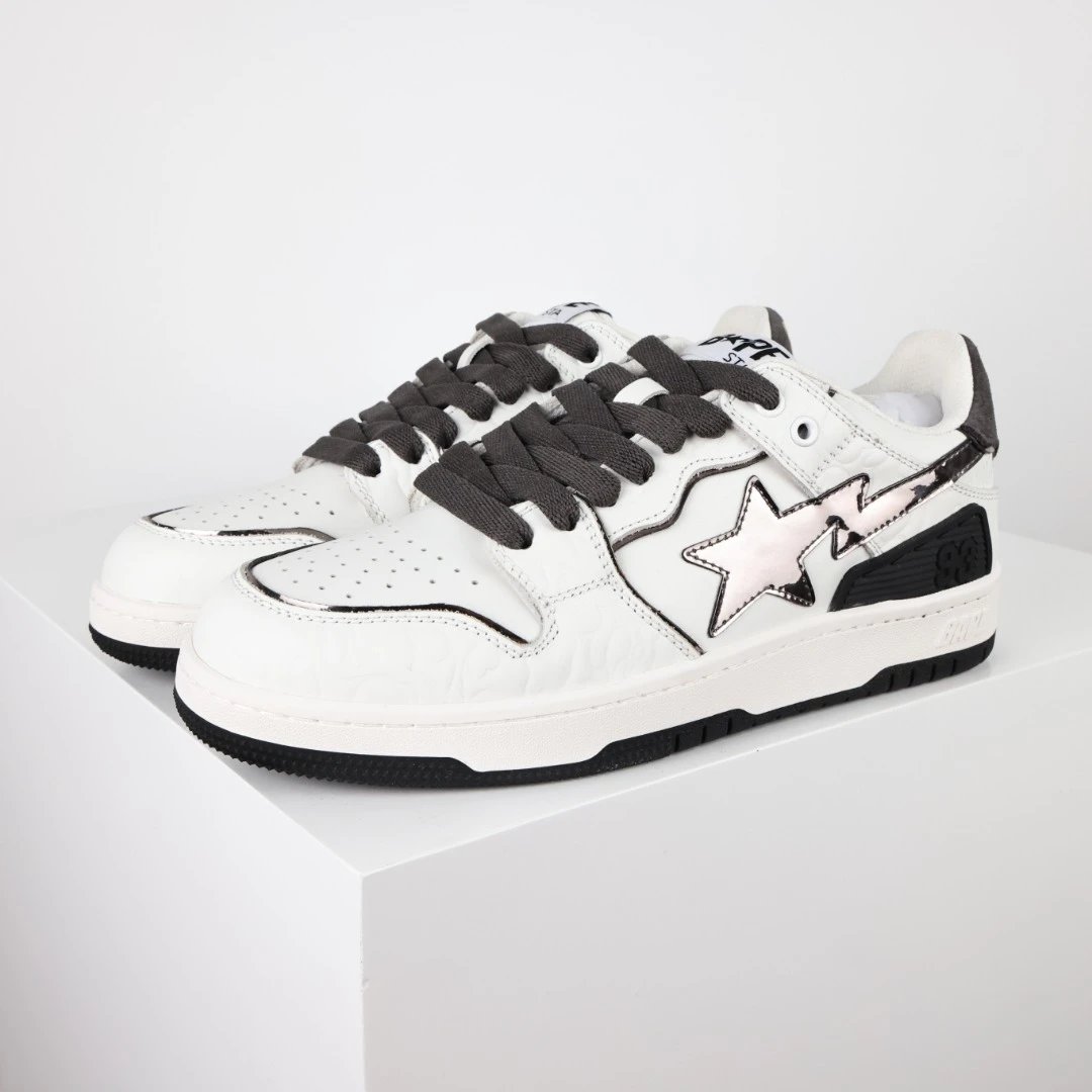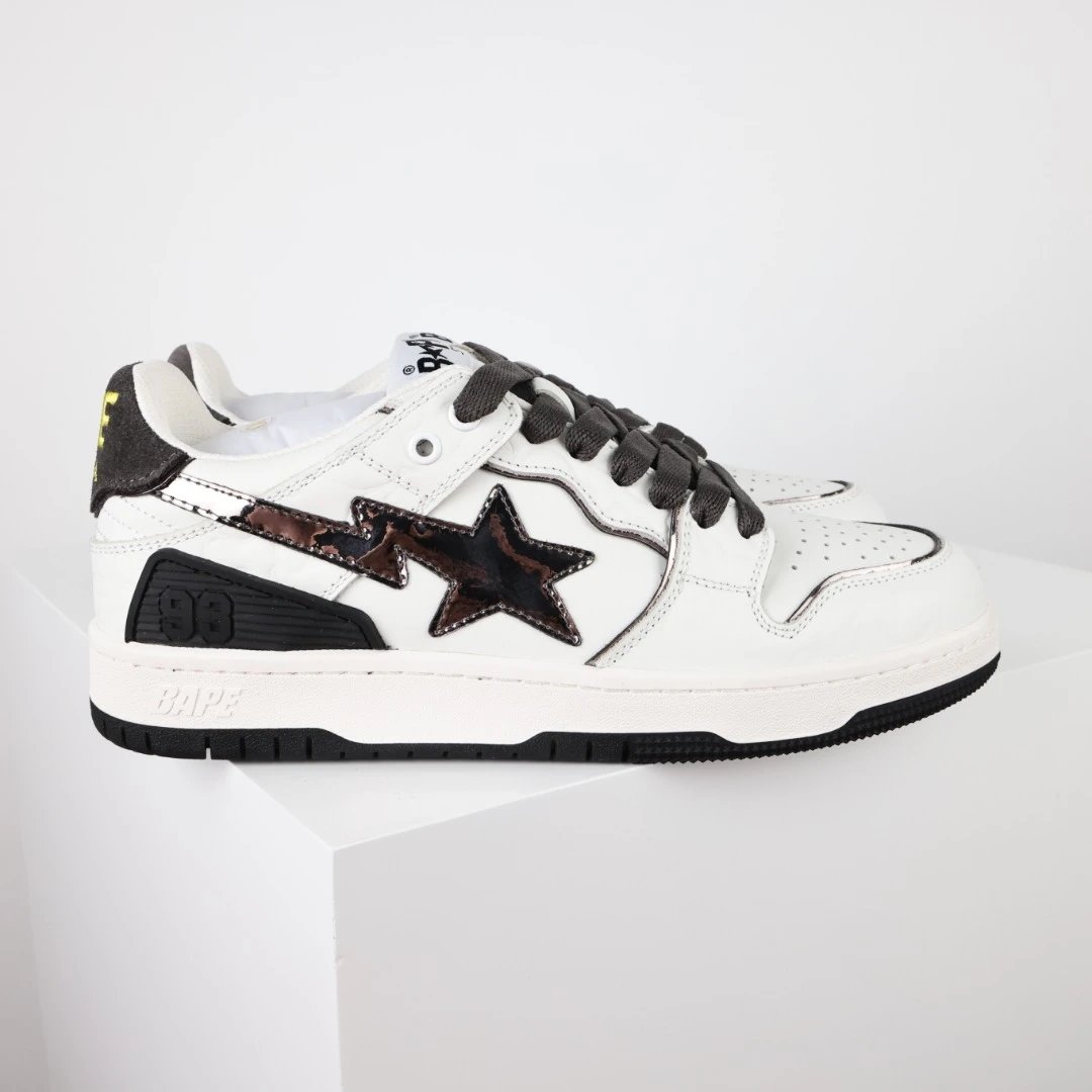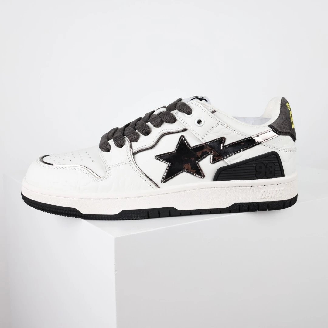 BAPE Sta Low Classic Skate Shoes use patent leather & nubuck upper.