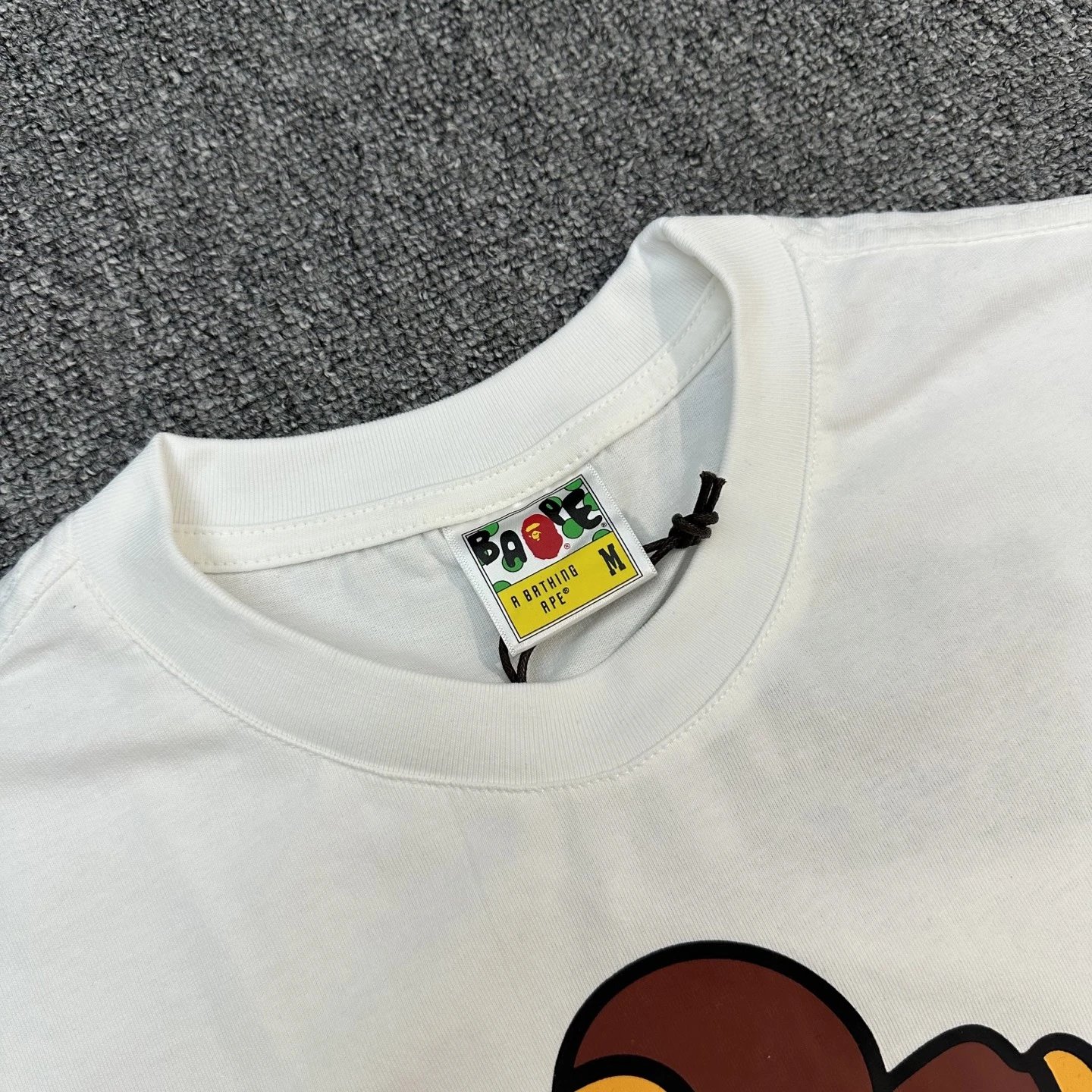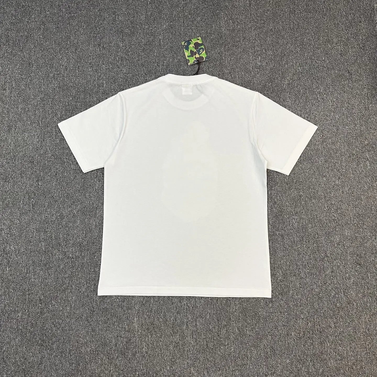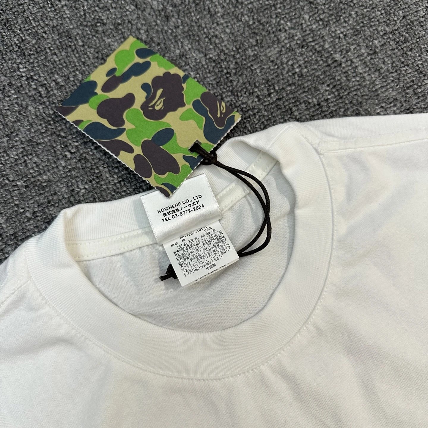 BAPE SS25 ABC CAMO Cartoon Ape Print T-Shirts use 280g linen-cotton blend fabric. Couples style, sizes S-XXL, colors like black-pink, white-pink.