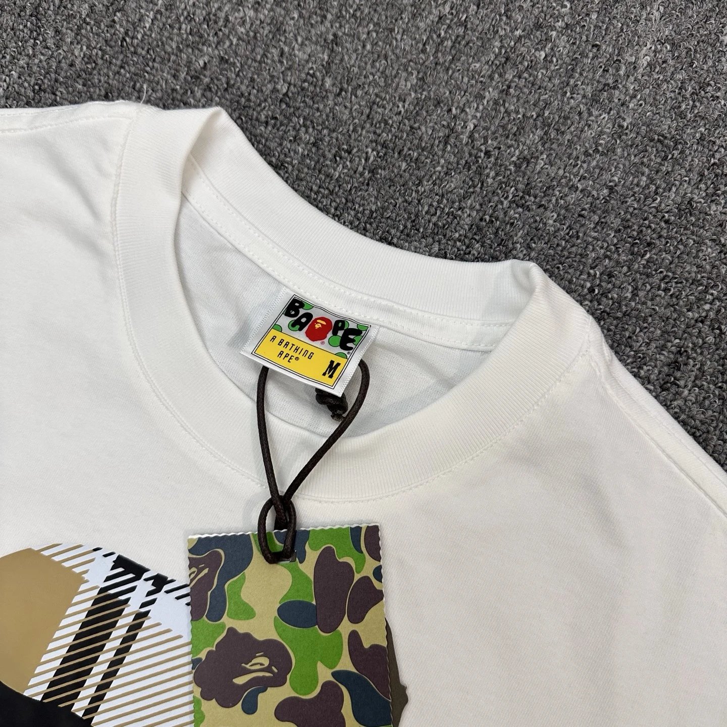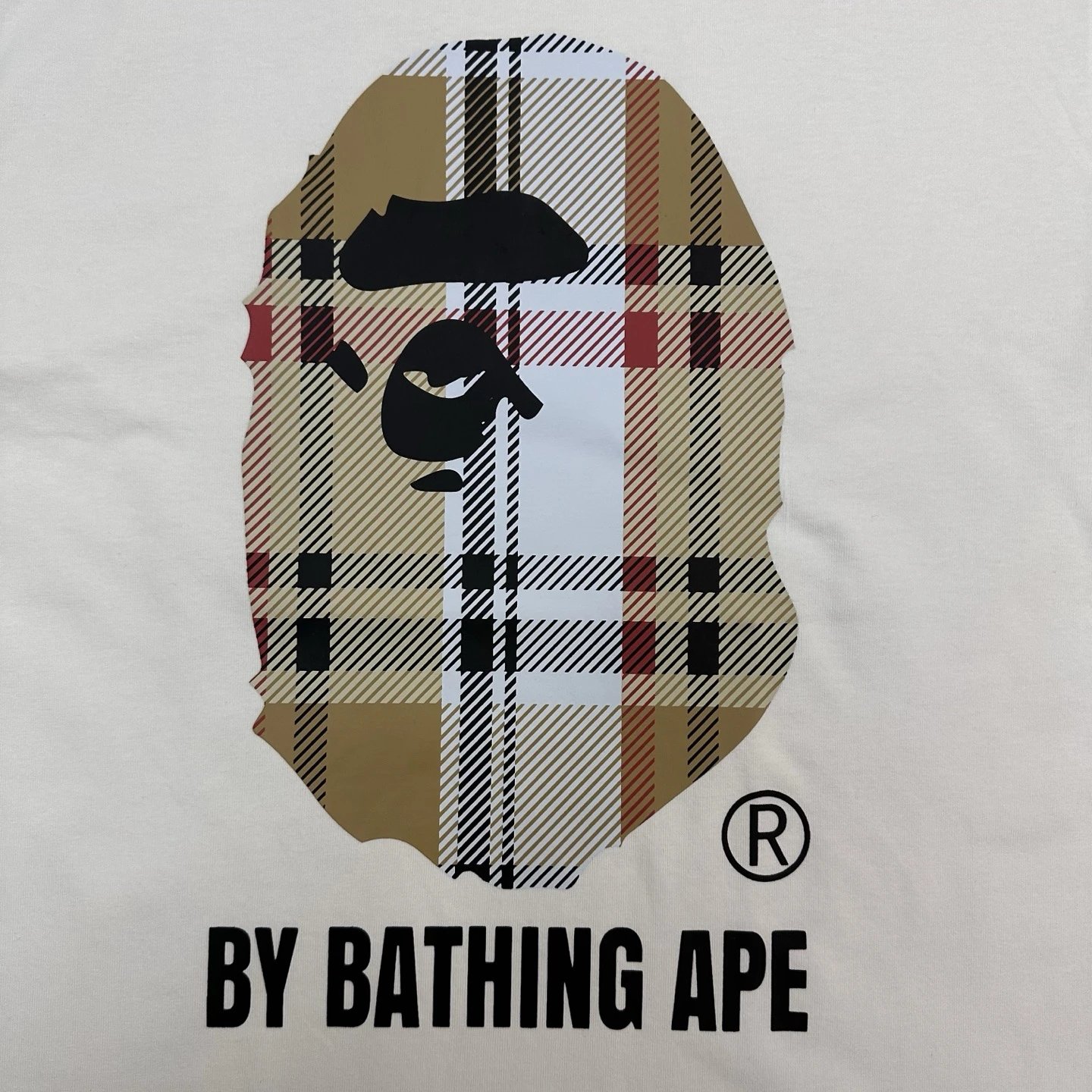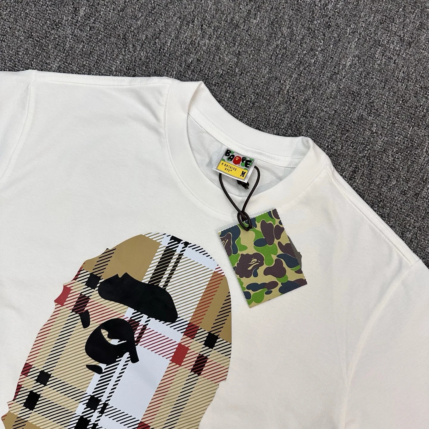 BAPE SS23 Crew Neck T-Shirt features ape plaid stripe print, 270g linen-cotton fabric.