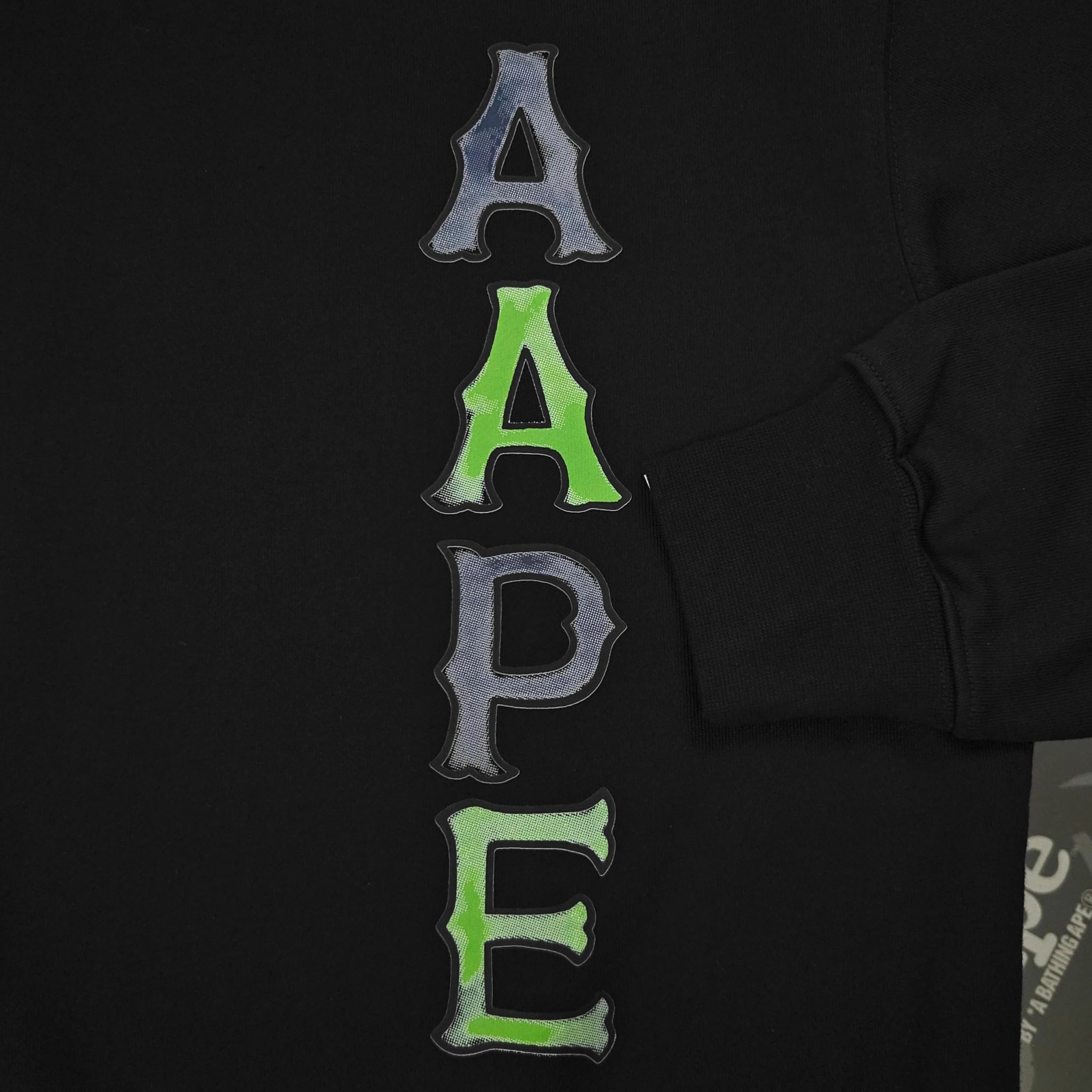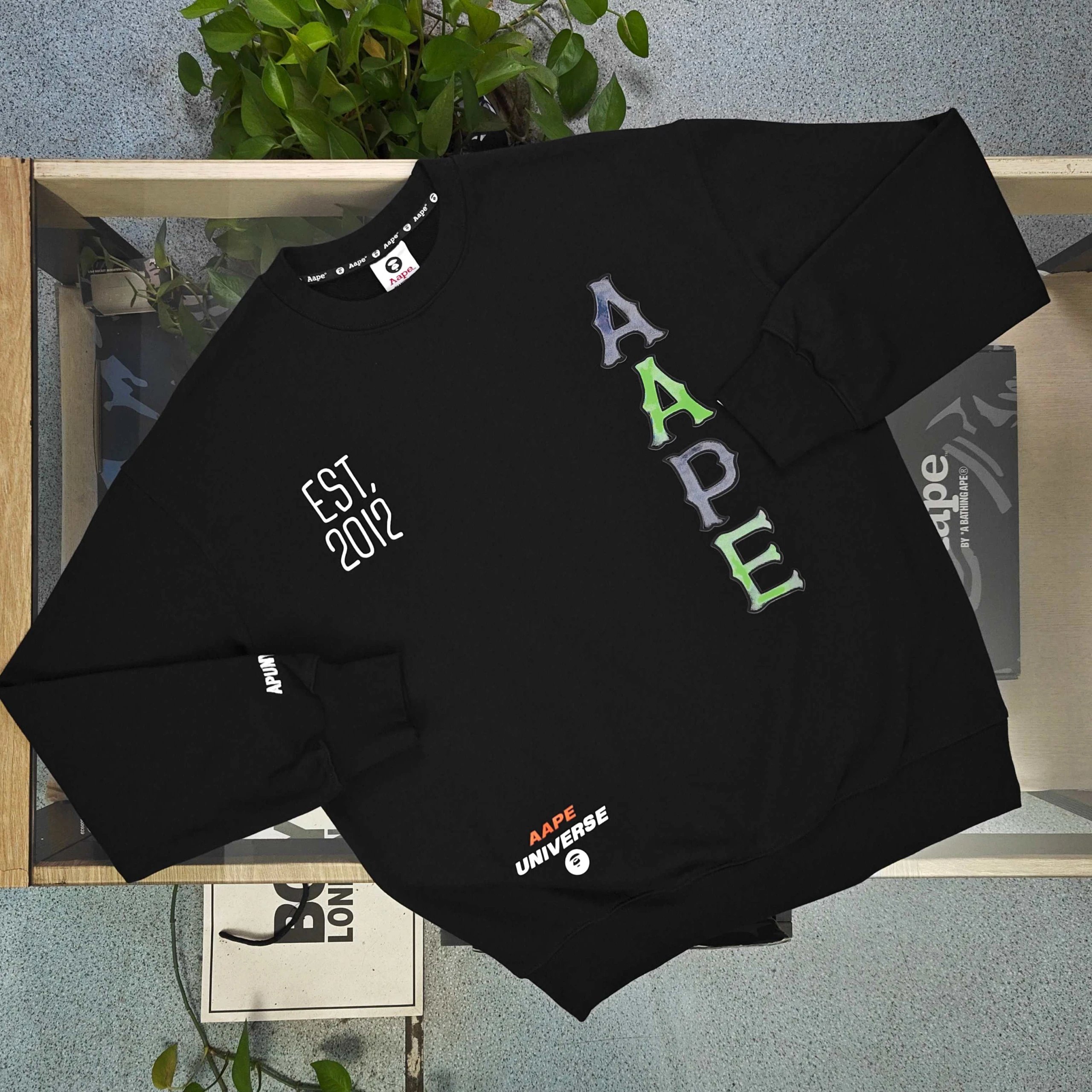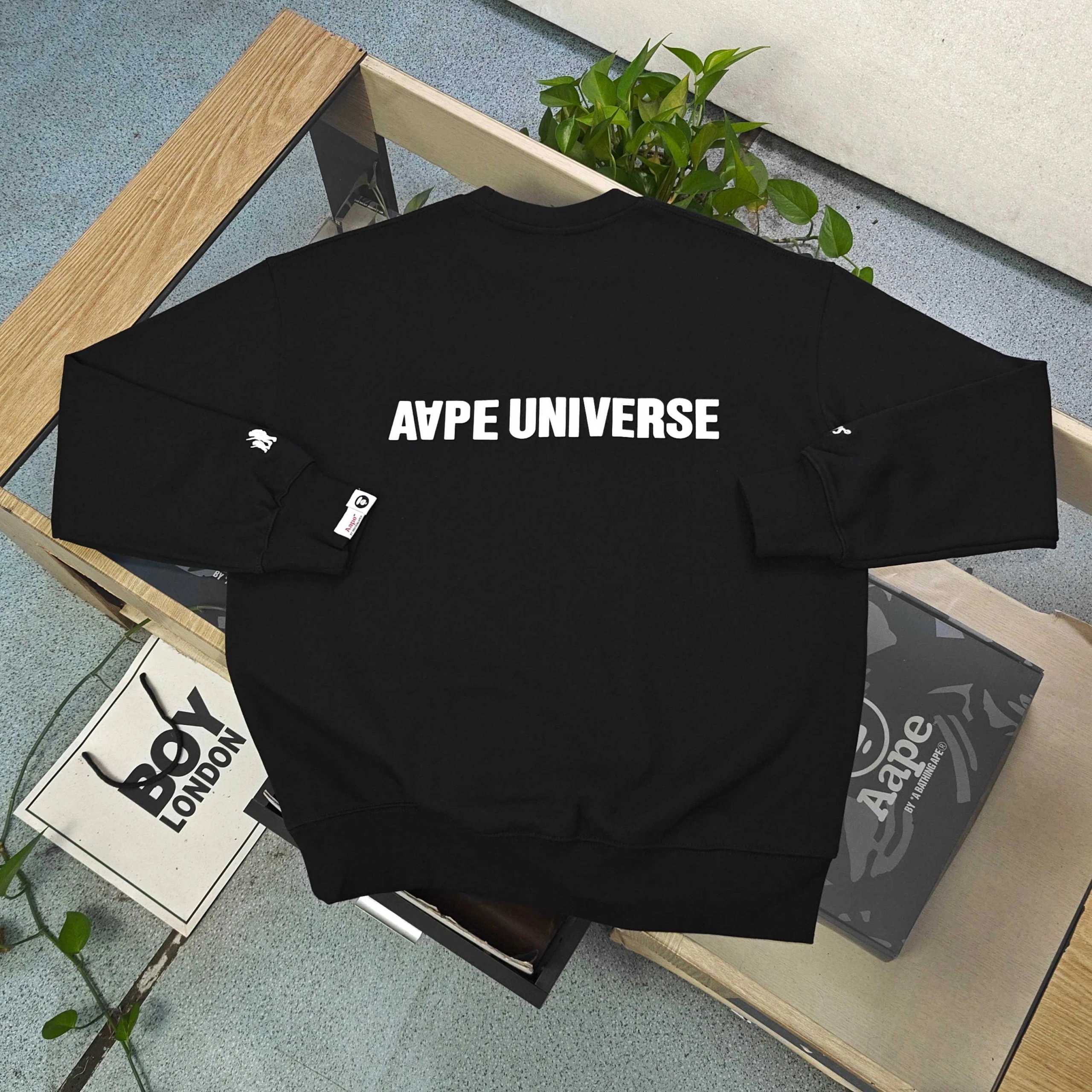 AAPE 2025 Fall Winter Black Cotton Fleece Crewneck Sweatshirt has classic ape logo, side letter print, 380g no-pilling cotton, eco-friendly print, unisex fit.