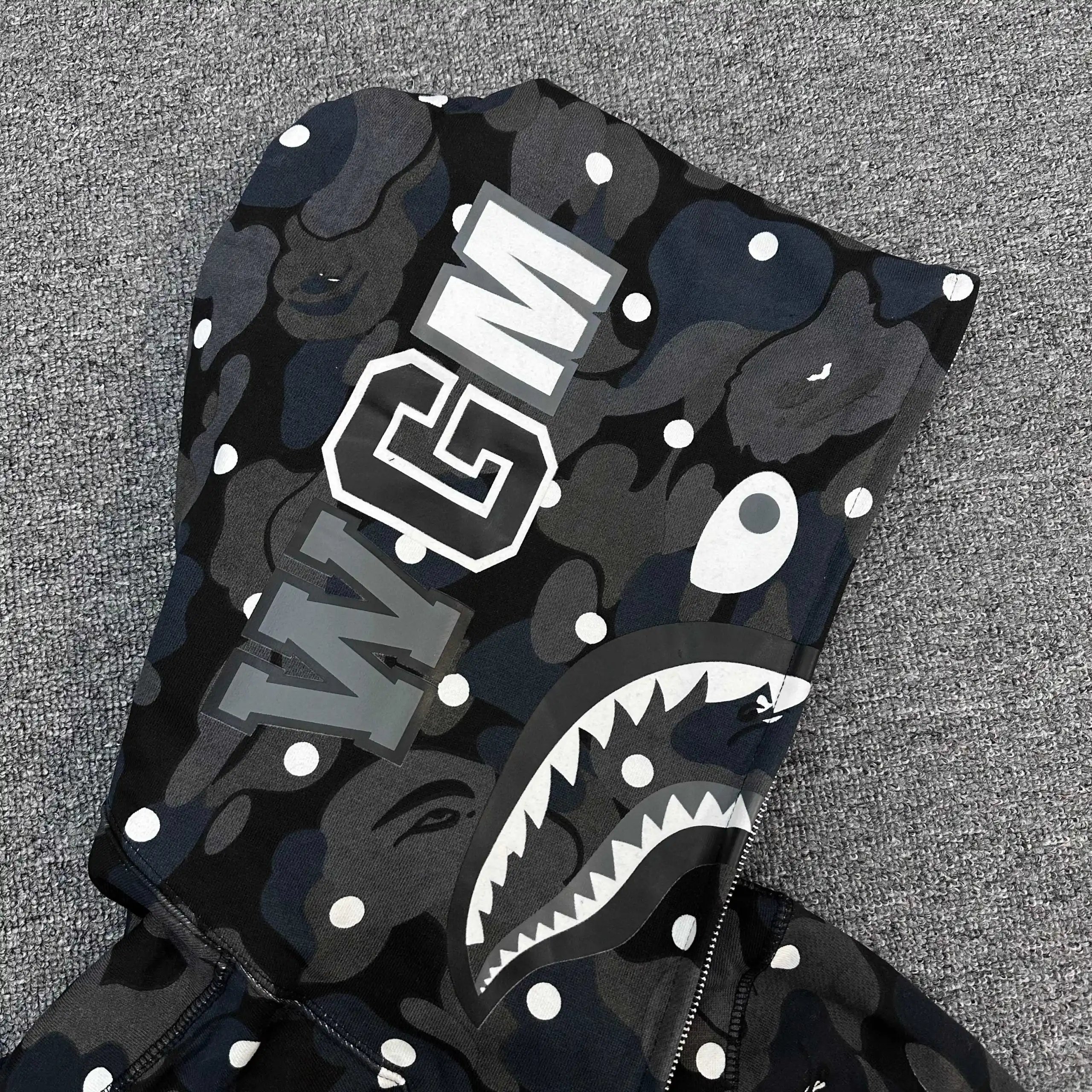 A BATHING APE FW25 Shark Camo Polka Dot Limited Hoodie features custom fabric, unisex fit, camouflage black gray color, and sizes S-M-L-XL-2XL.