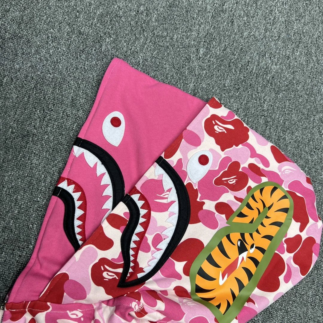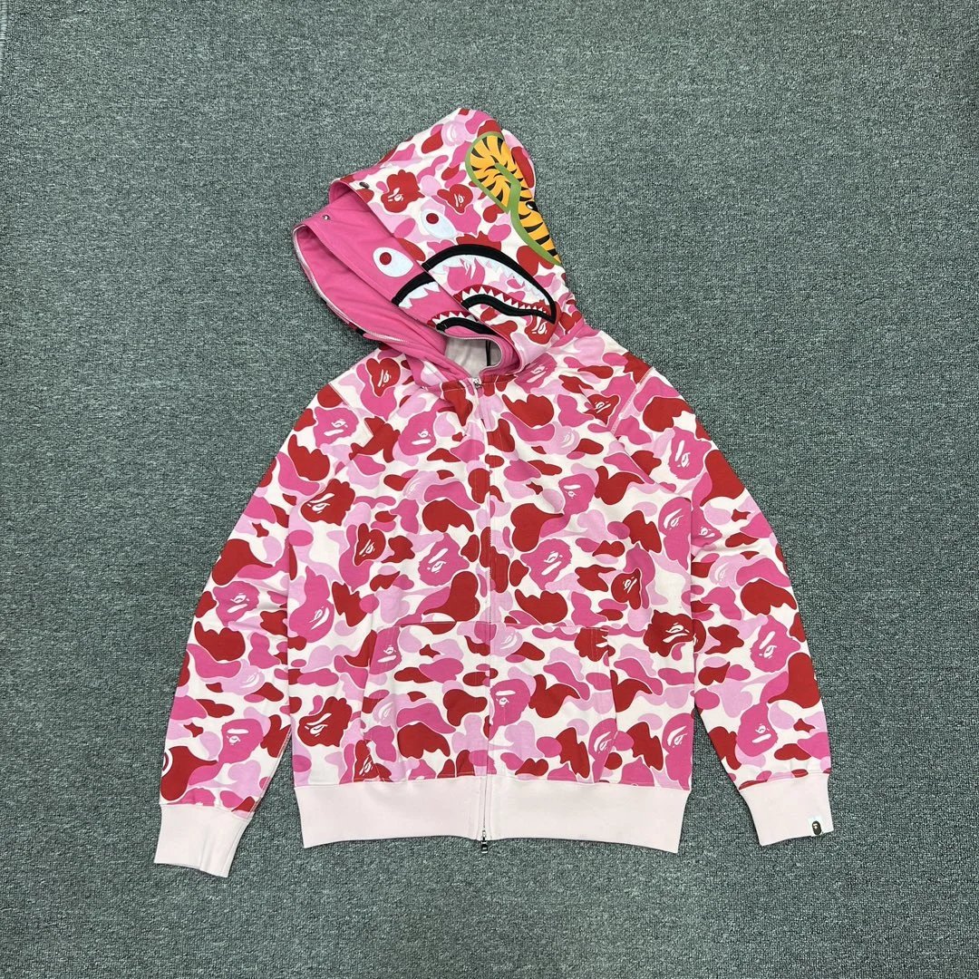 BAPE Abc Camo Shark Double Hoodies feature custom fabric, fine craftsmanship & high quality. Unisex style in Green, Pink, Blue, size 2XL.