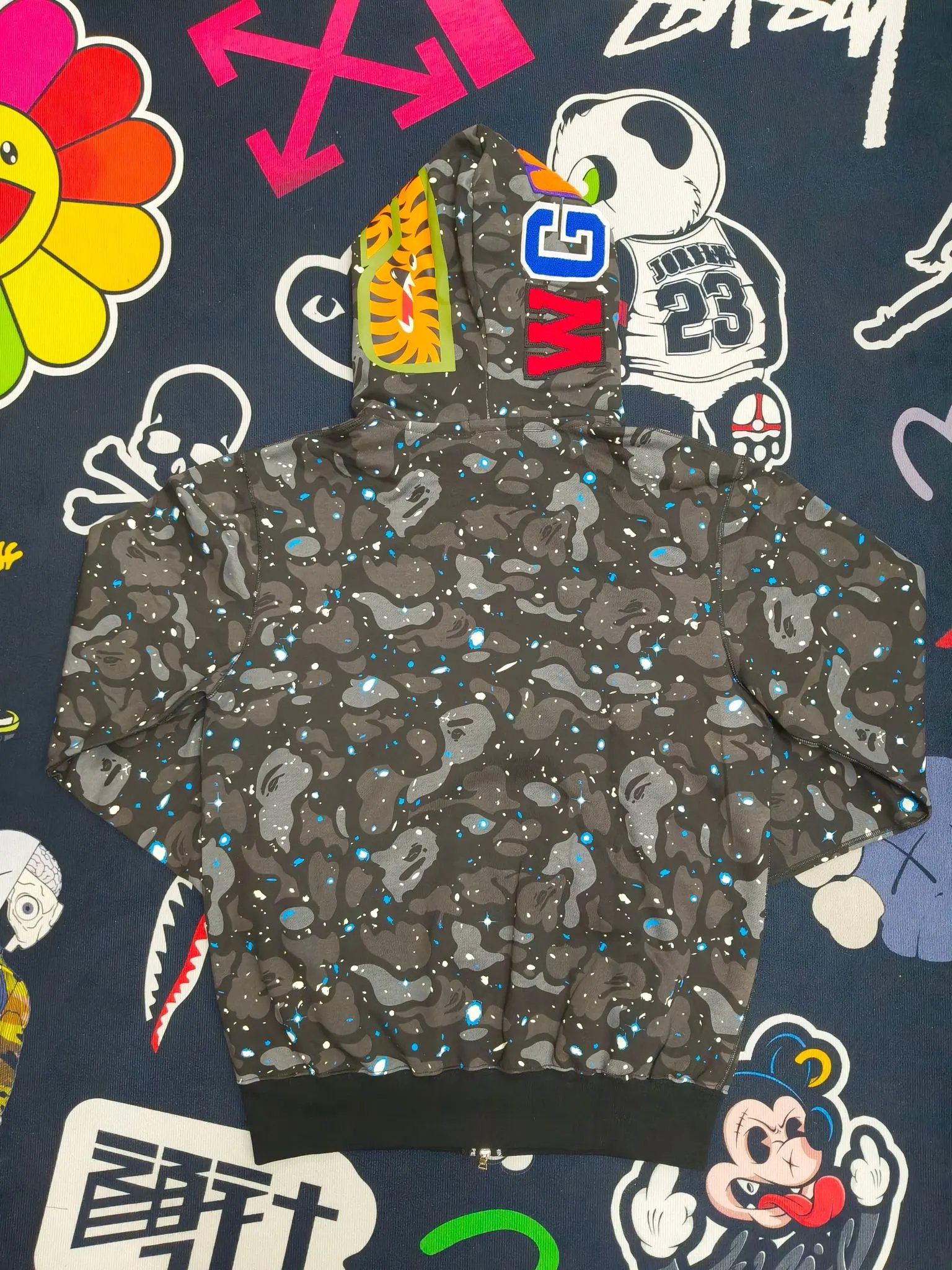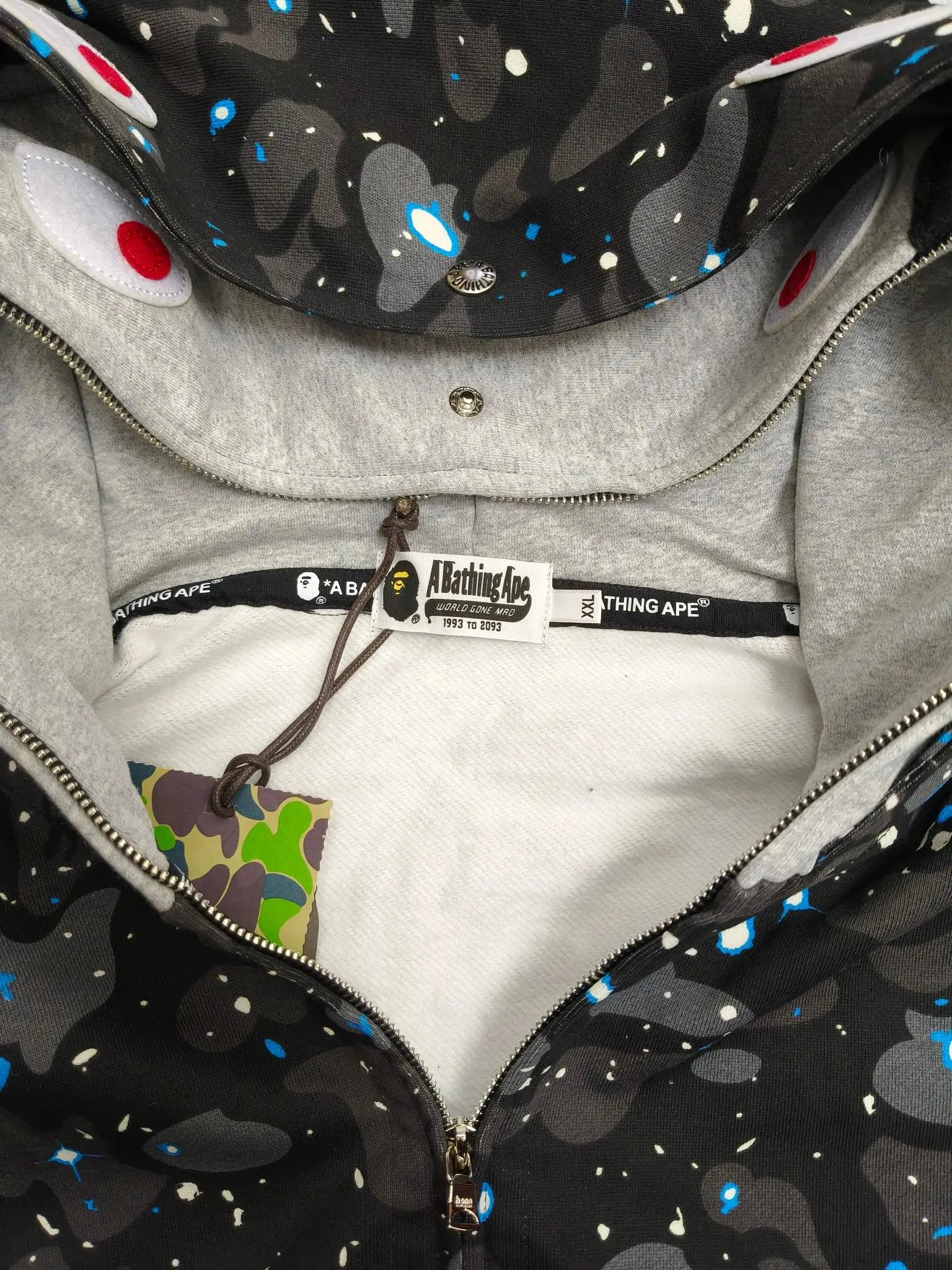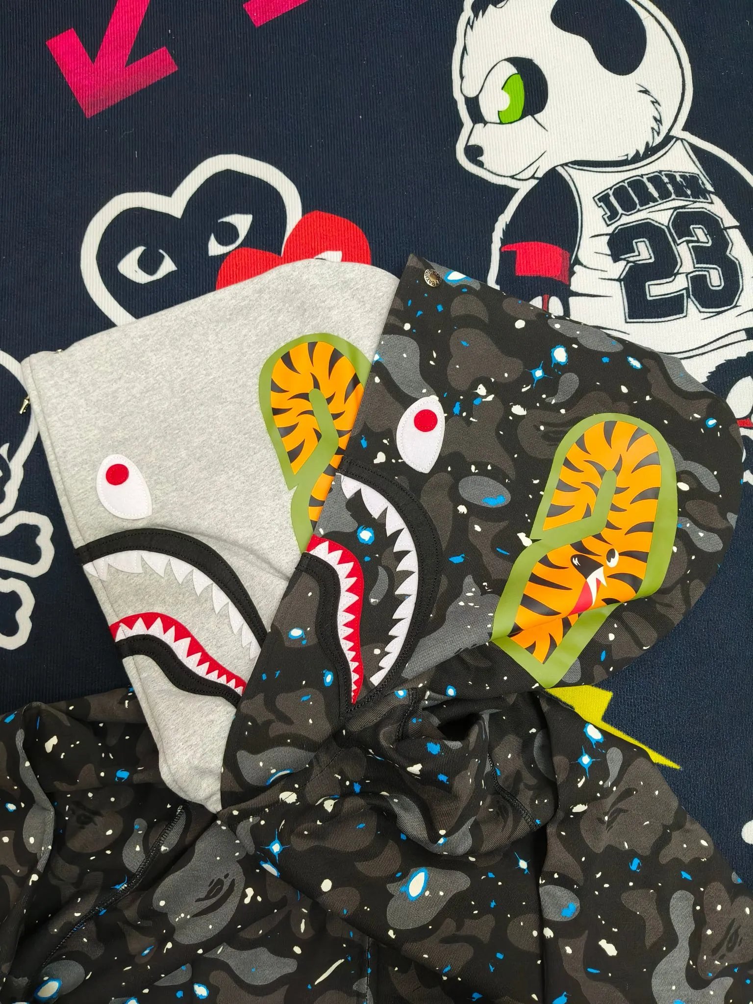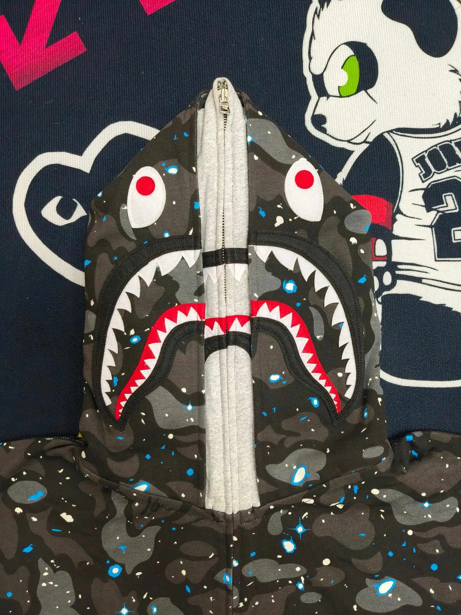 BAPE 21SS Space Camo Shark Hoodies feature glow-in-the-dark camo, double shark design, unisex fit for couples.