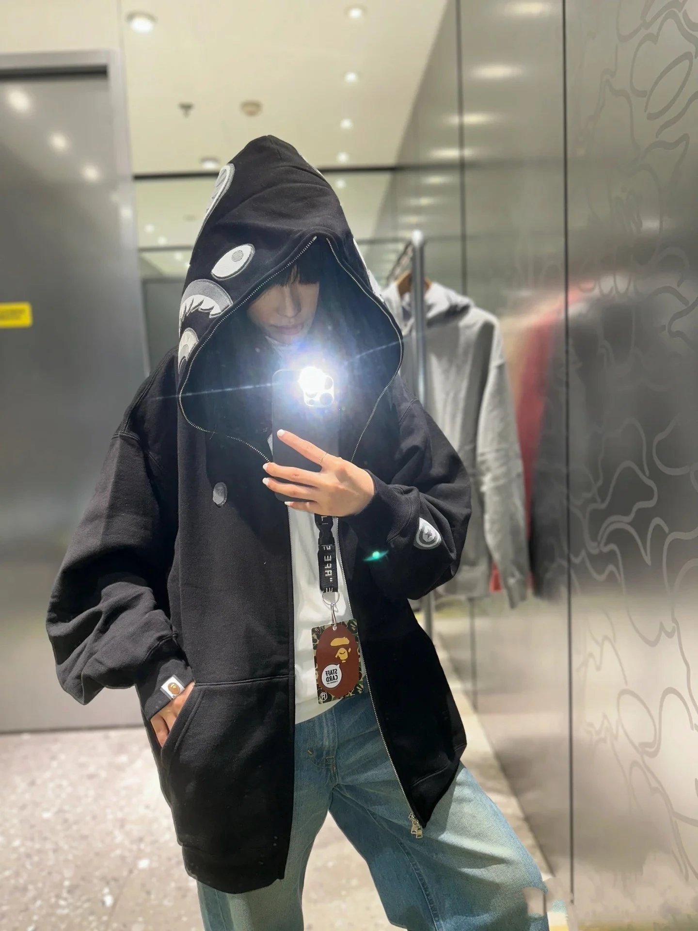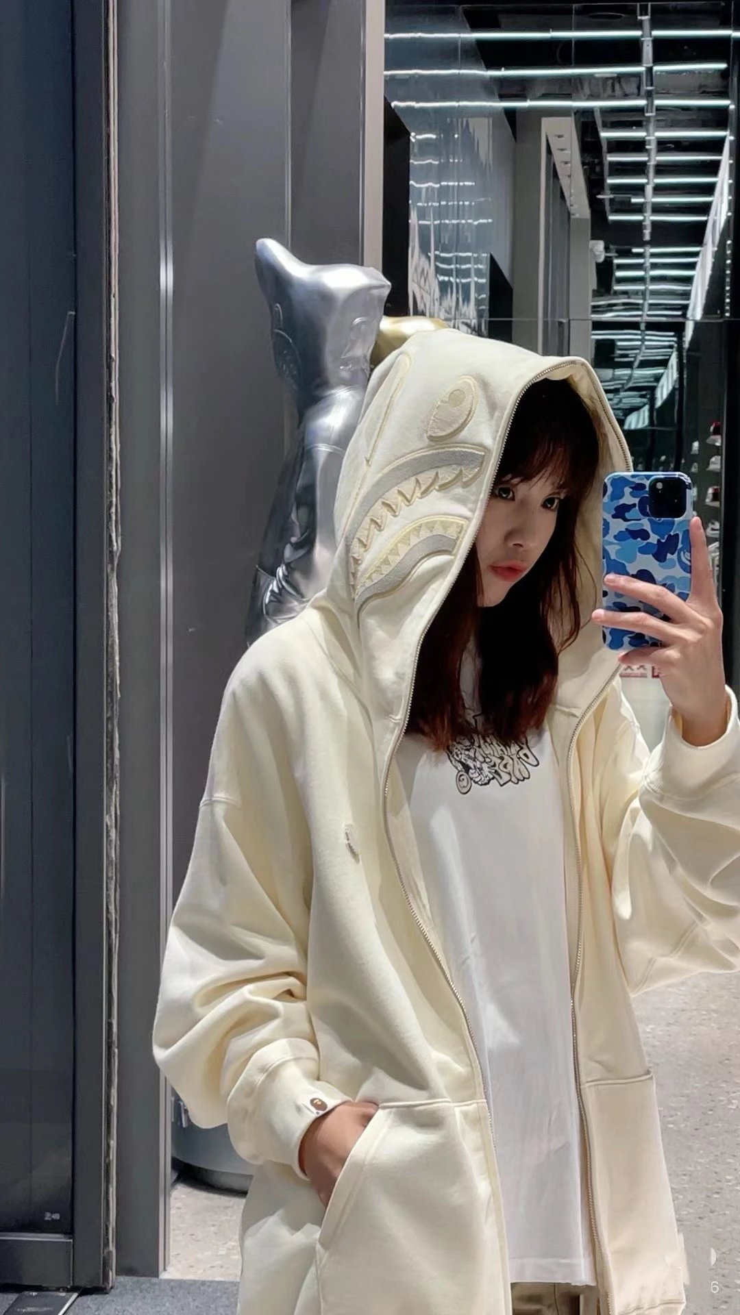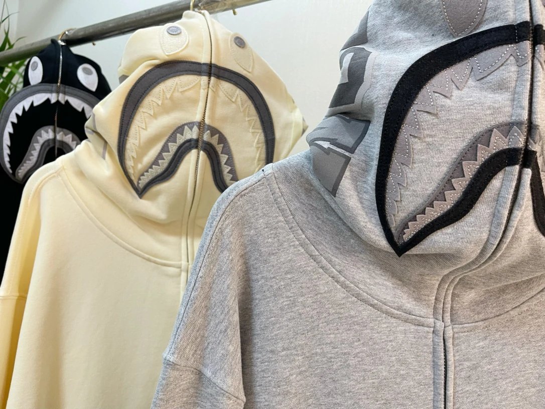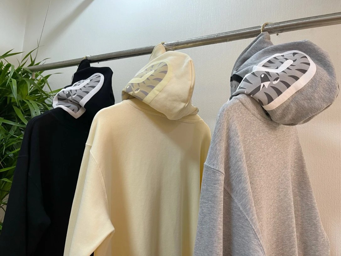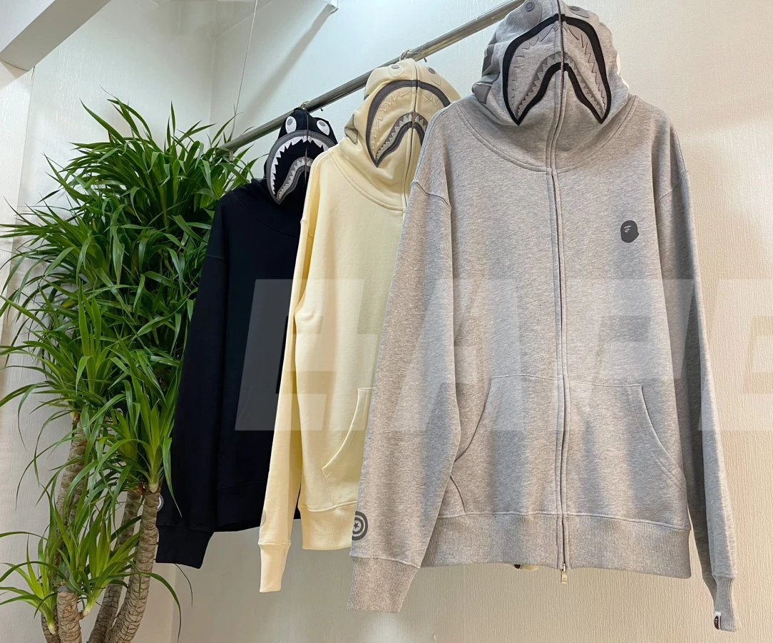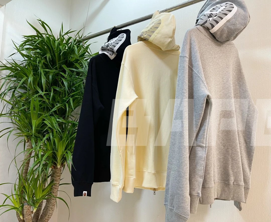 BAPE 2024ss Camo Shark Hoodies have classic shark mouth design, cotton material & 3 colors (off-white, heather gray, black).