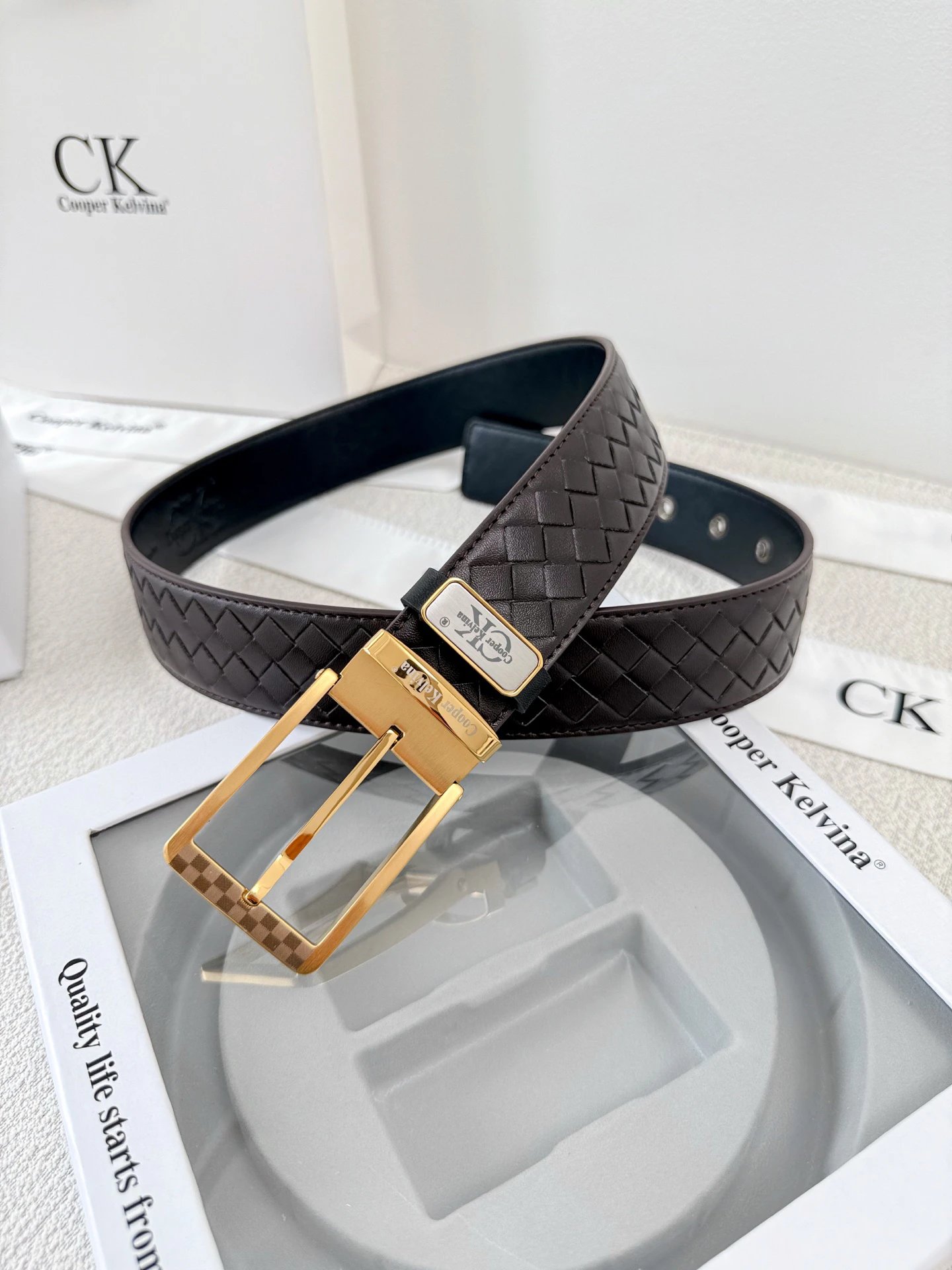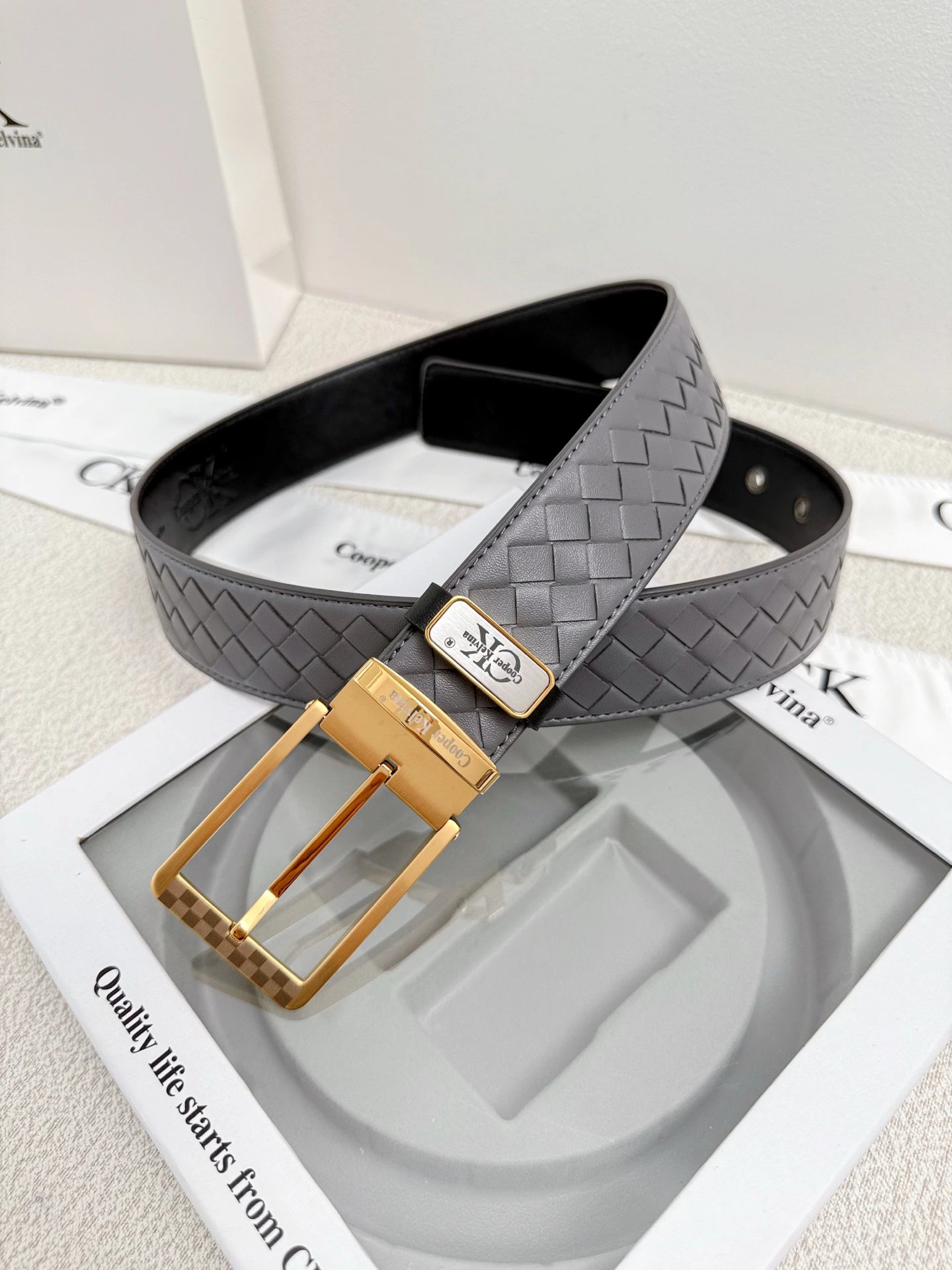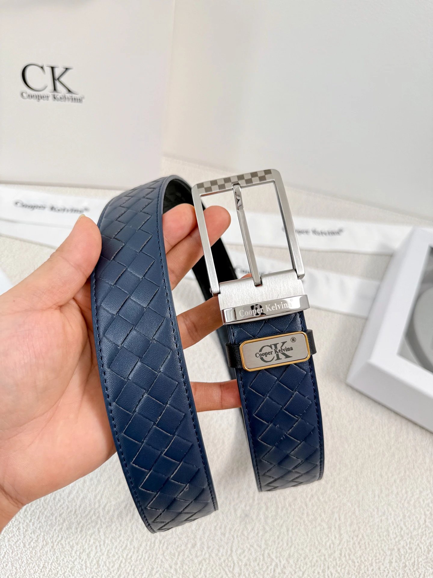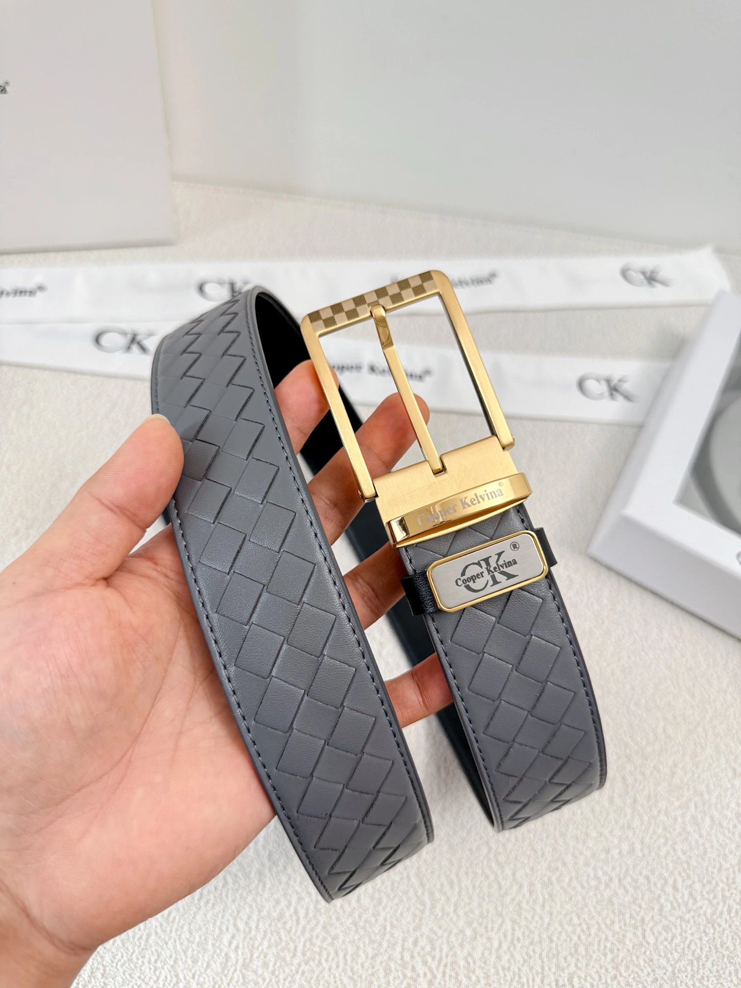Calvin Klein Full-Grain Leather Belt has original quality, 24K steel buckle, vacuum plating (no fade), reversible (black/blue/brown/gray).