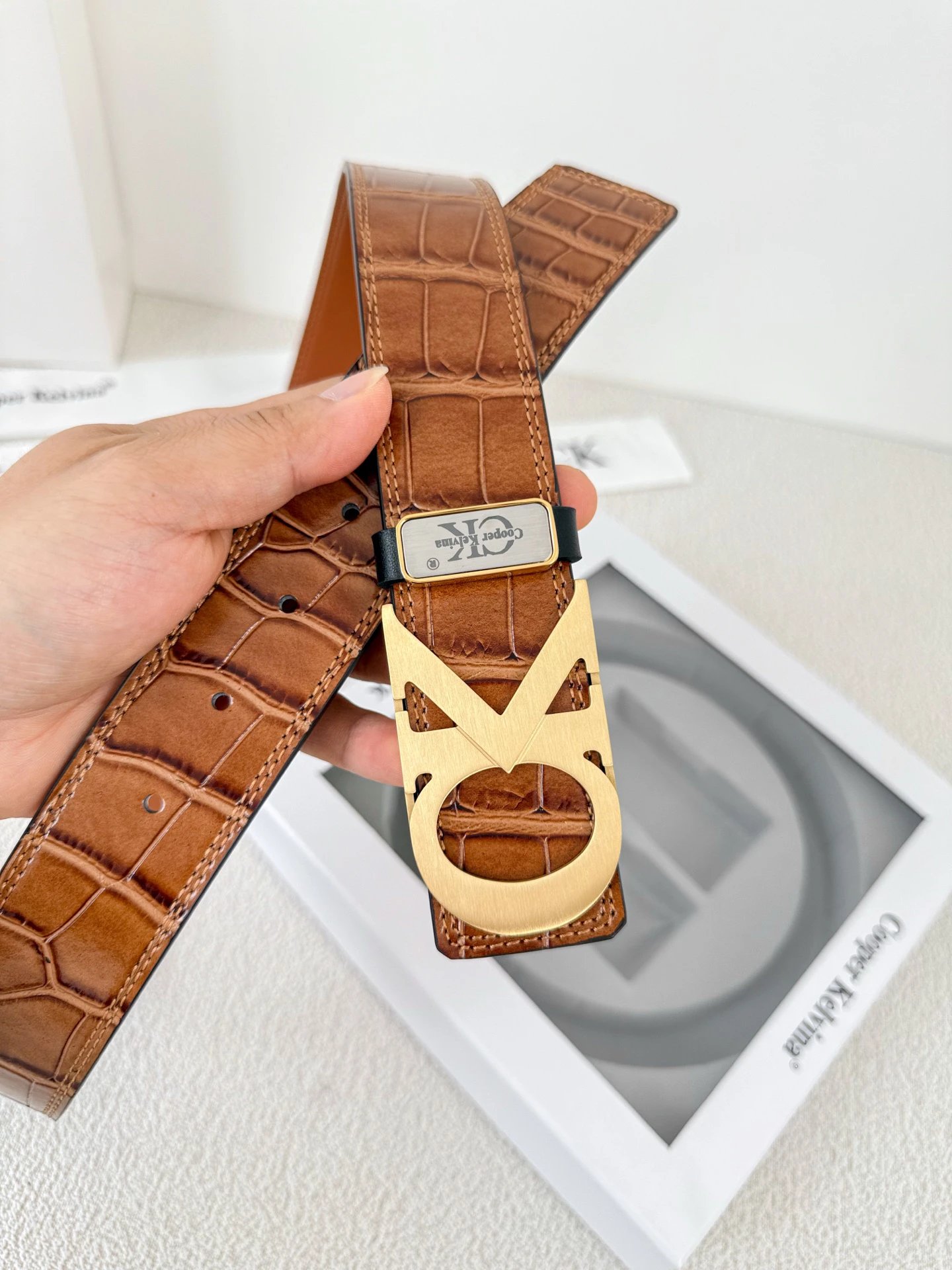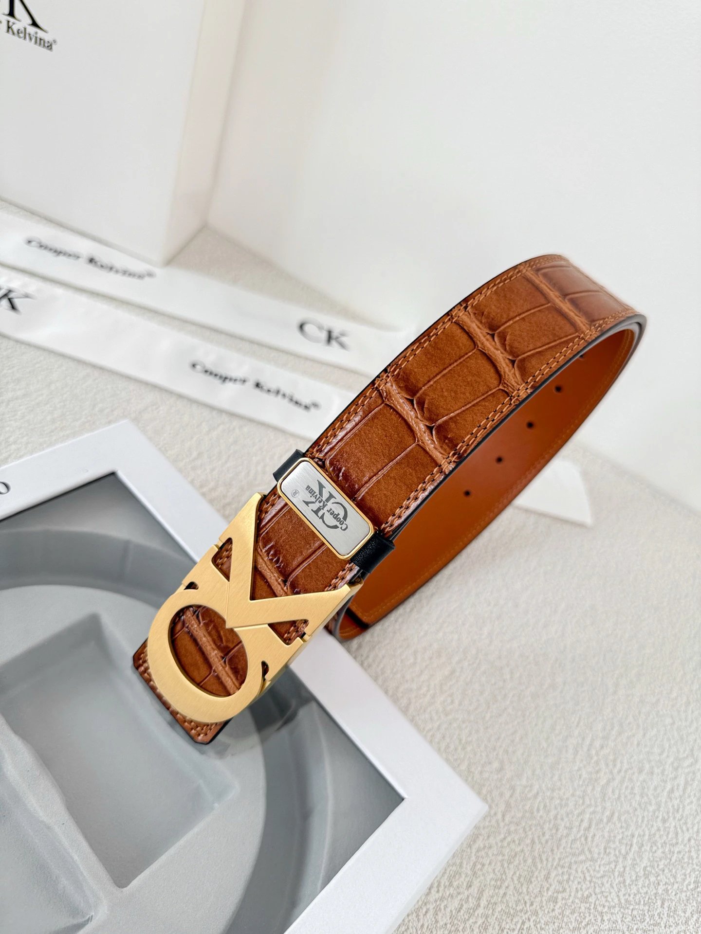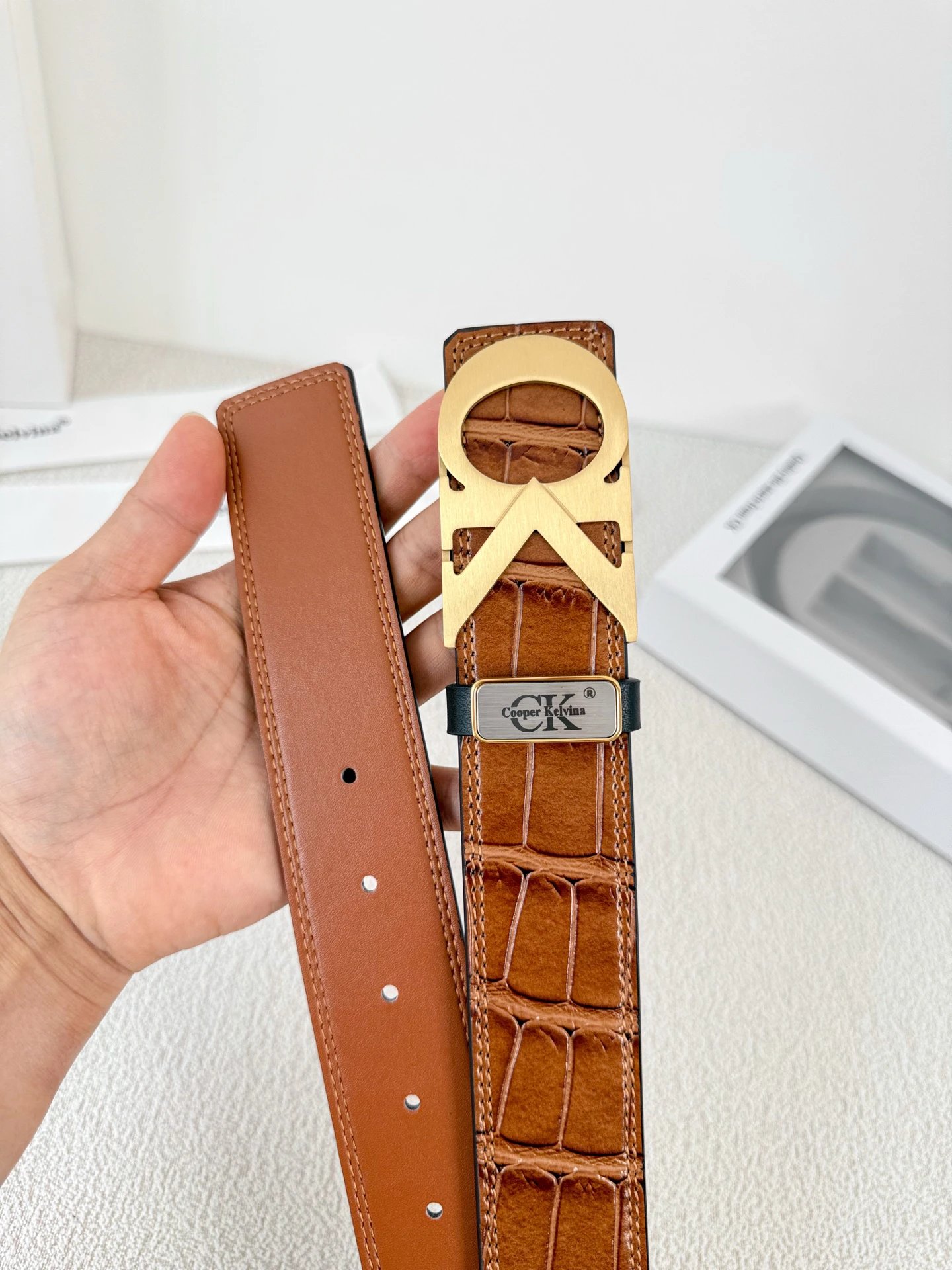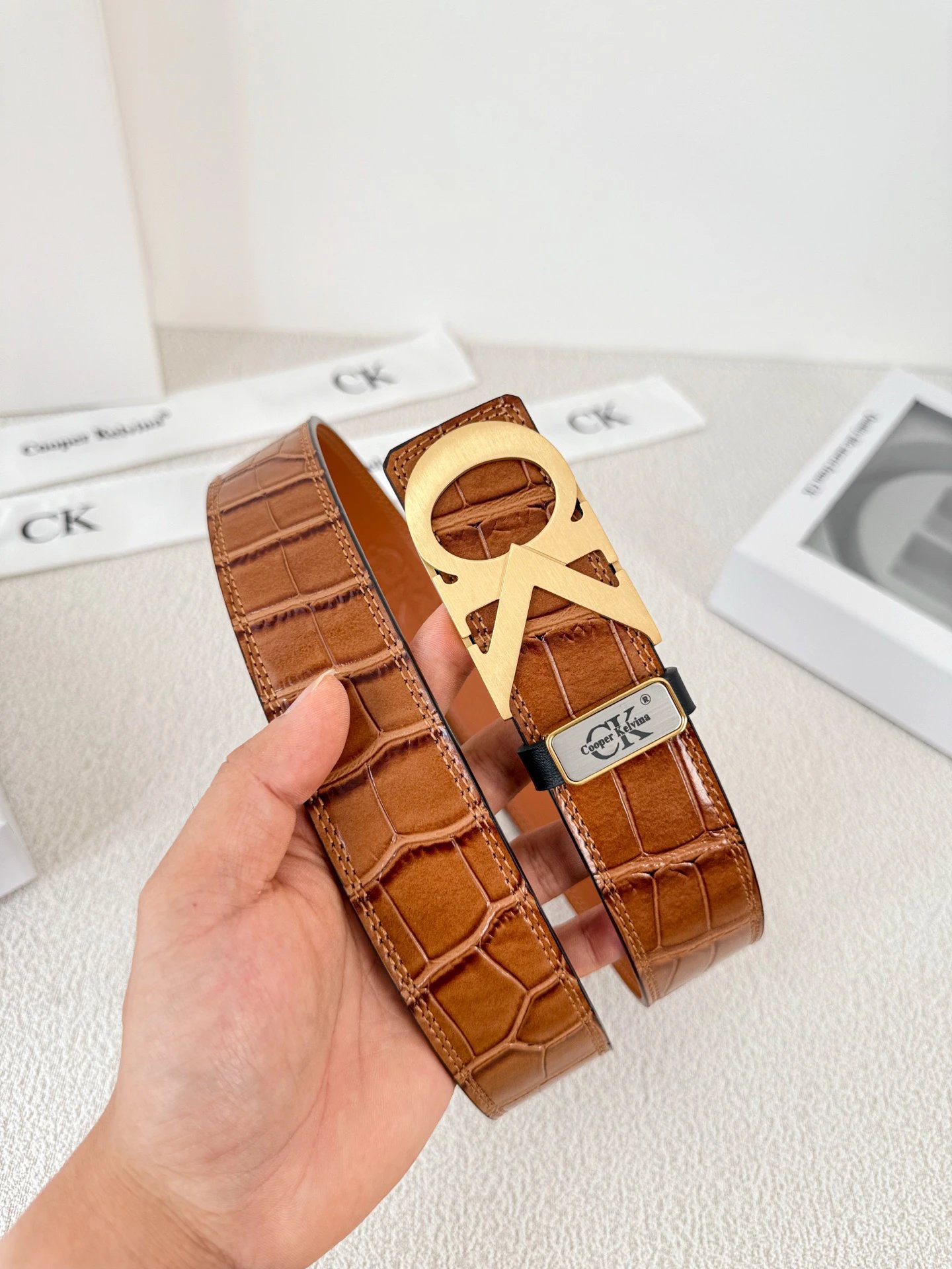 Calvin Klein Top Grain Leather Belt: CooperKeina authentic quality, 100% imported original top grain leather, inner tail design, genuine leather with letter logo automatic buckle, vacuum plated 24K steel buckle (no fading), double-sided (black, blue, brown, gray), complete certificates, luxury brand for gifting or personal use.