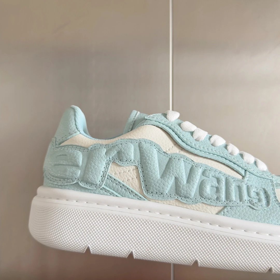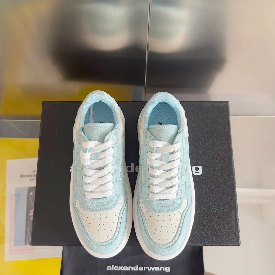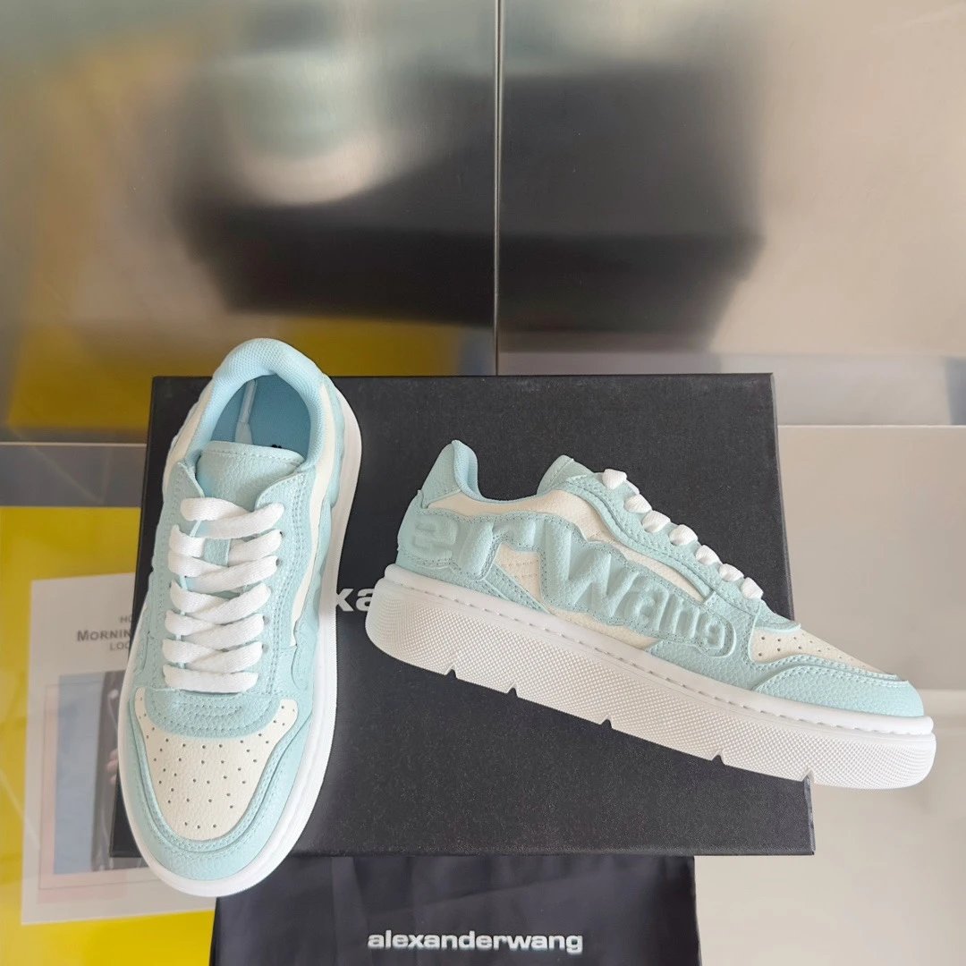 Alexander Wang latest couple white sneakers with embossed logo & thick sole.