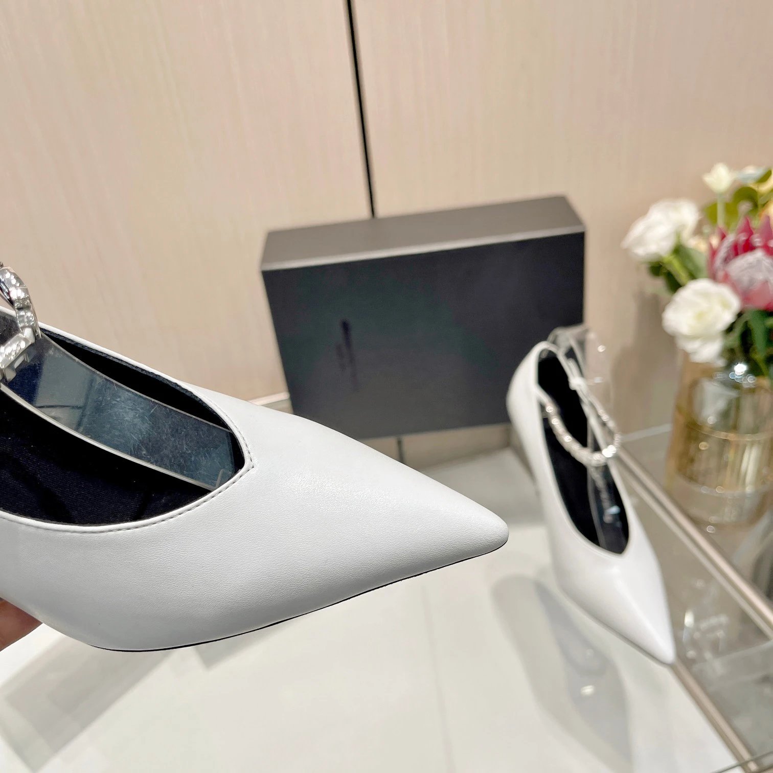 10cm heel, pointed toe, rhinestone buckle, massaging insole & Italian leather sole.