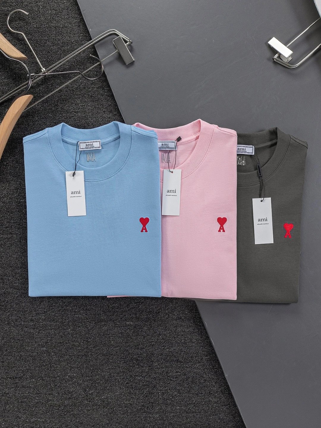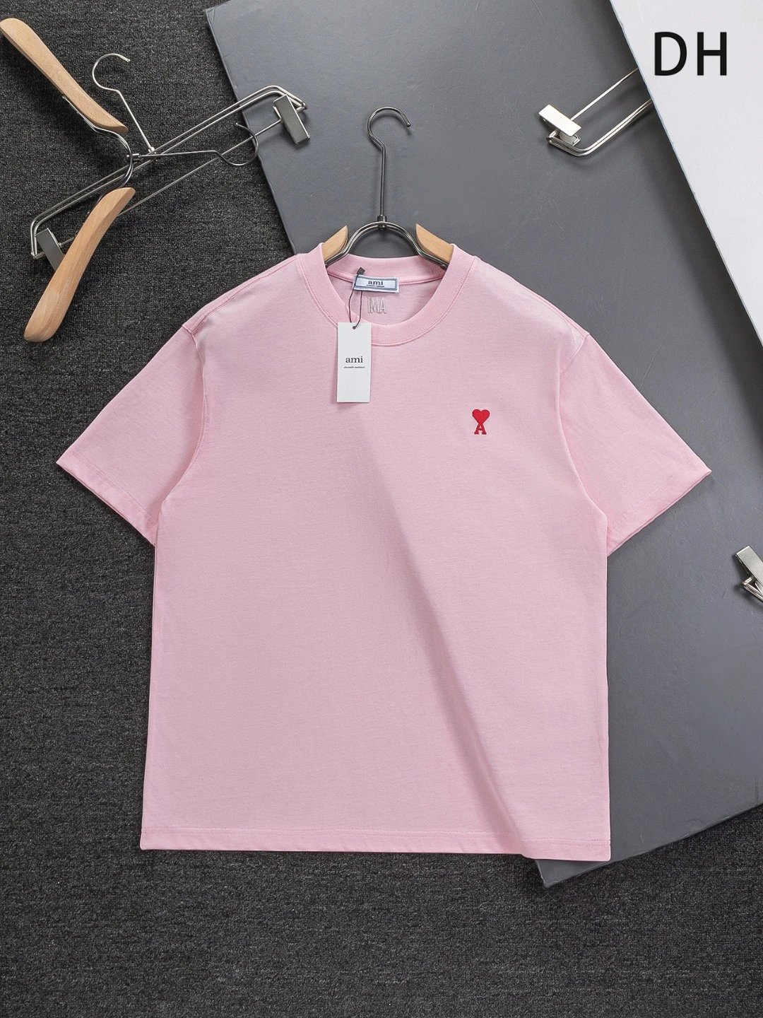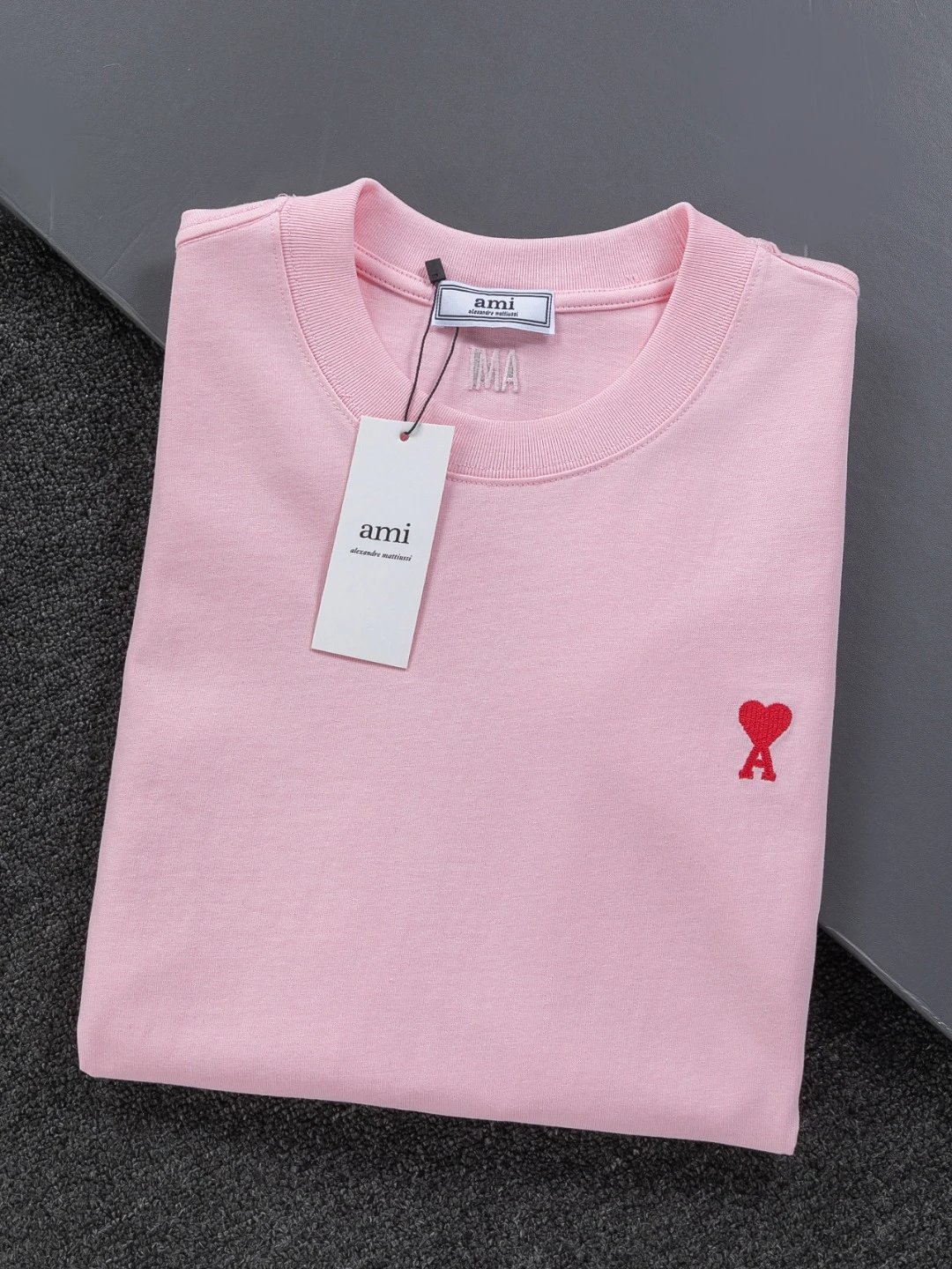AMI Paris Heart Embroidery Cotton T-Shirt is unisex, available in S/M/L/XL. 320g washed cotton, round neck, short sleeves. Colors: Black, White, Gray, Blue, Pink.