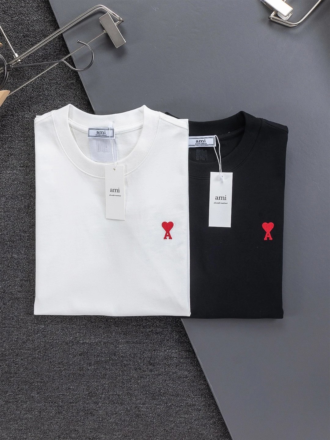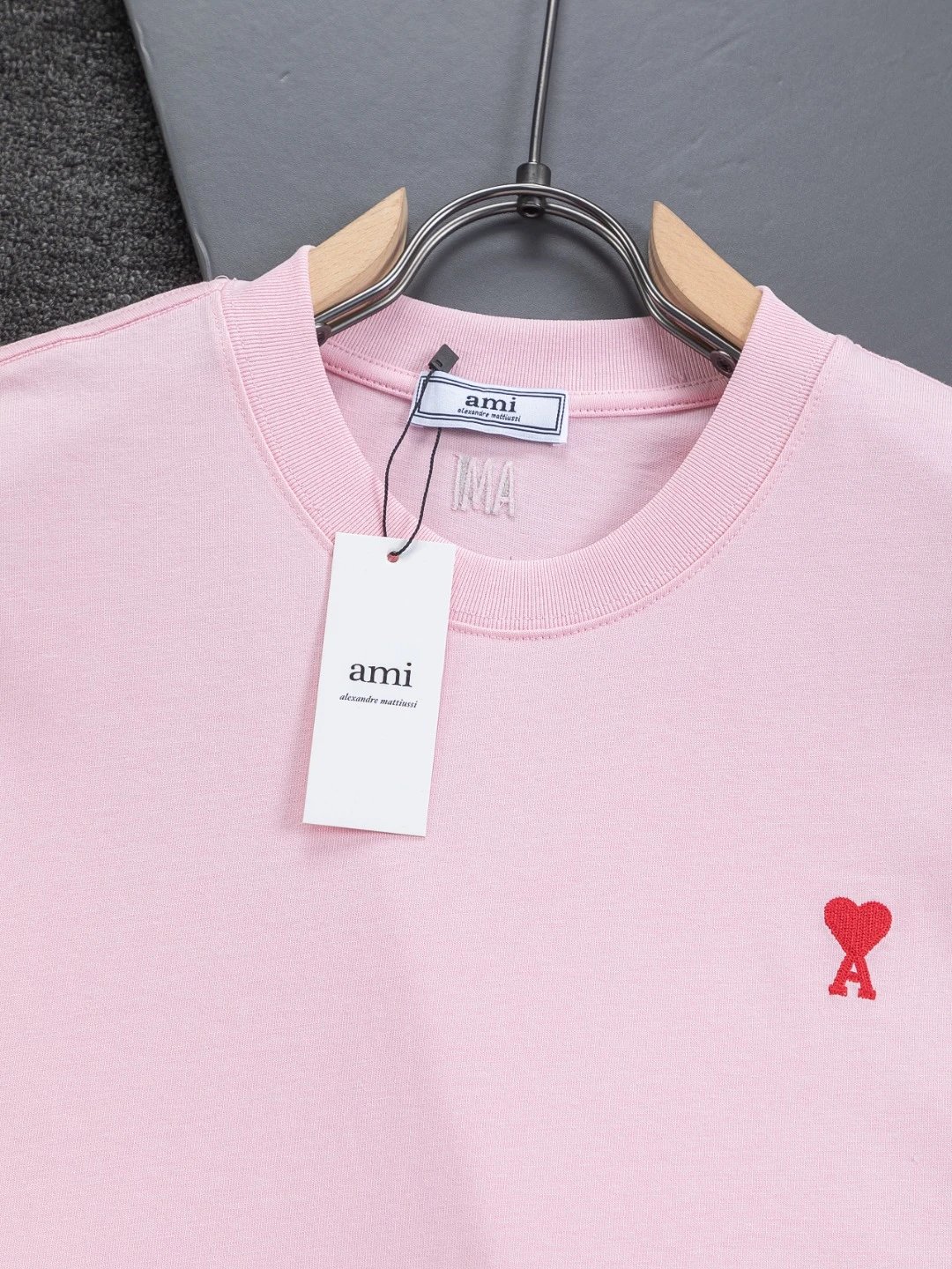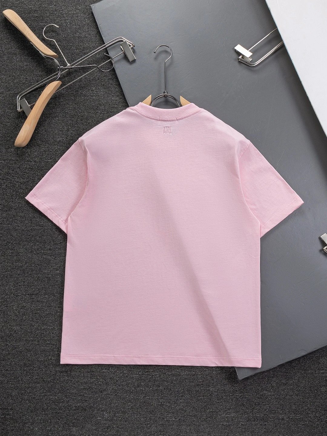 AMI Paris Heart Embroidery Cotton T-Shirt is unisex, available in S/M/L/XL. 320g washed cotton, round neck, short sleeves. Colors: Black, White, Gray, Blue, Pink.
