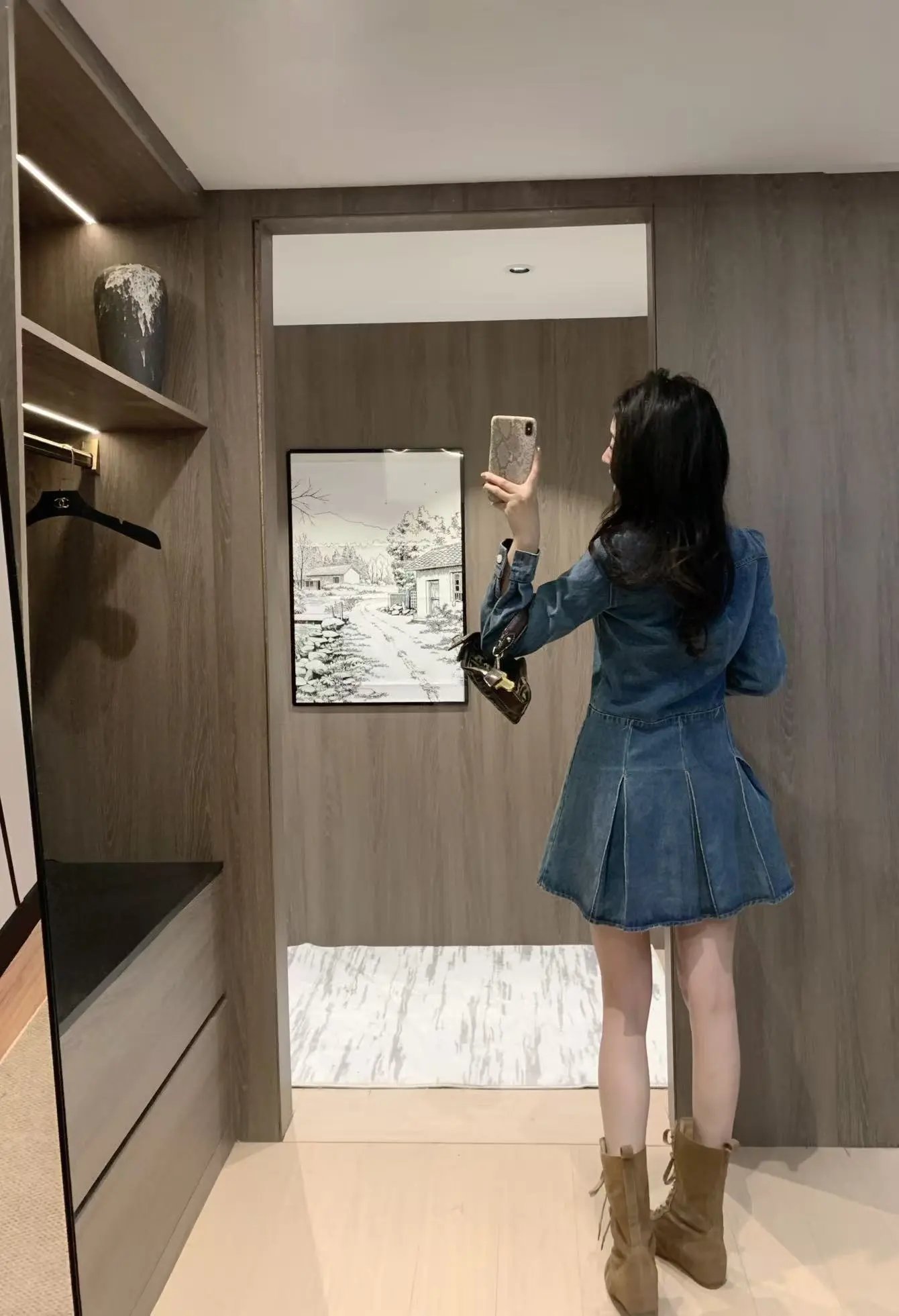 AMI Spring New Denim Dress blends French retro and sweet-cool style perfectly. Iconic heart embroidery on chest patch pocket, velvet contrast collar, shirt-style placket & waist-cinched pleated skirt.