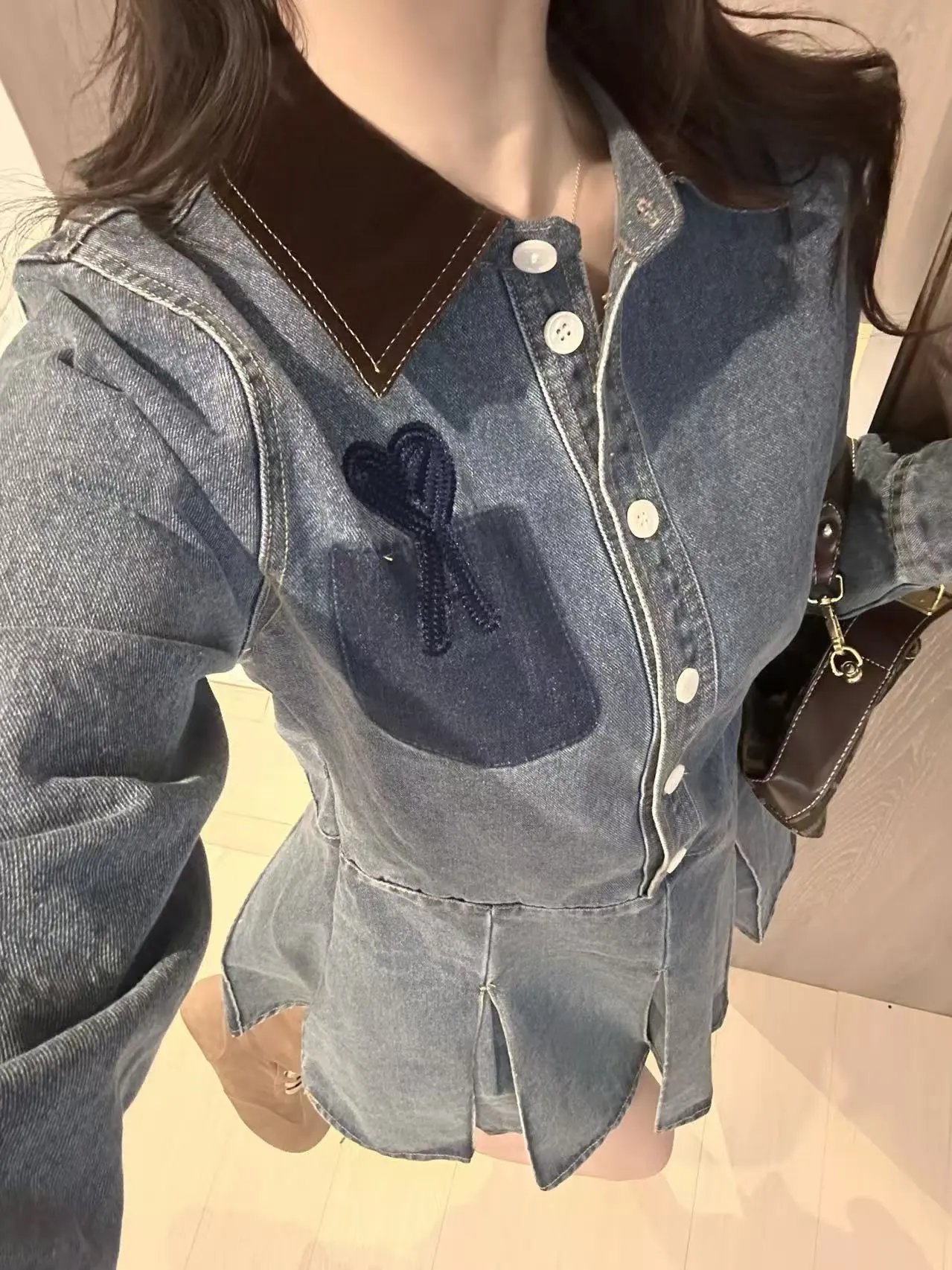 AMI French Retro Denim Dress Heart Embroidery Shirt Style