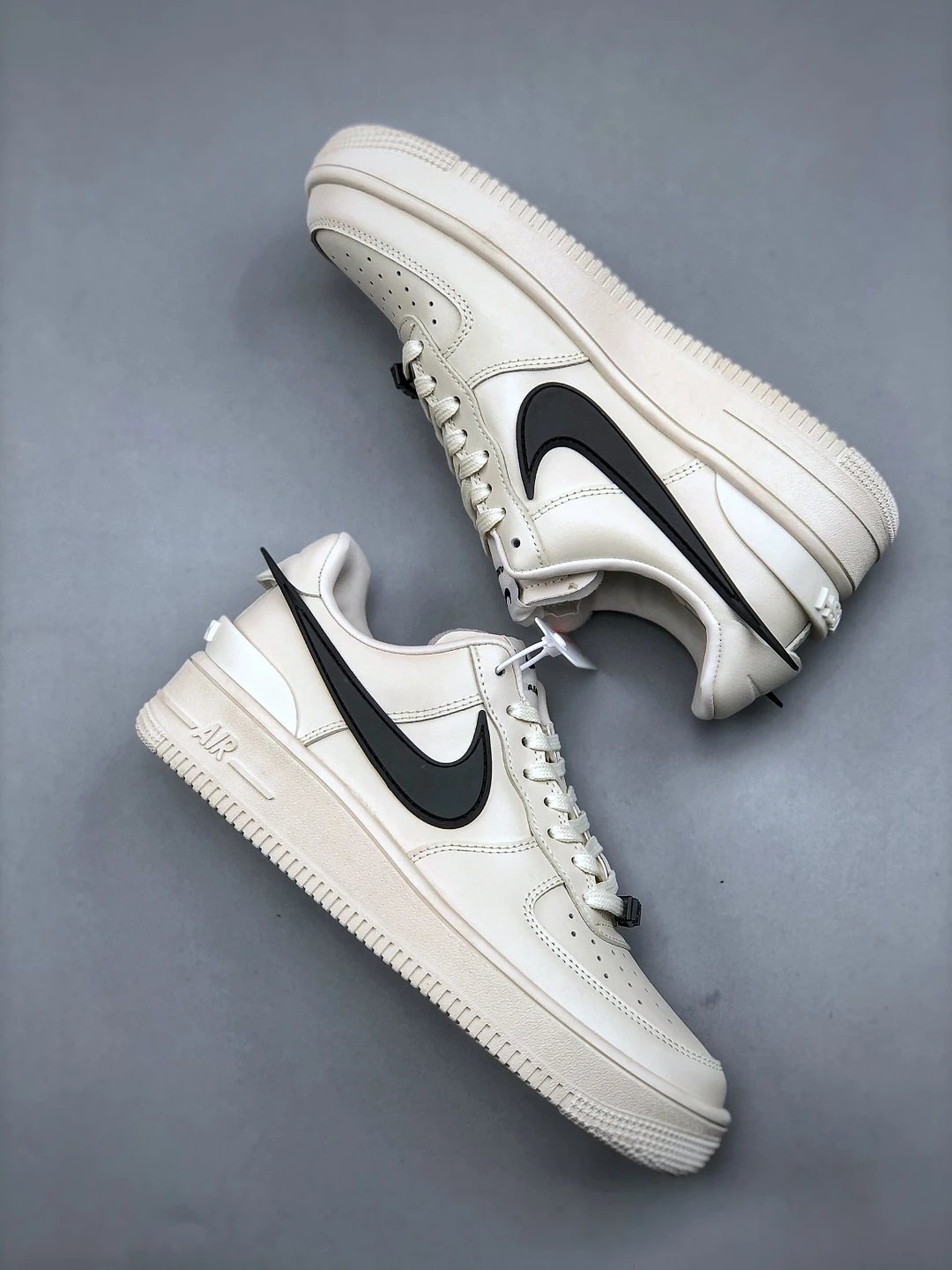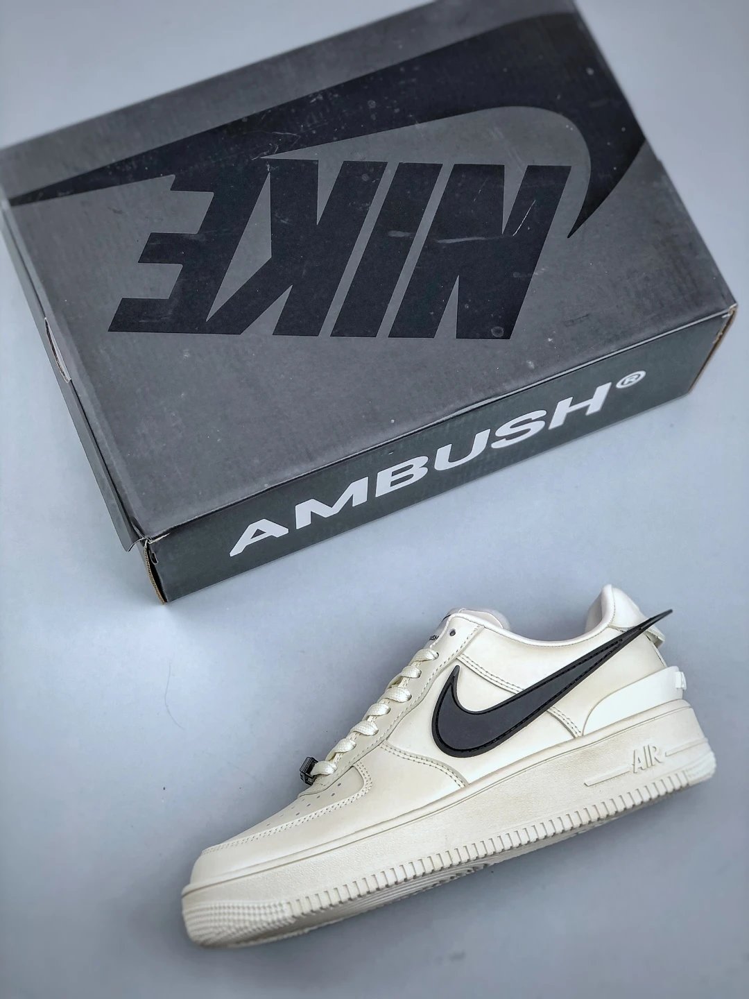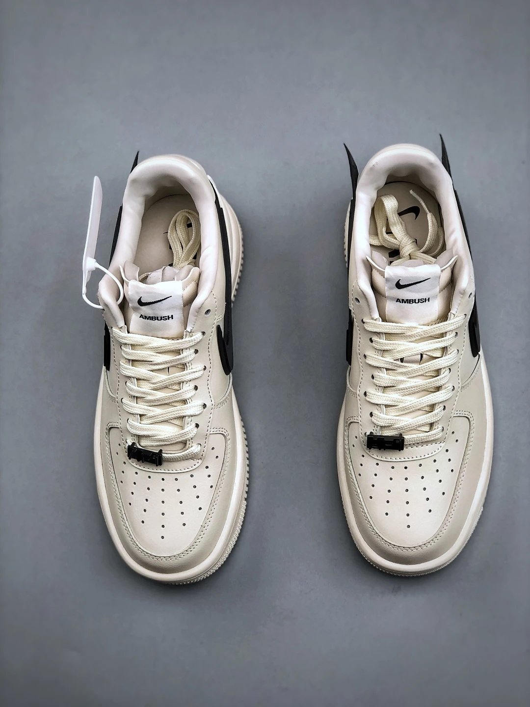 AMBUSH x Nike Air Force 1 Low sneakers feature leather construction, oversized Swoosh, AMBUSH logo details, and 3D "AF1" lace dubrae. Available sizes: 36-46.