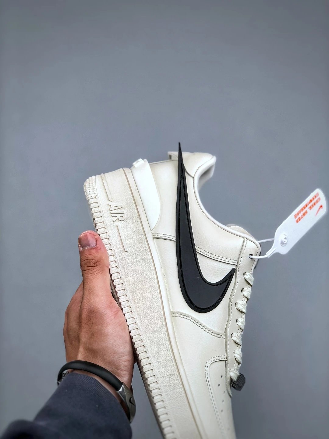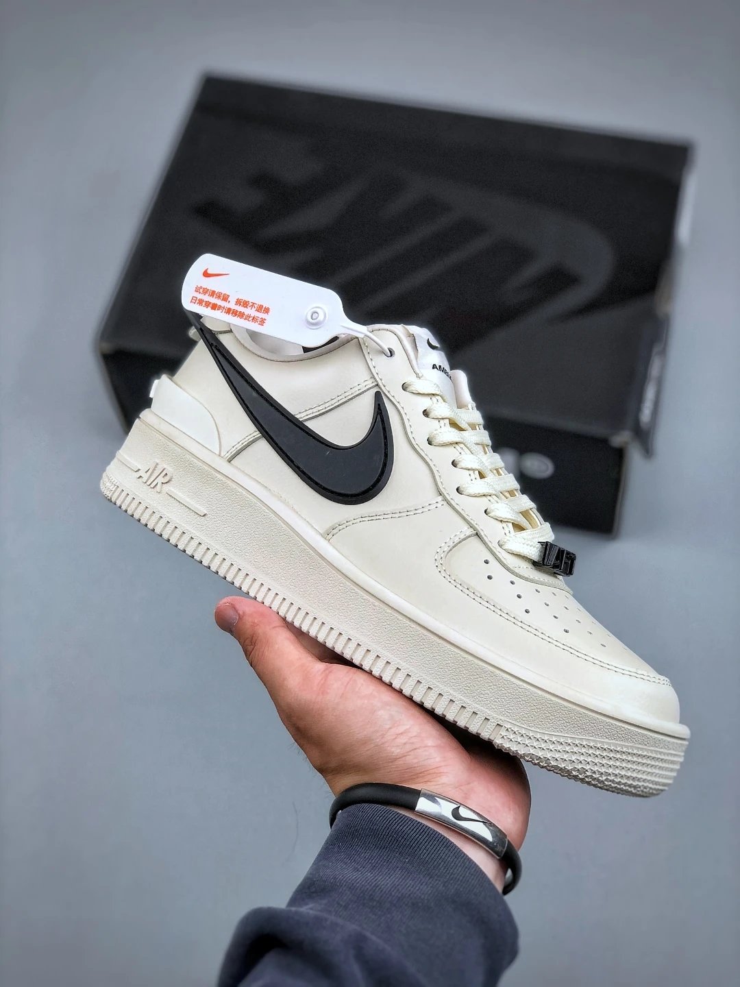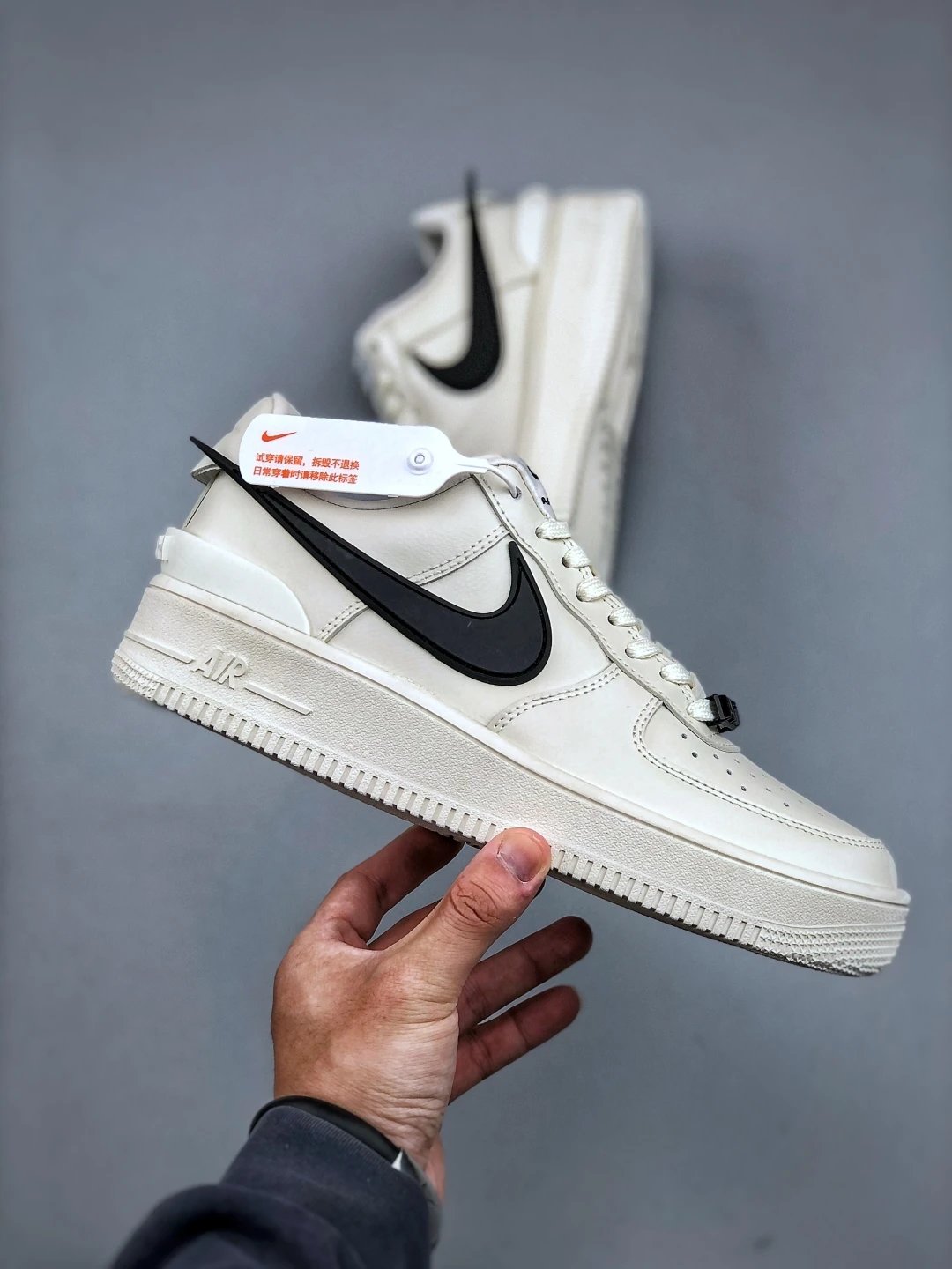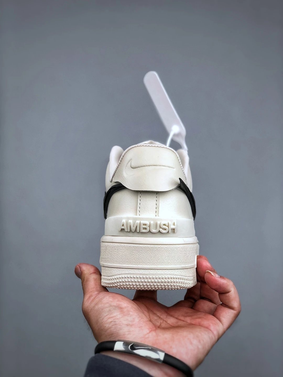 AMBUSH x Nike Air Force 1 Low sneakers feature leather construction, oversized Swoosh, AMBUSH logo details, and 3D "AF1" lace dubrae. Available sizes: 36-46.