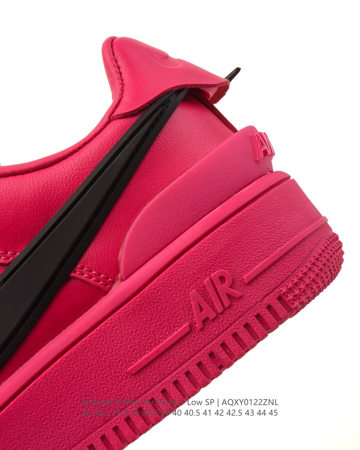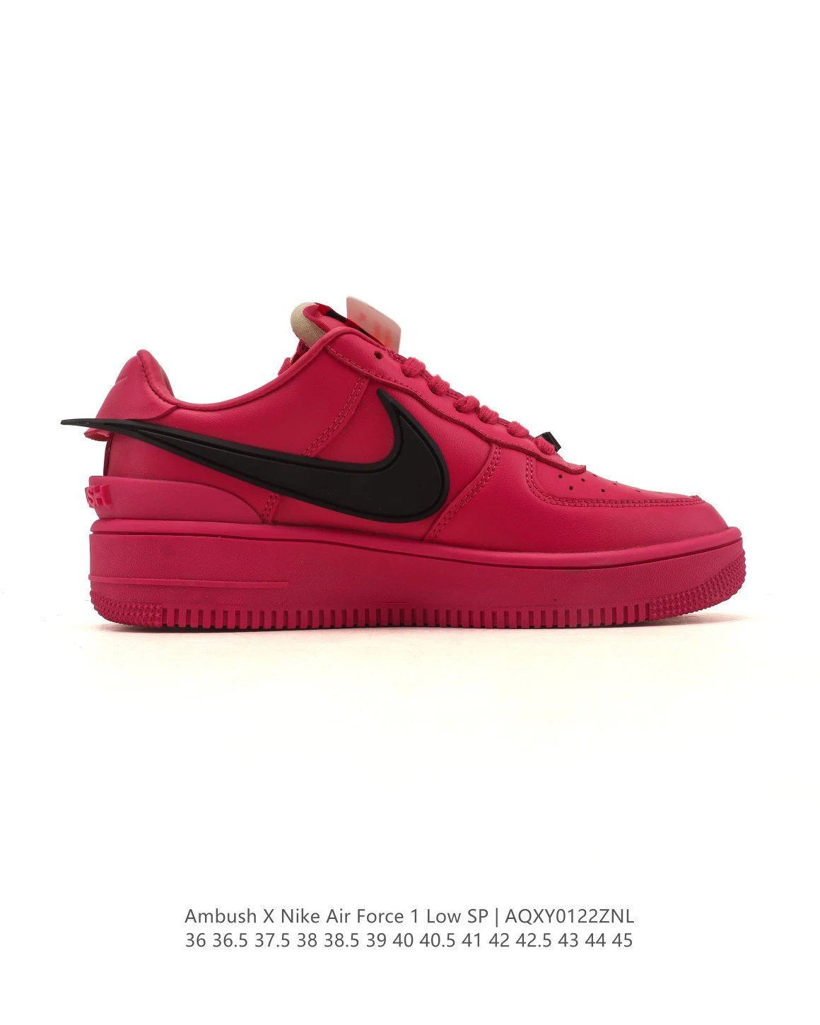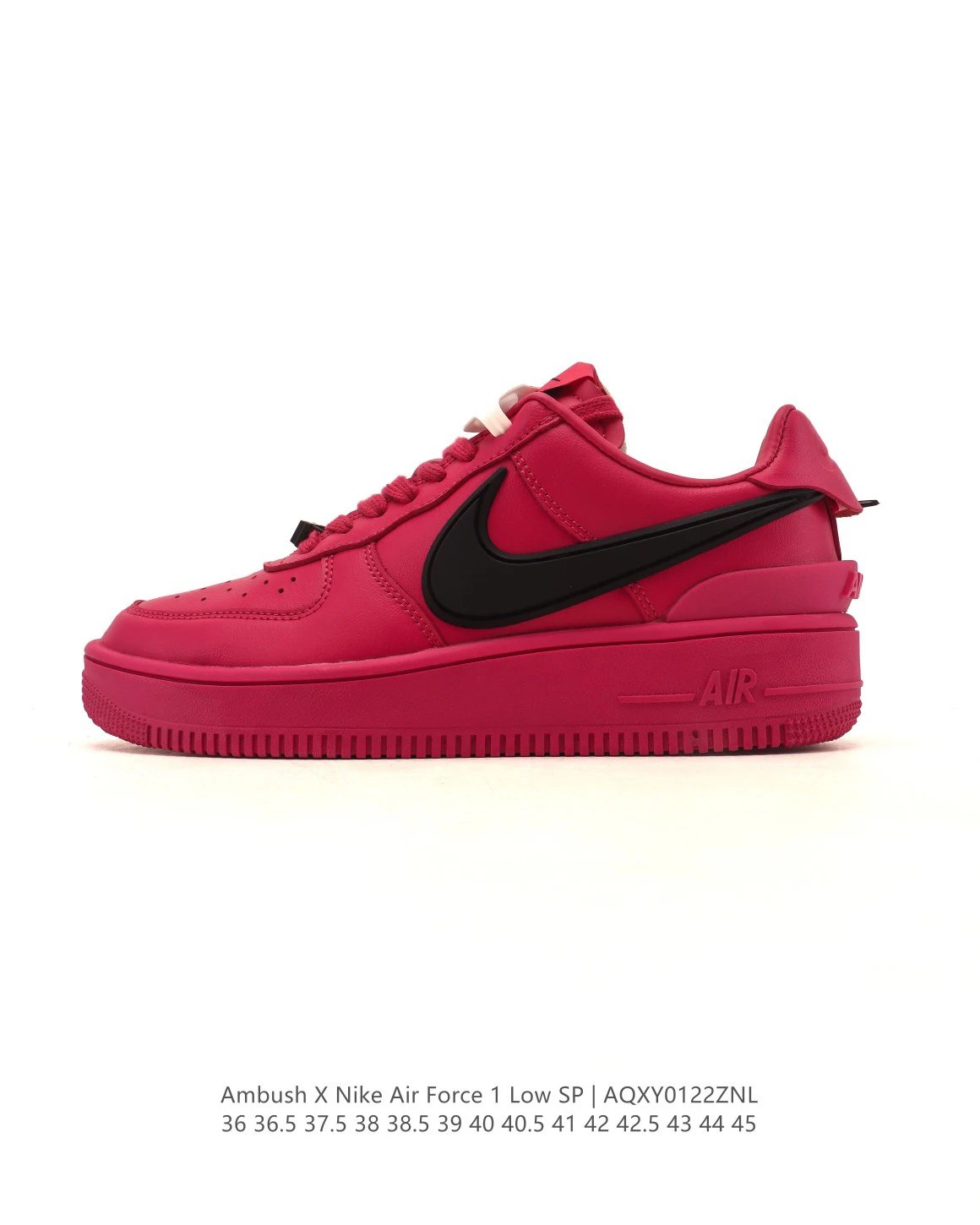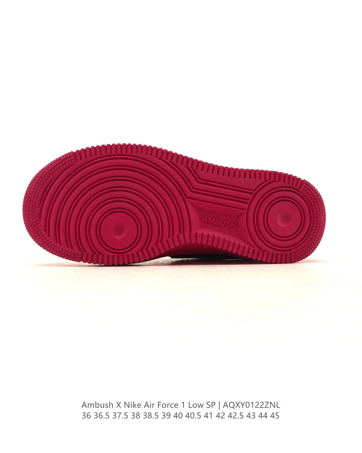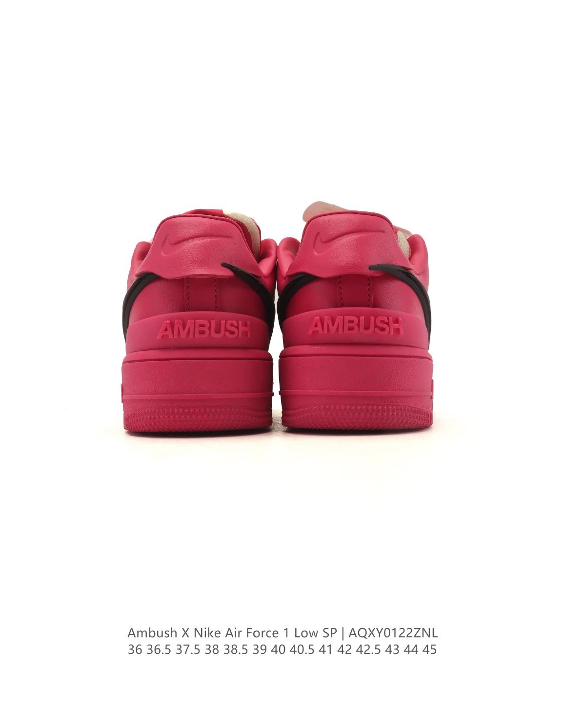 Ambush x Nike Air Force 1 Low SP casual sneakers use leather upper/lining, extended Swoosh to heel, brand logos on tongue/insole, special lace buckle, TPU heel, and classic Force 1 cushioning.