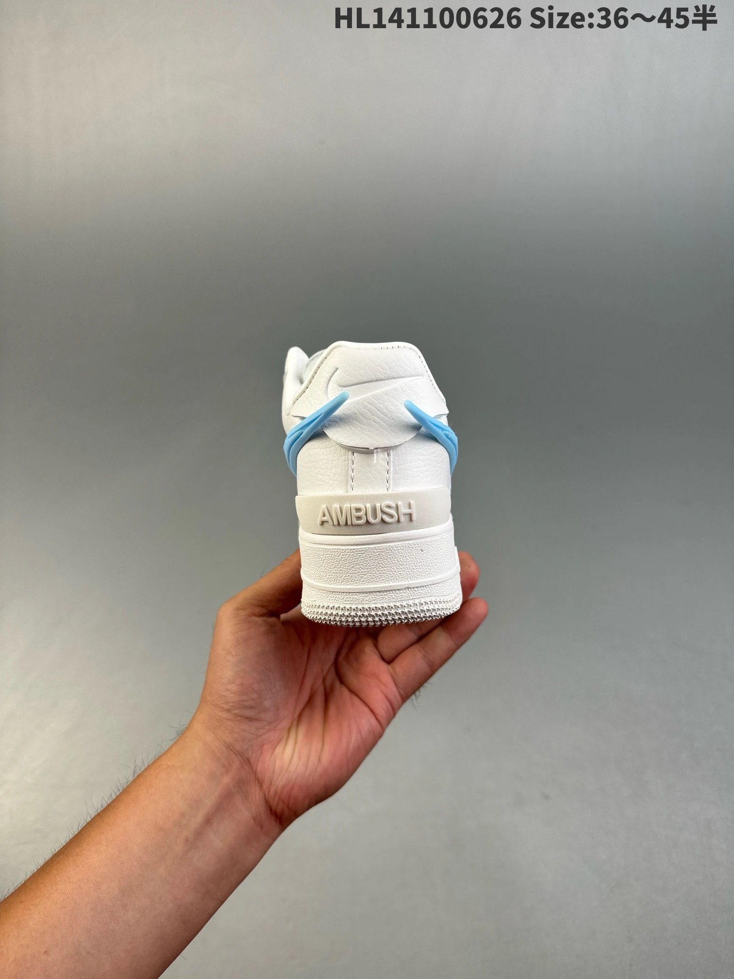 Tongue: dual logos; special lace buckle. Heel: TPU (same as Dunk) with AMBUSH text.