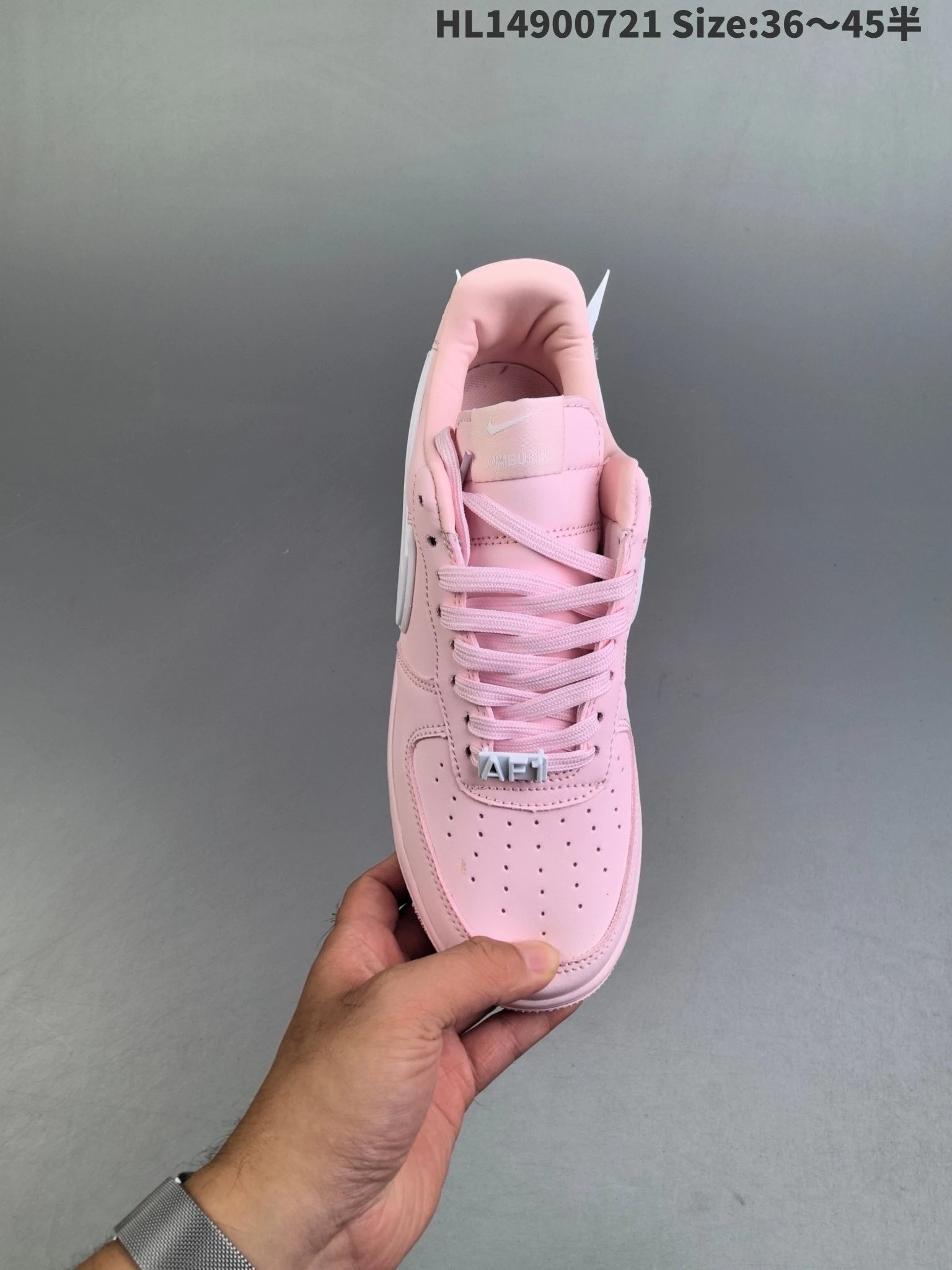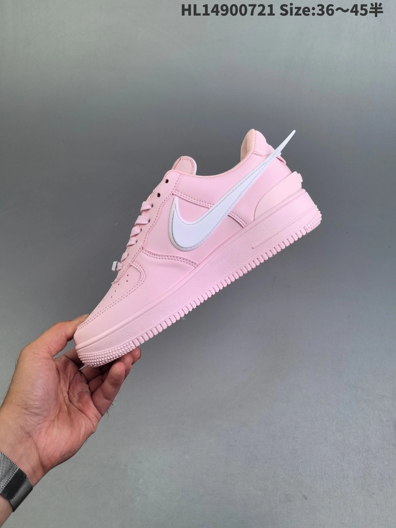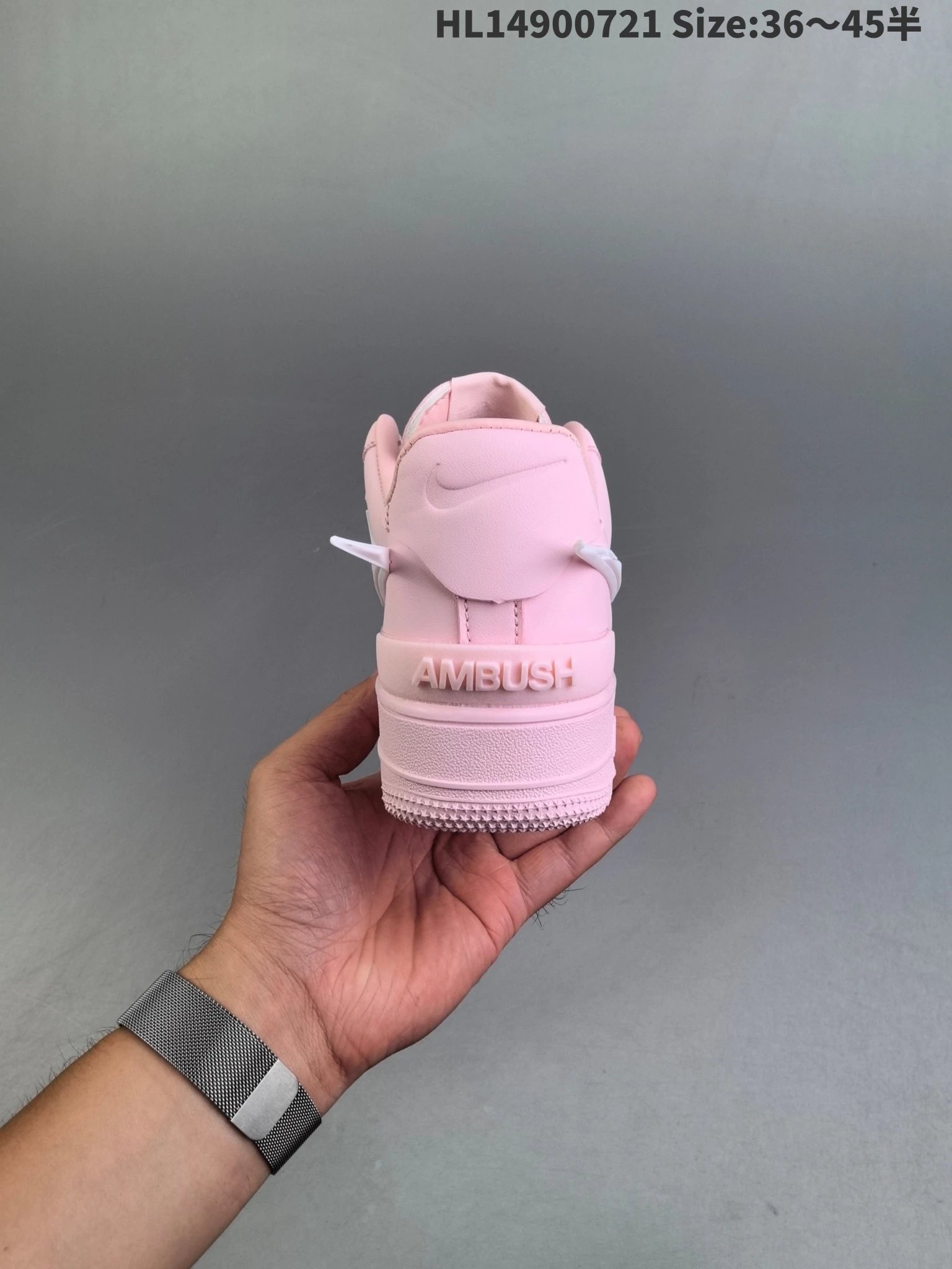 AMBUSH x Nike Air Force 1 '07 Low SP sneakers feature iconic Swoosh extended beyond heel.