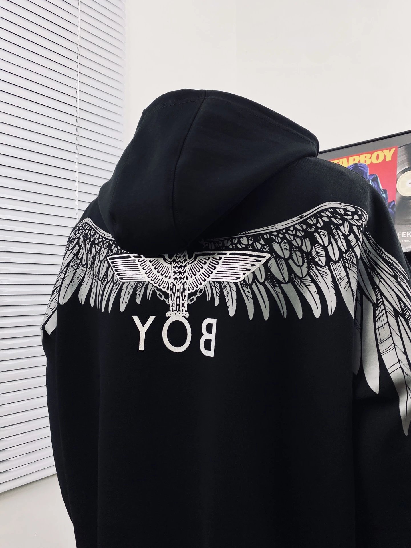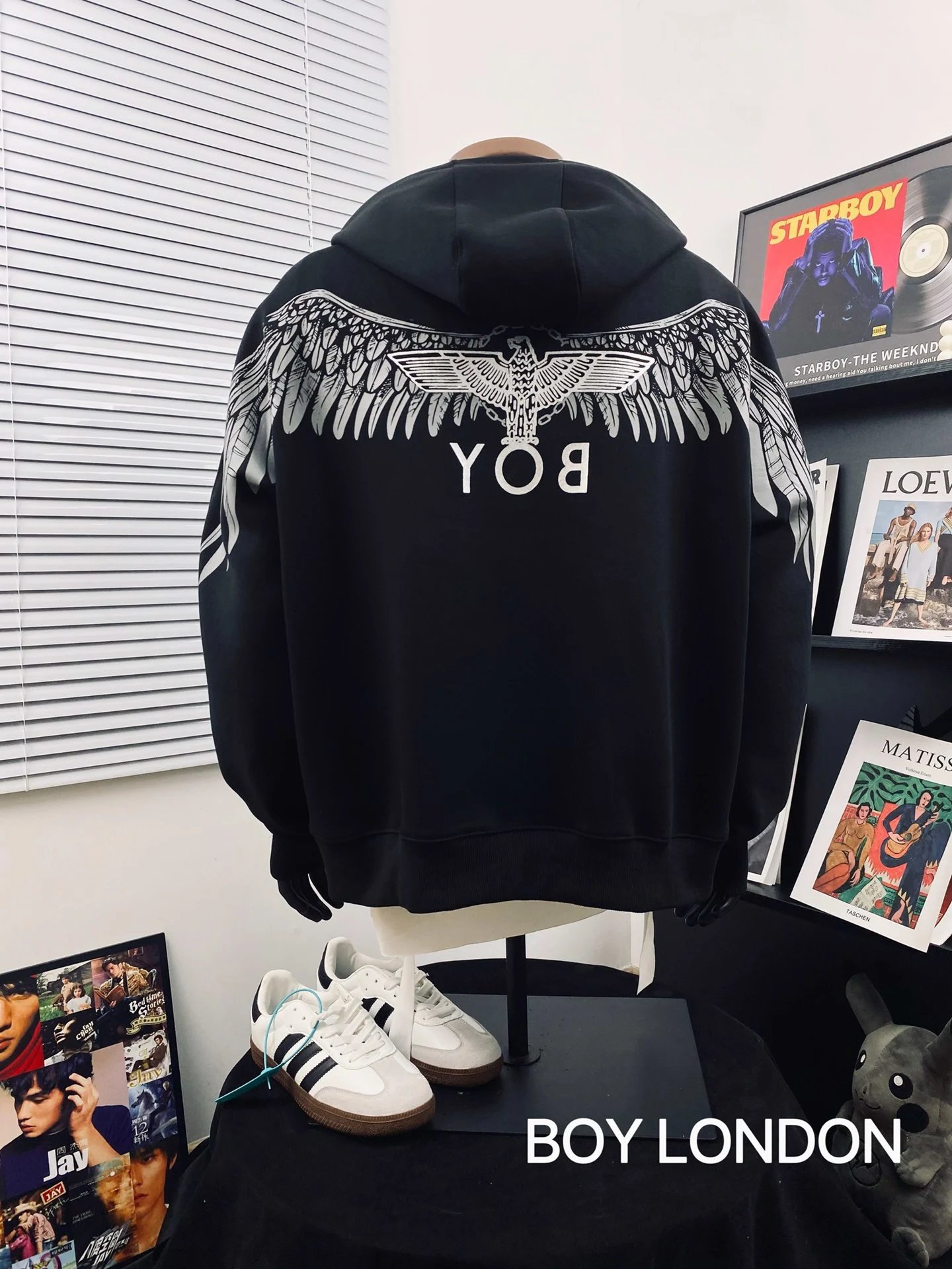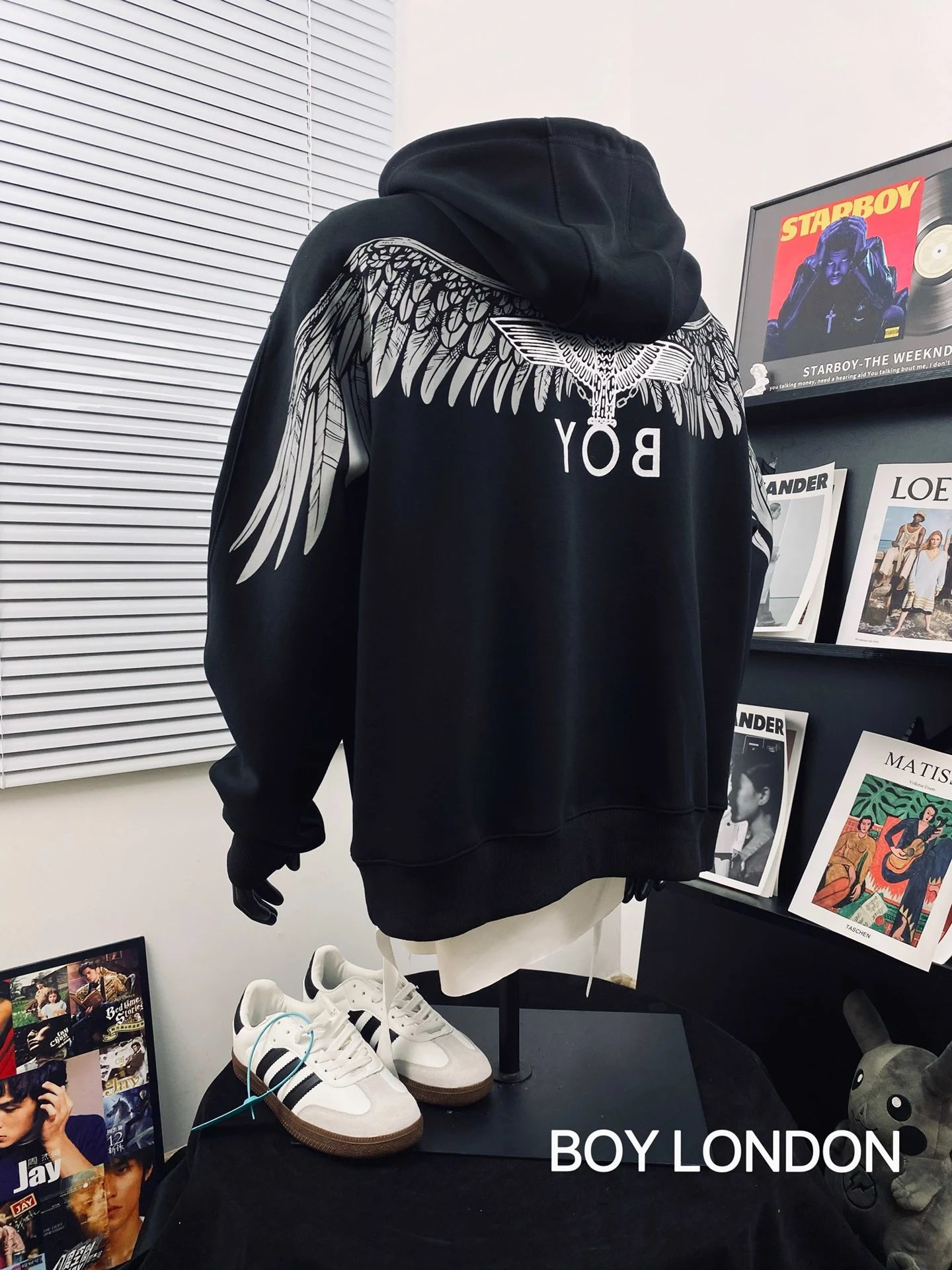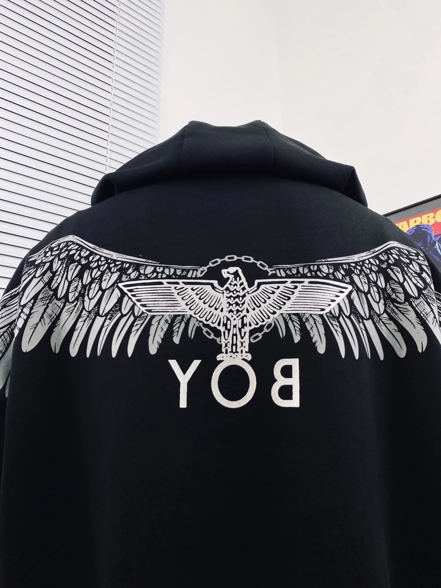 Boy London Dark Wing Reflective Unisex Loose Hoodie uses Japan 3D engraved wings, imported paste pressed at 170℃ for sharp details.