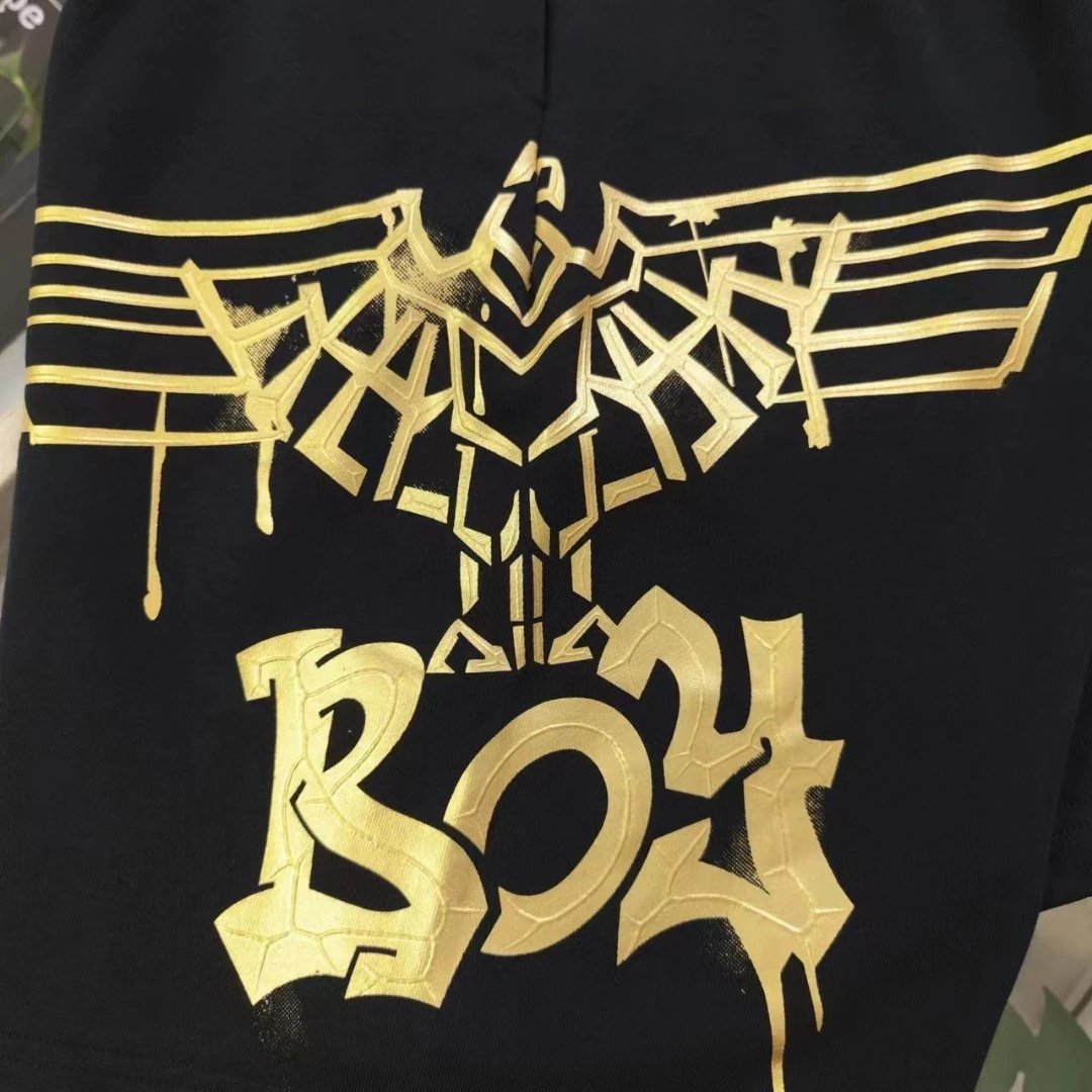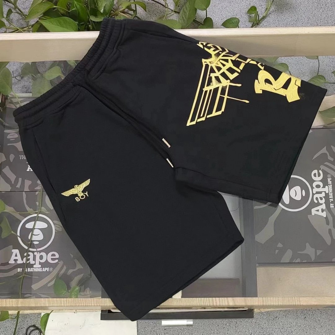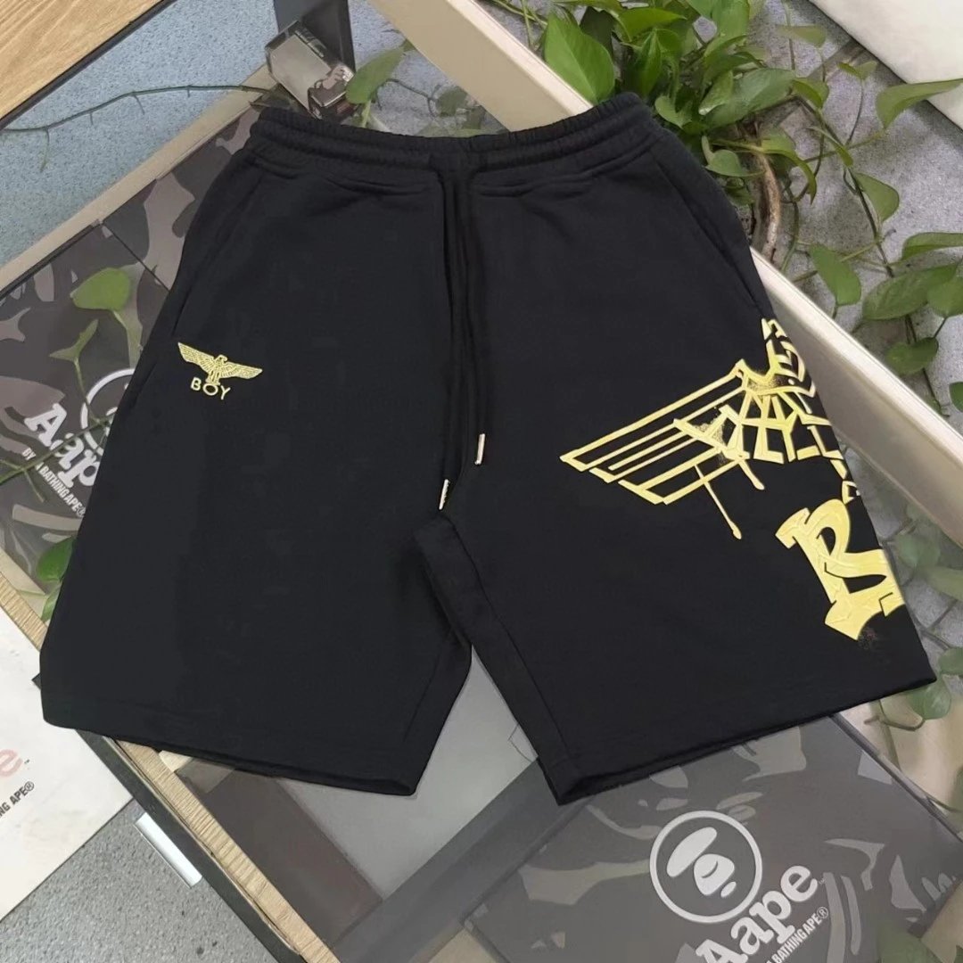 Boy London 2025 New Black Terry 5-inch Shorts feature gold foil embroidered eagle logo, 360g heavy terry fabric, casual loose fit with drop crotch, adjustable drawstring, unisex design.