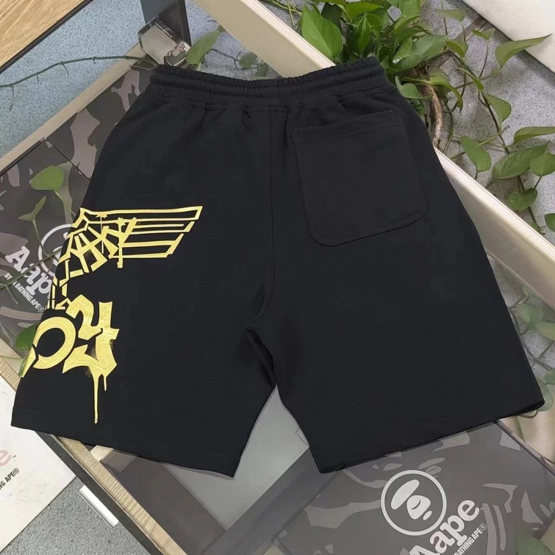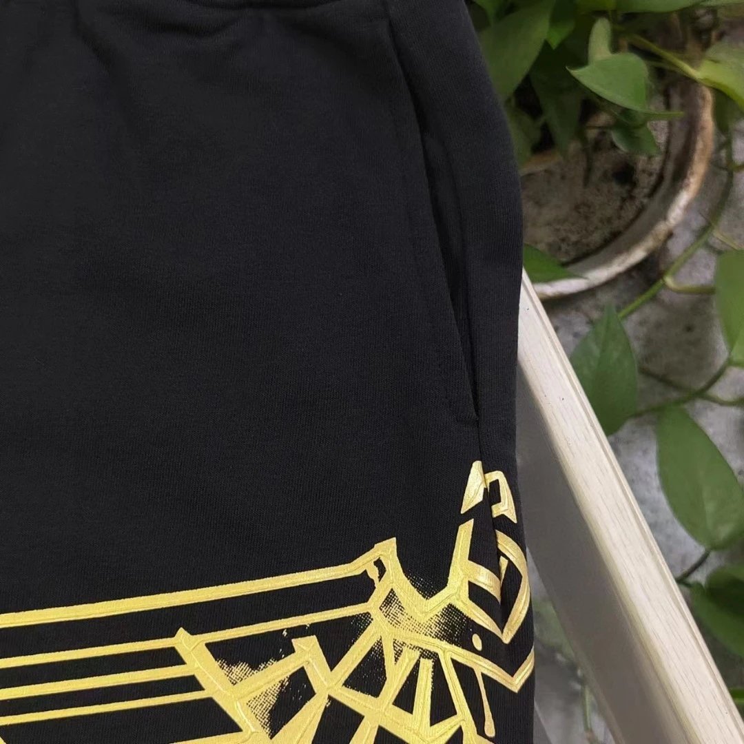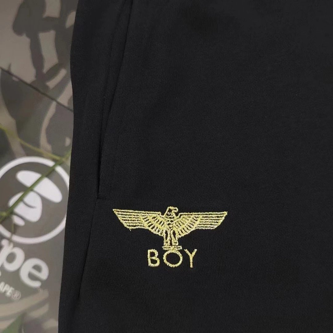 Boy London 2025 New Black Terry 5-inch Shorts feature gold foil embroidered eagle logo, 360g heavy terry fabric, casual loose fit with drop crotch, adjustable drawstring, unisex design.