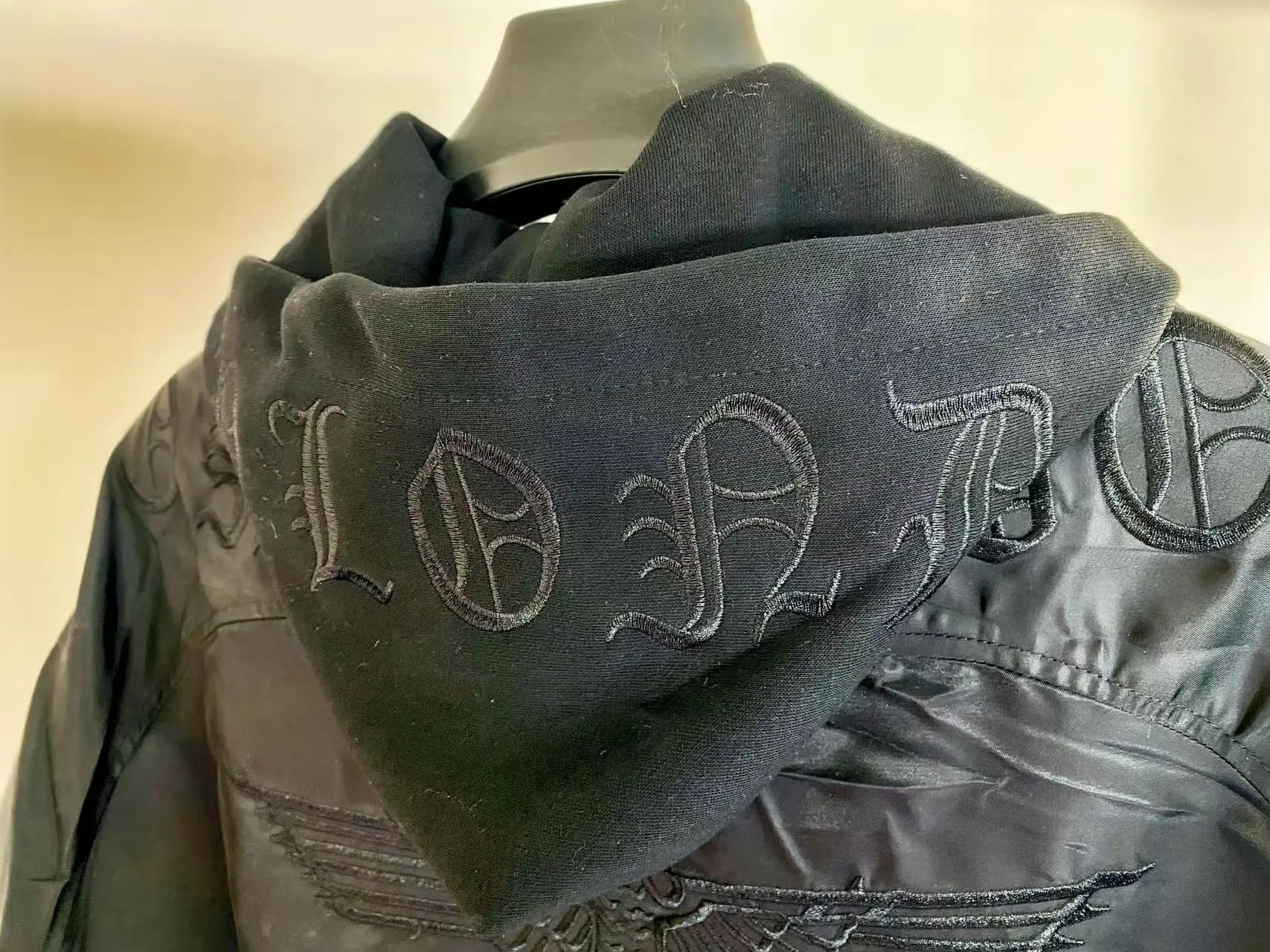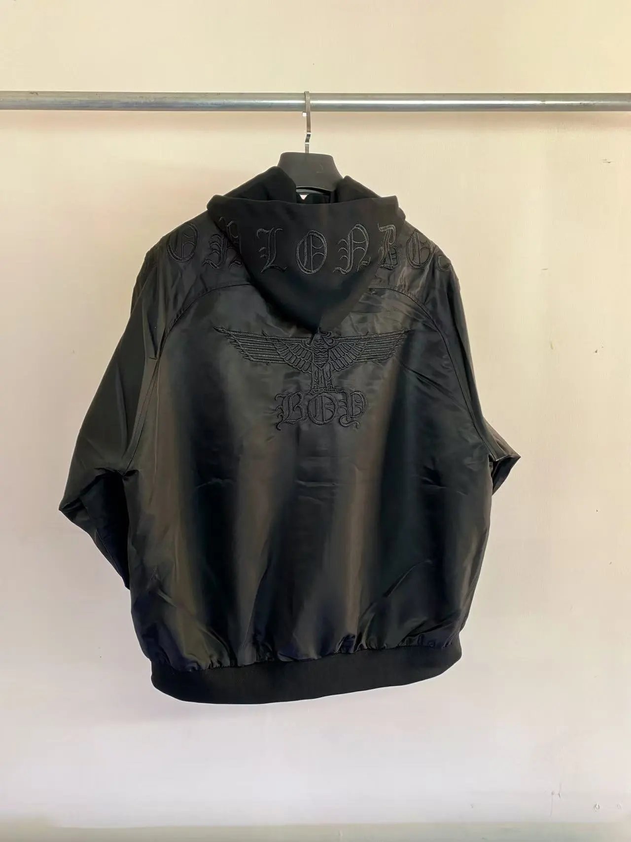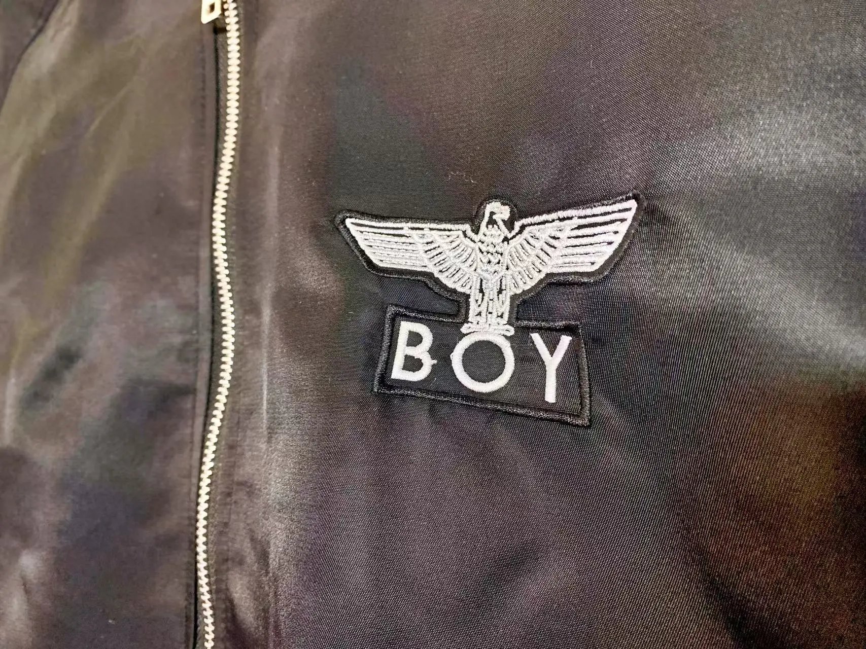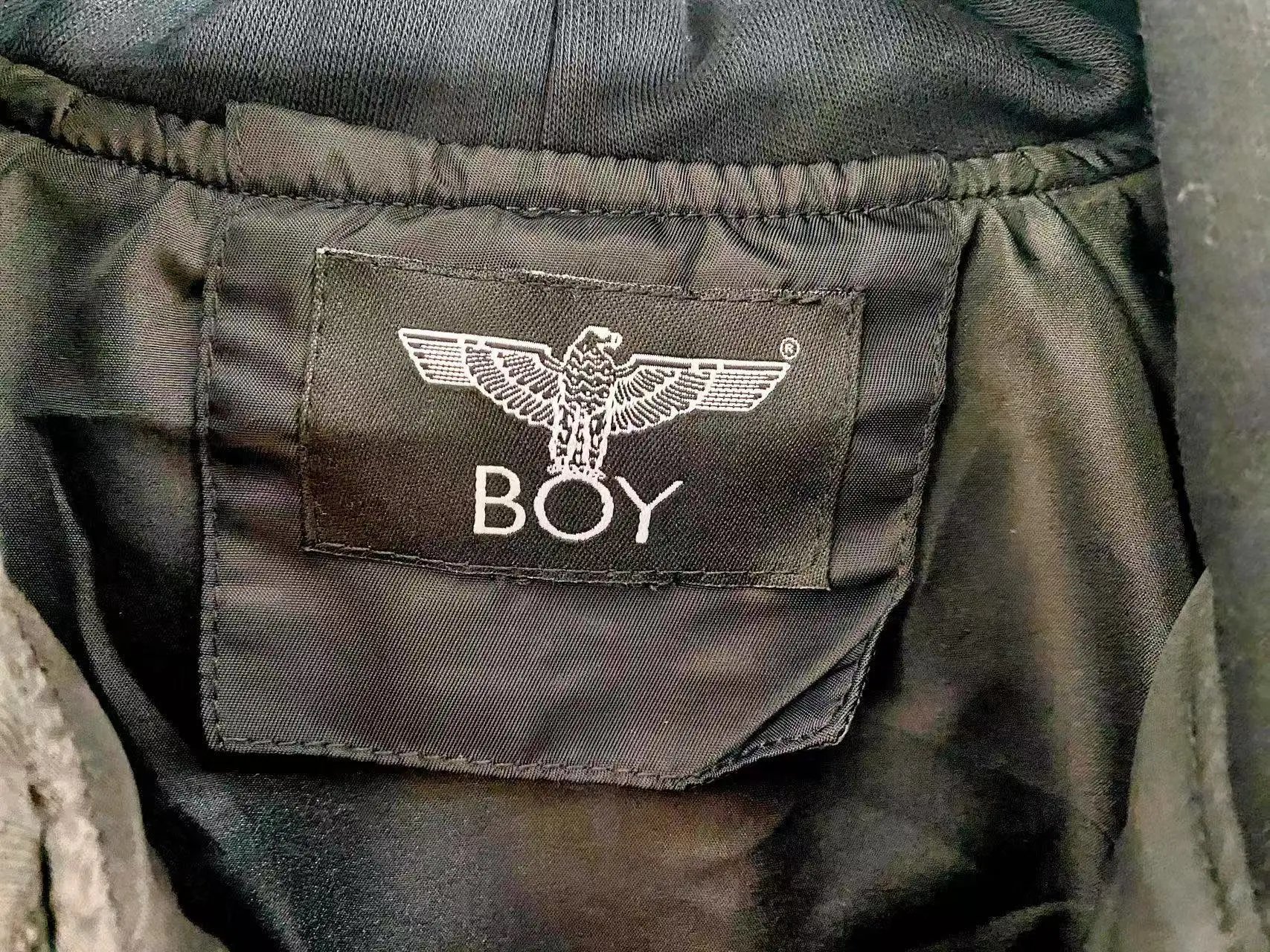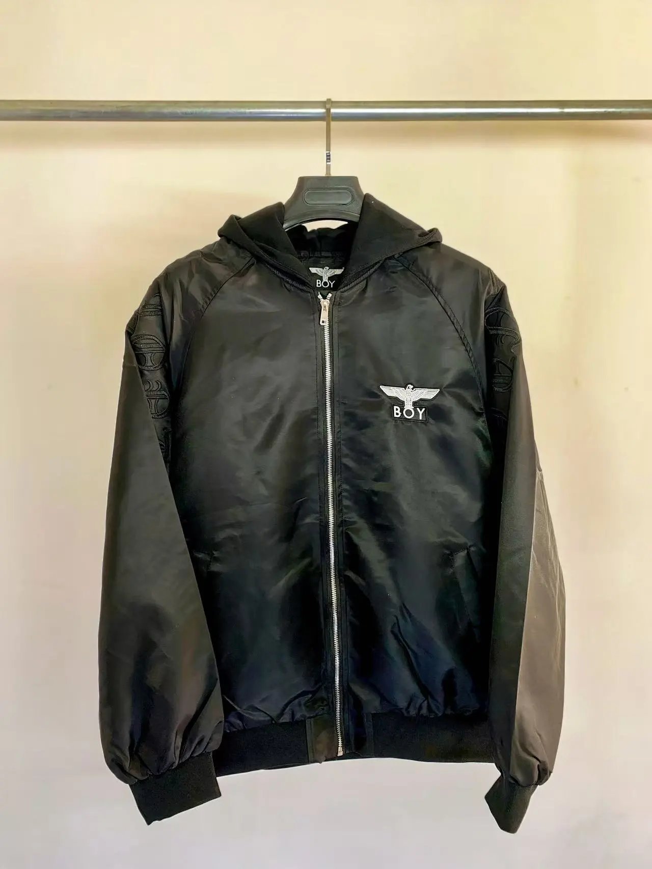 Boy London 2024 East Black Unisex Jacket has gold foil logo, eagle print & zipper pockets.