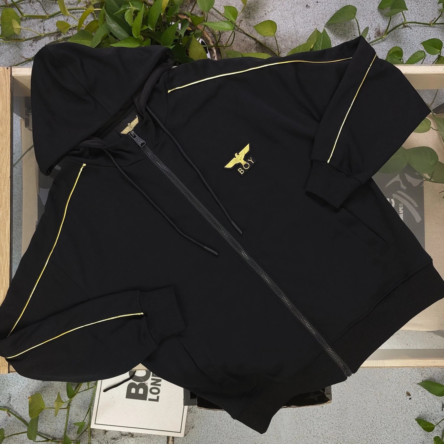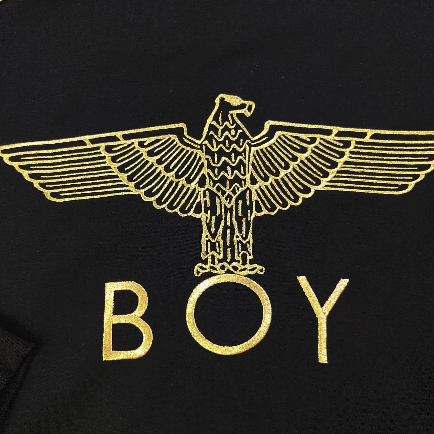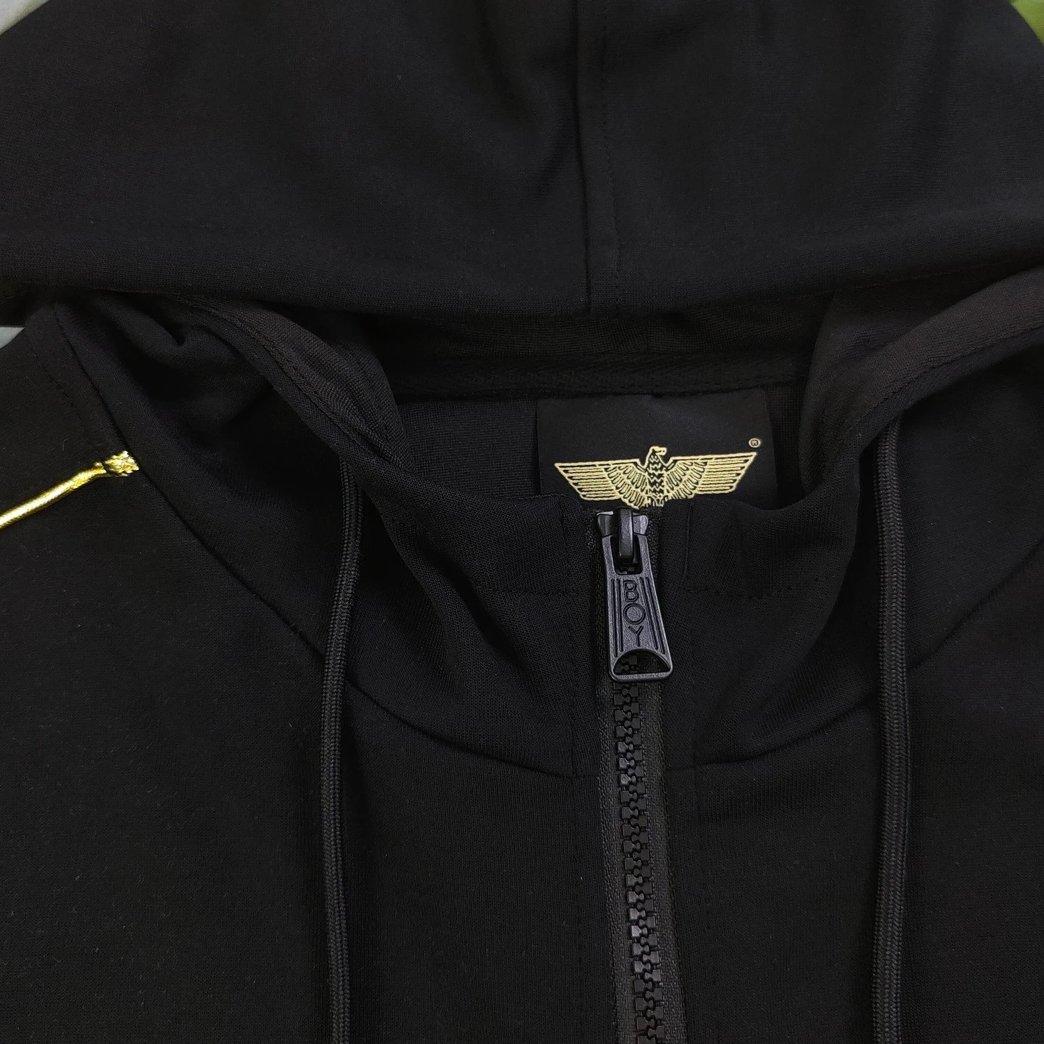 Boy London 2025 new black fleece hooded zip jacket with gold foil rhinestone eagle wings embroidery, unisex zip-up.
