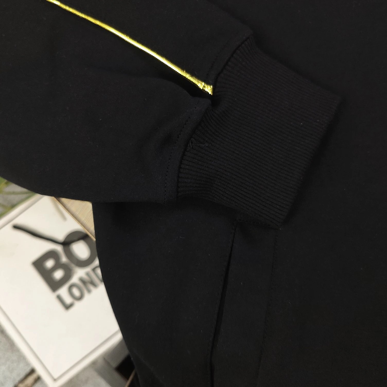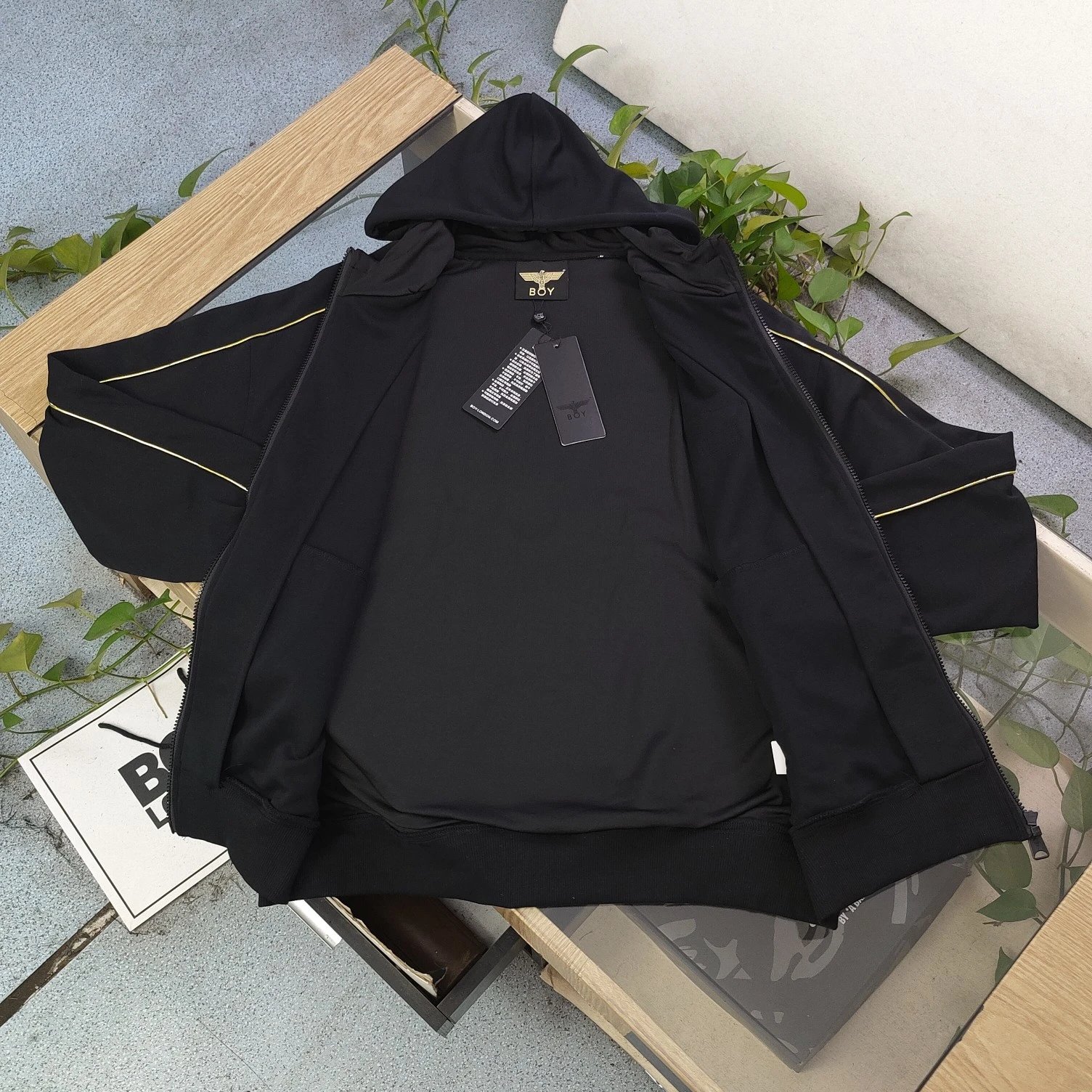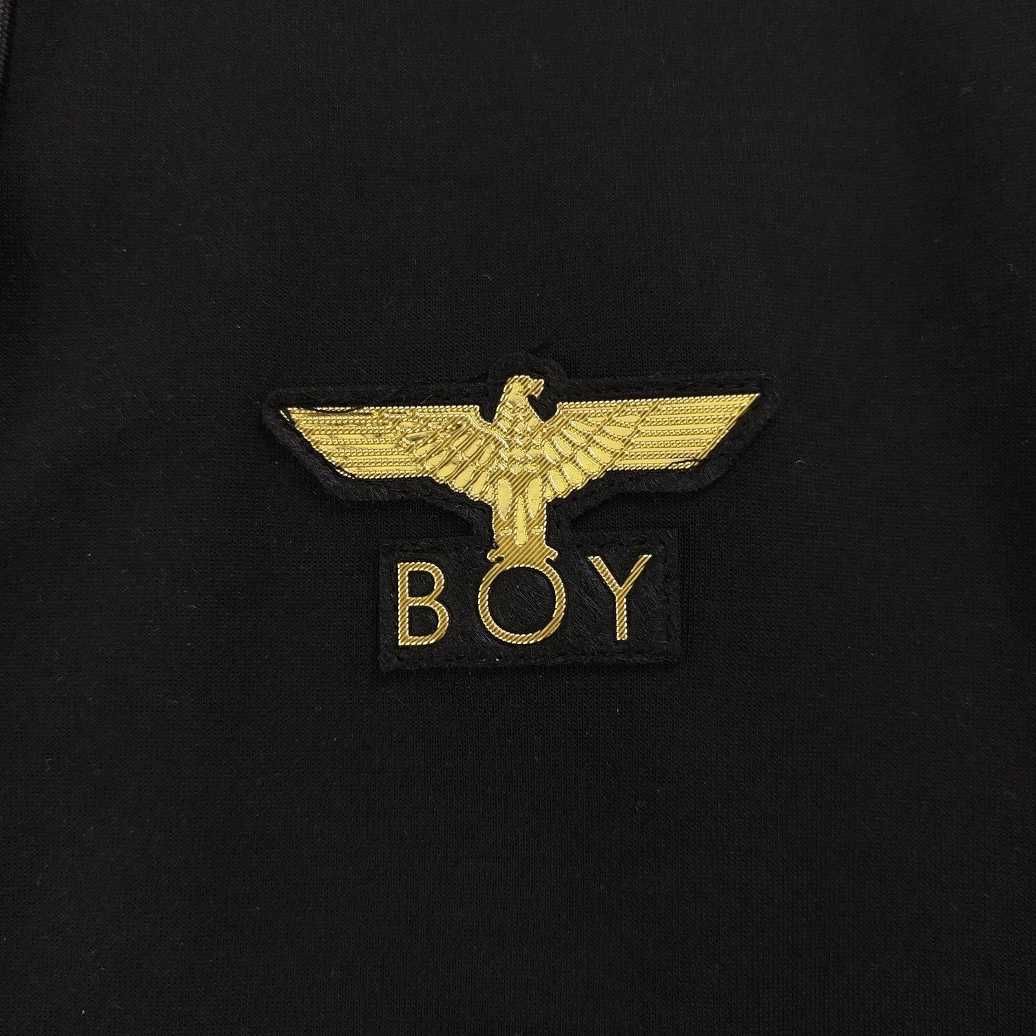 Boy London 2025 new black fleece hooded zip jacket with gold foil rhinestone eagle wings embroidery, unisex zip-up.