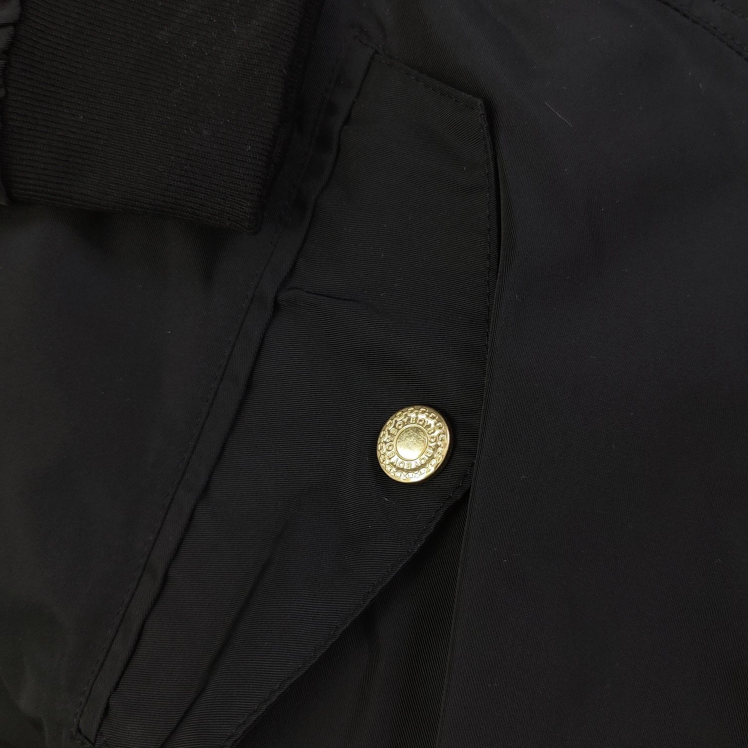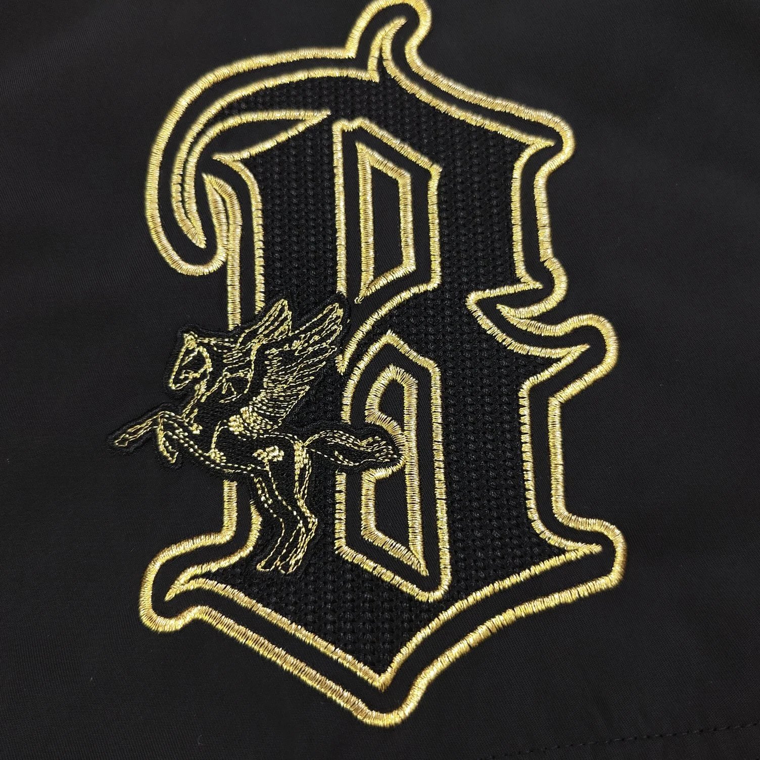 Black jacket with gold embroidered eagle logo, custom fabric, durable zipper, anti-pilling & colorfast.