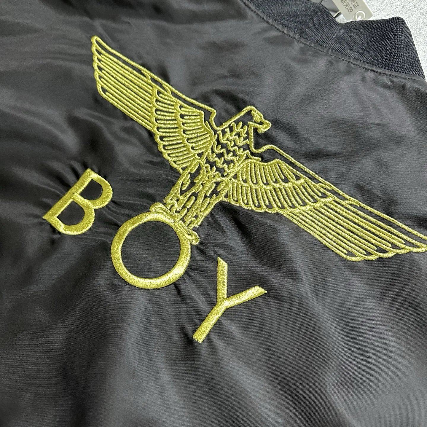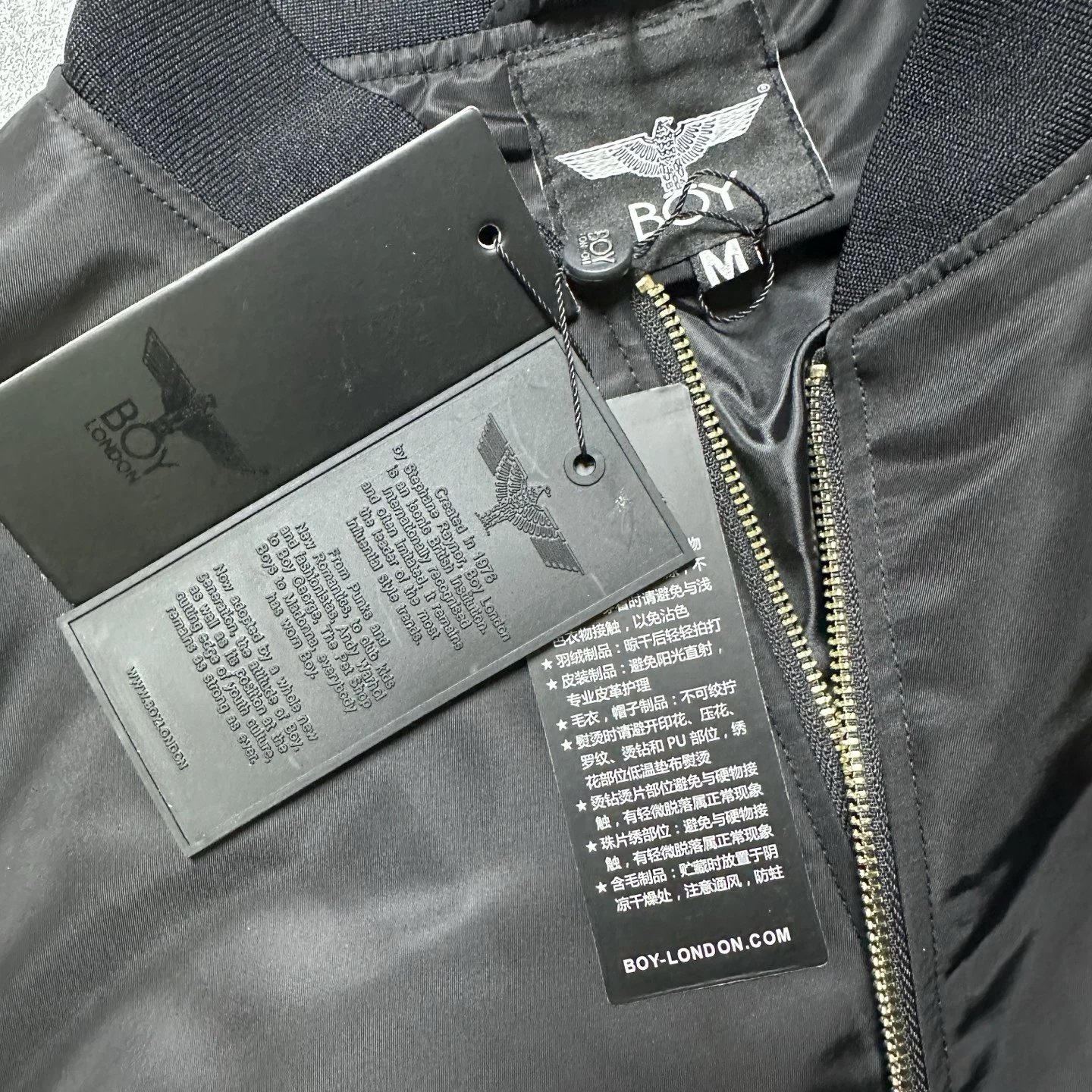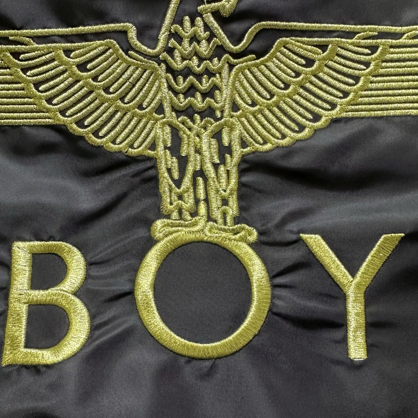 Boy London 210 Black Flight Baseball Jacket has chest embroidery, gold eagle wing back embroidery.
