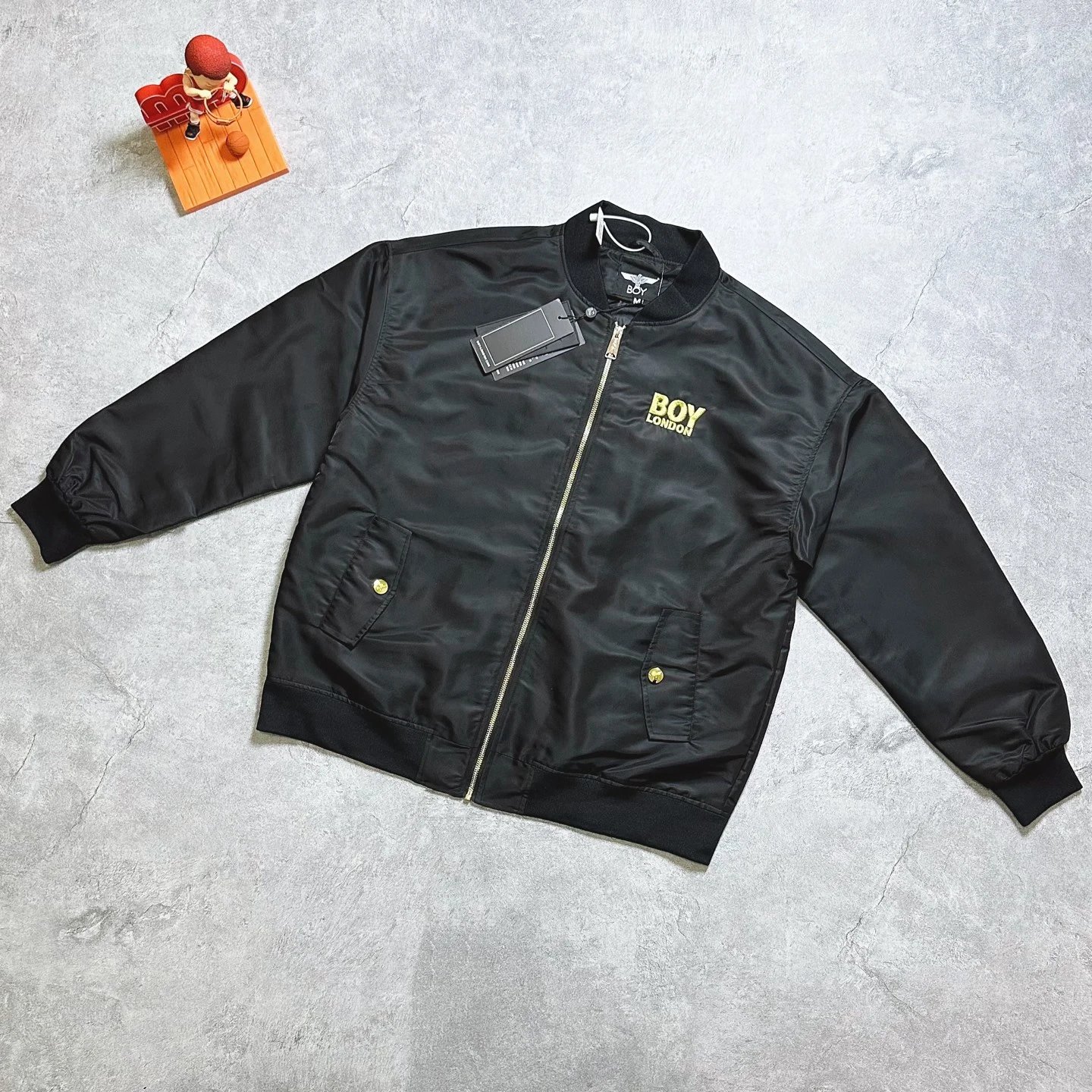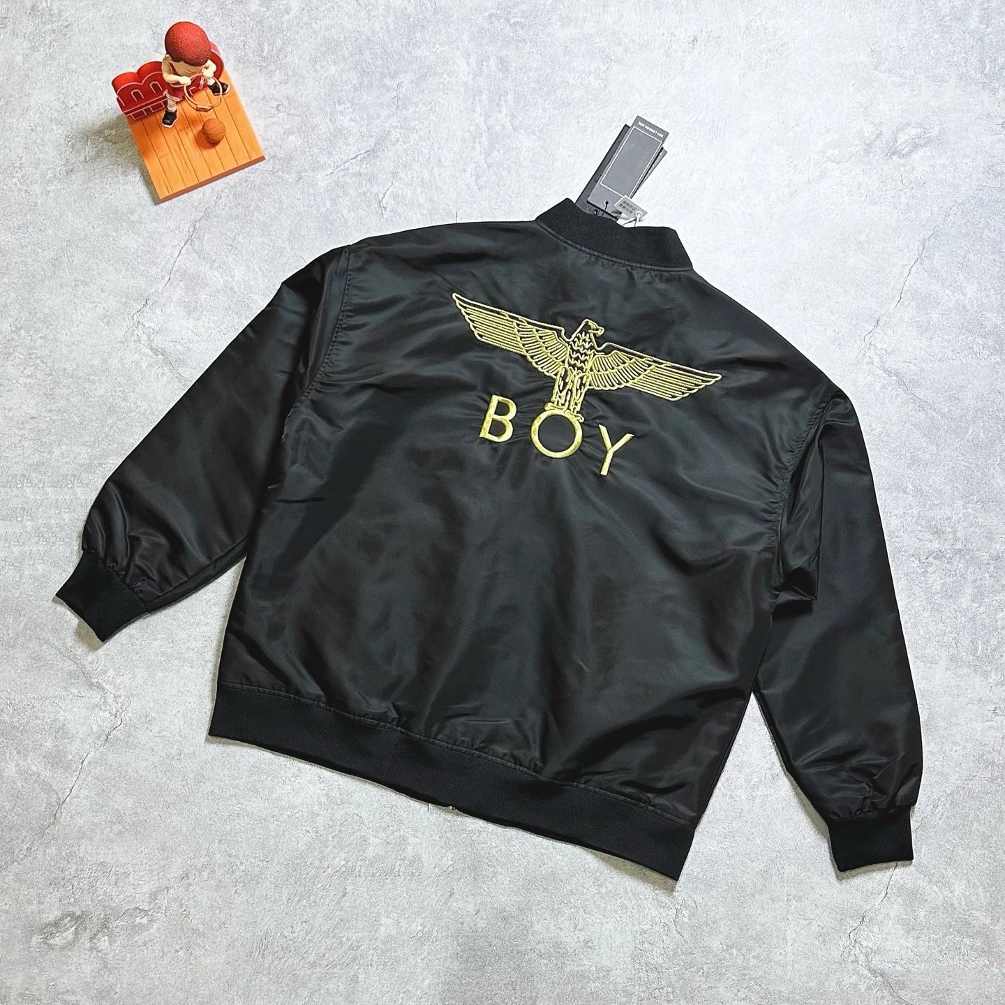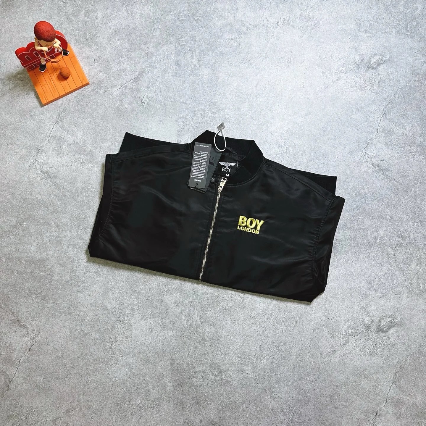 Boy London 210 Black Flight Baseball Jacket has chest embroidery, gold eagle wing back embroidery.