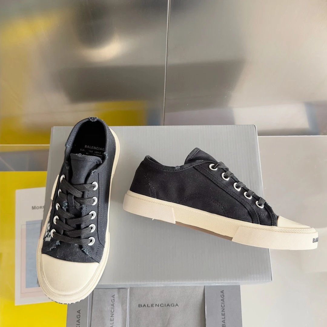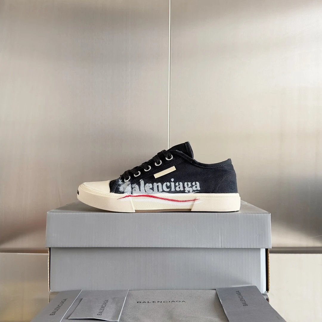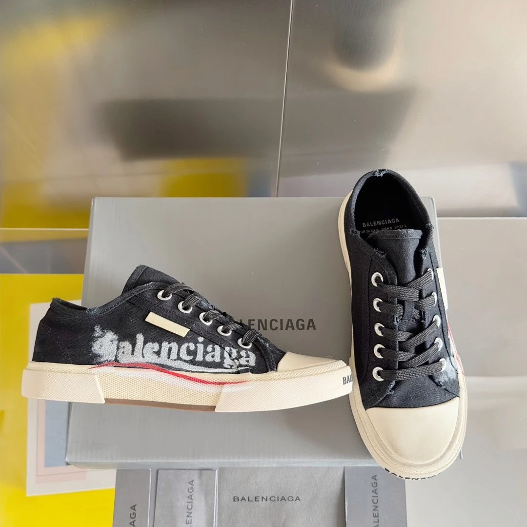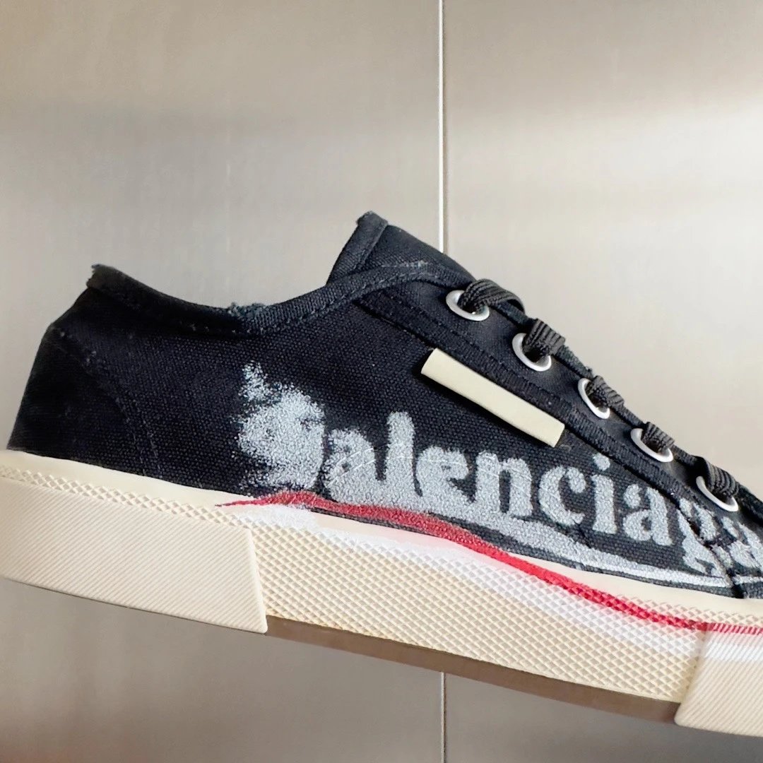 Balenciaga Paris Distressed Graffiti Unisex Sneakers. Inspired by 1960s styles, this retro design features custom distressed canvas.