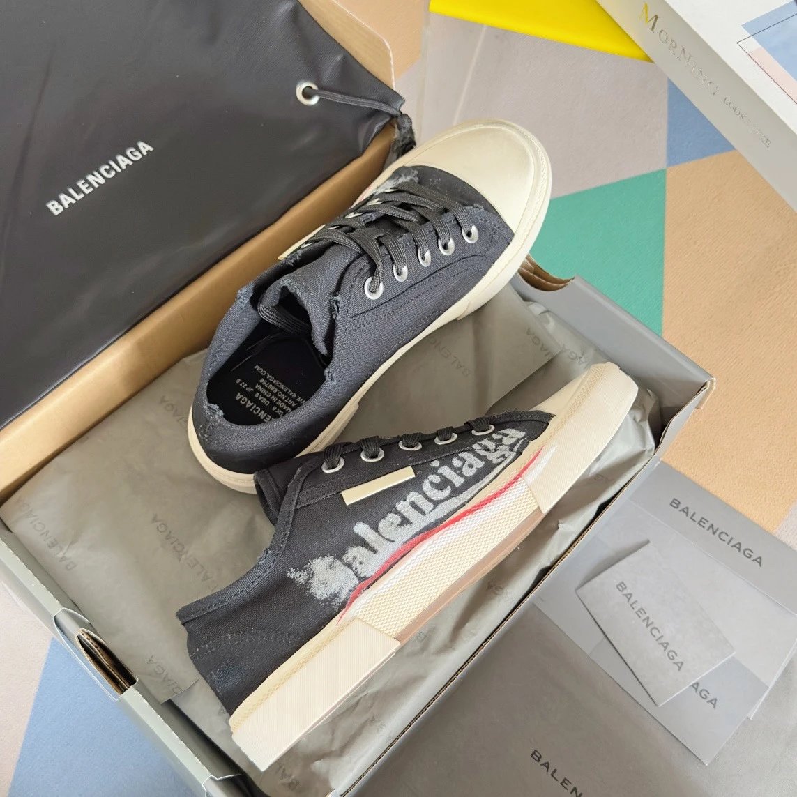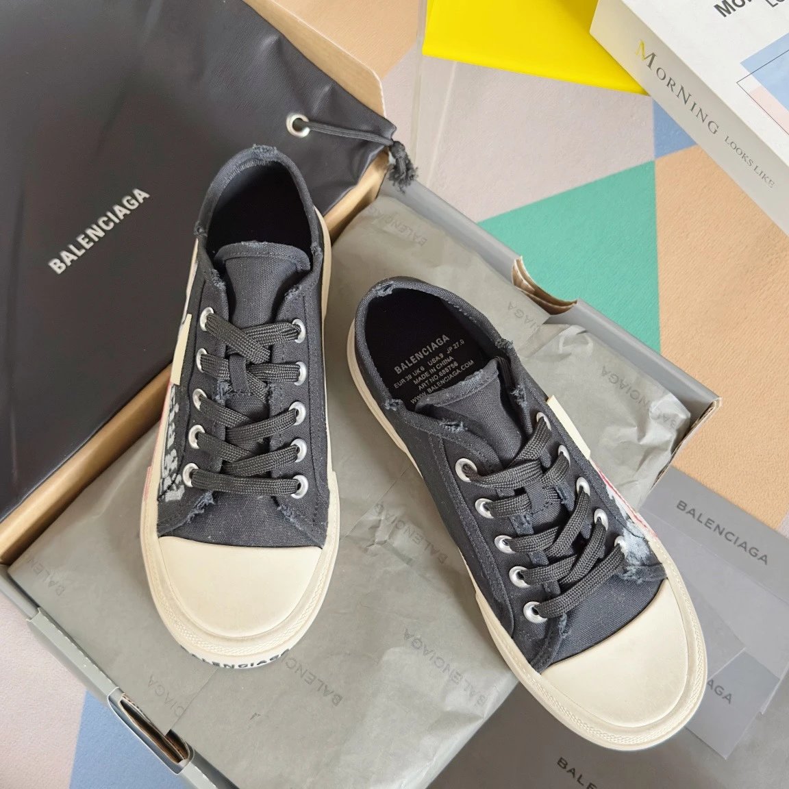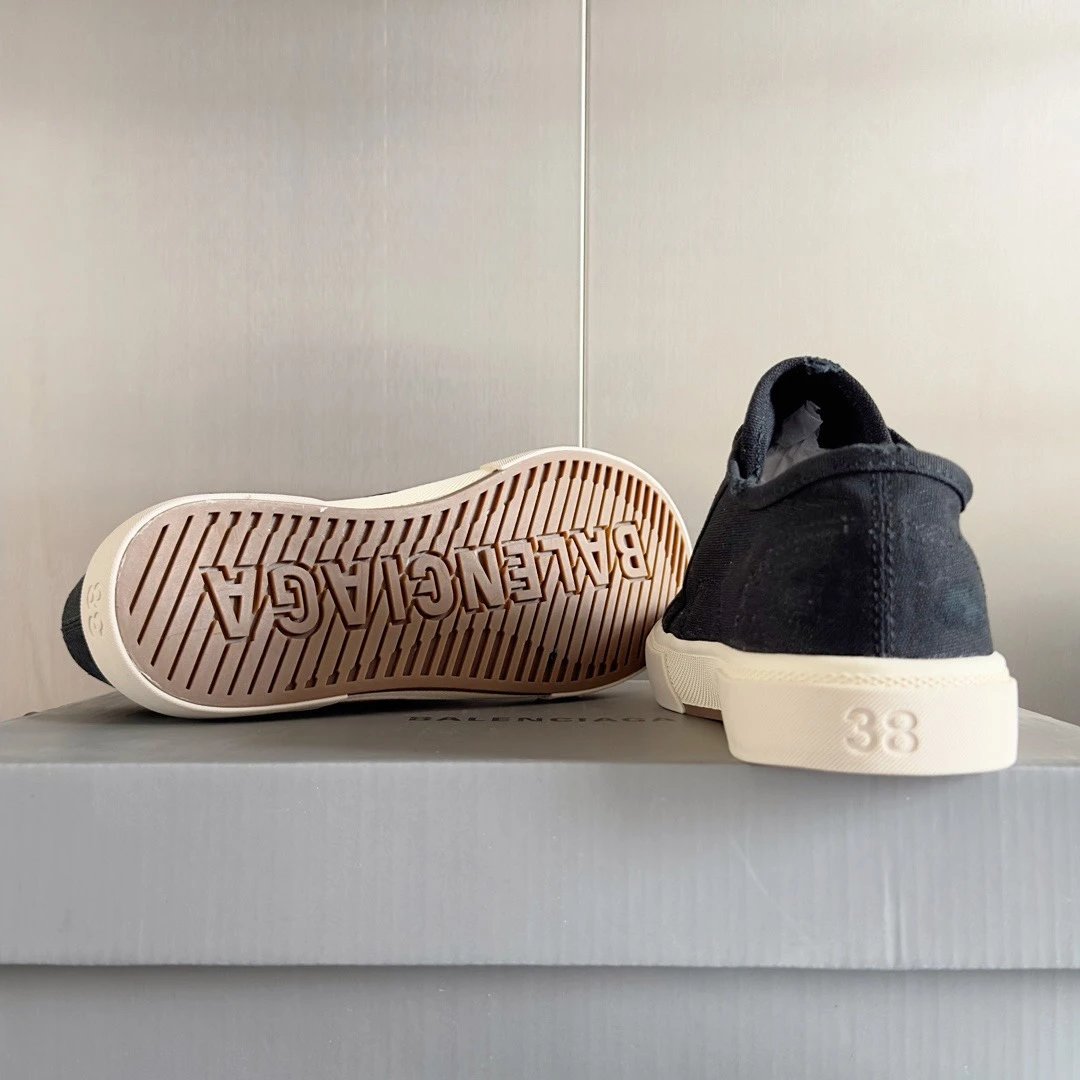 Balenciaga Paris Distressed Graffiti Unisex Sneakers. Inspired by 1960s styles, this retro design features custom distressed canvas.