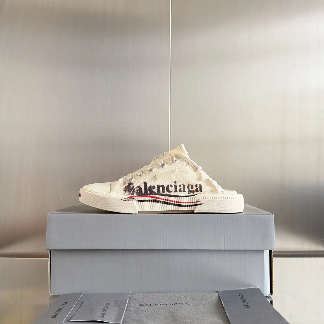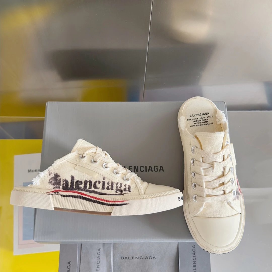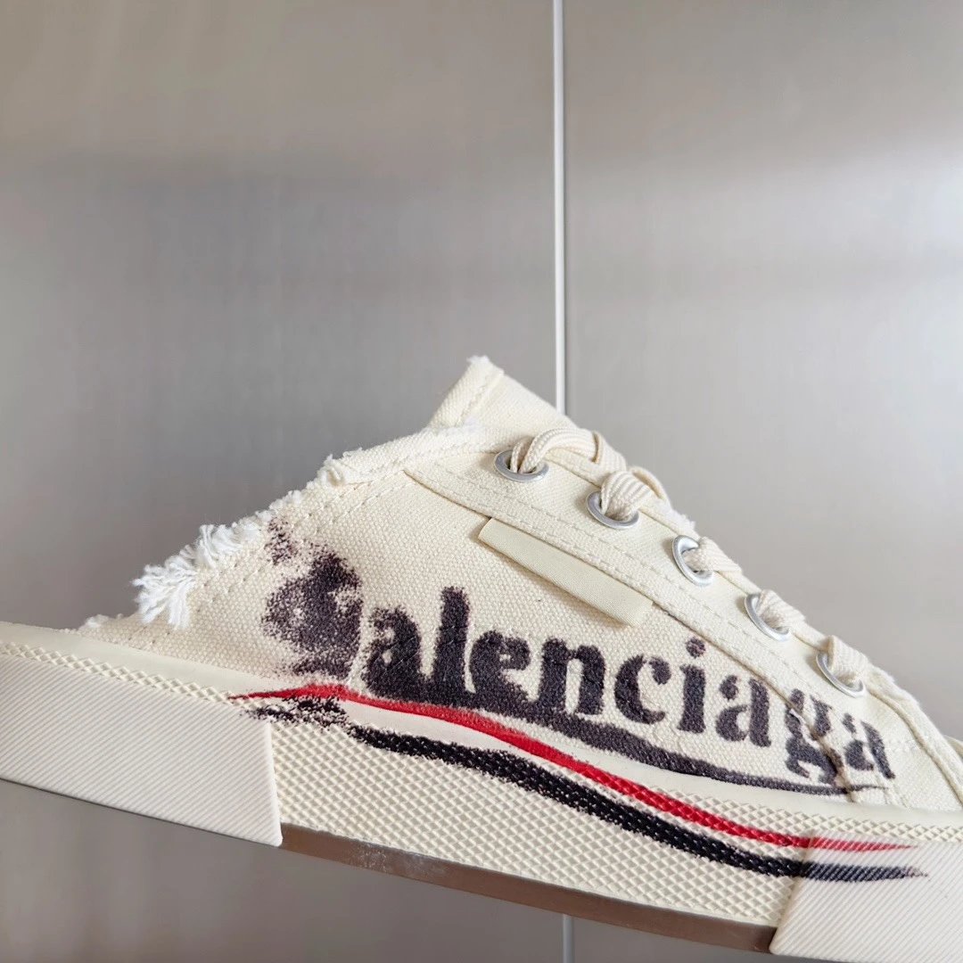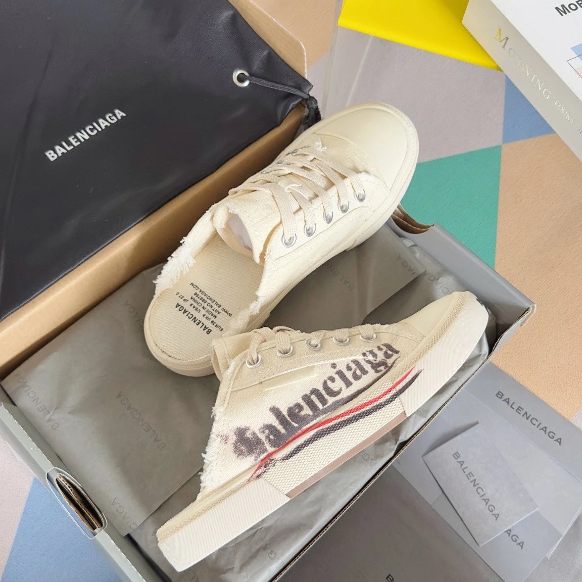 Balenciaga Paris Vintage Doodle Unisex Sneakers: premium version inspired by 60s vulcanized shoes, Demna-style rebellion, retro distressing, black/white/red, brand logo.
