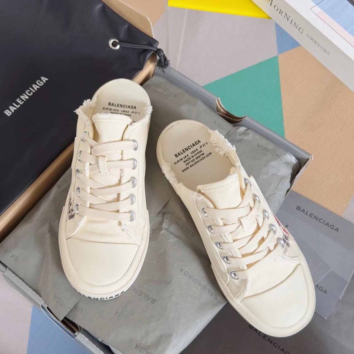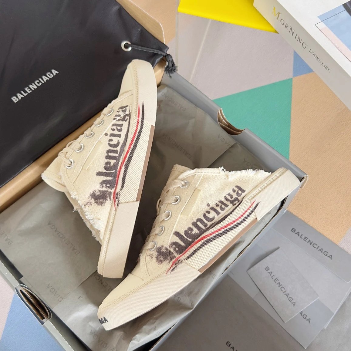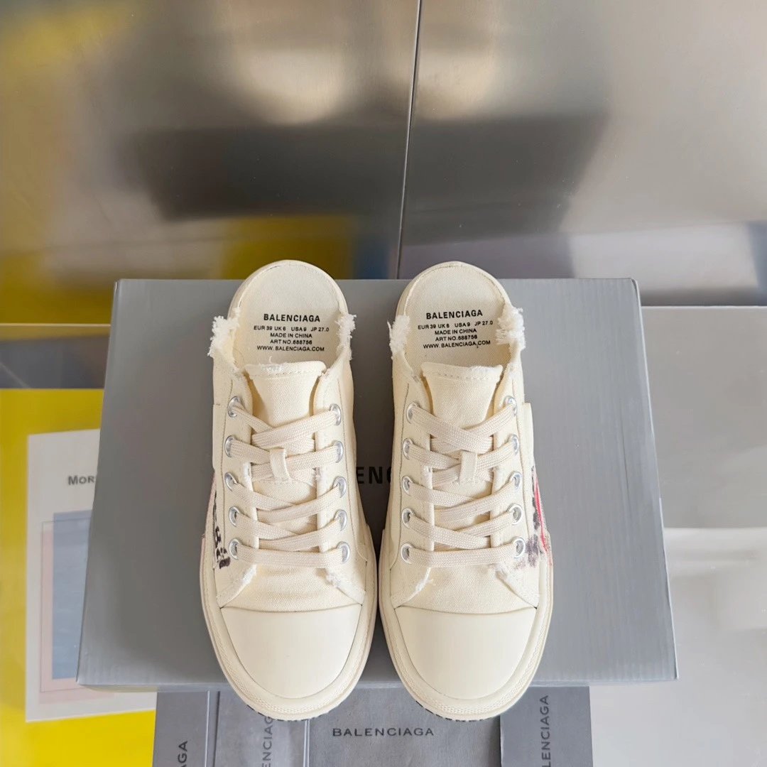 Balenciaga Paris Vintage Doodle Unisex Sneakers: premium version inspired by 60s vulcanized shoes, Demna-style rebellion, retro distressing, black/white/red, brand logo.