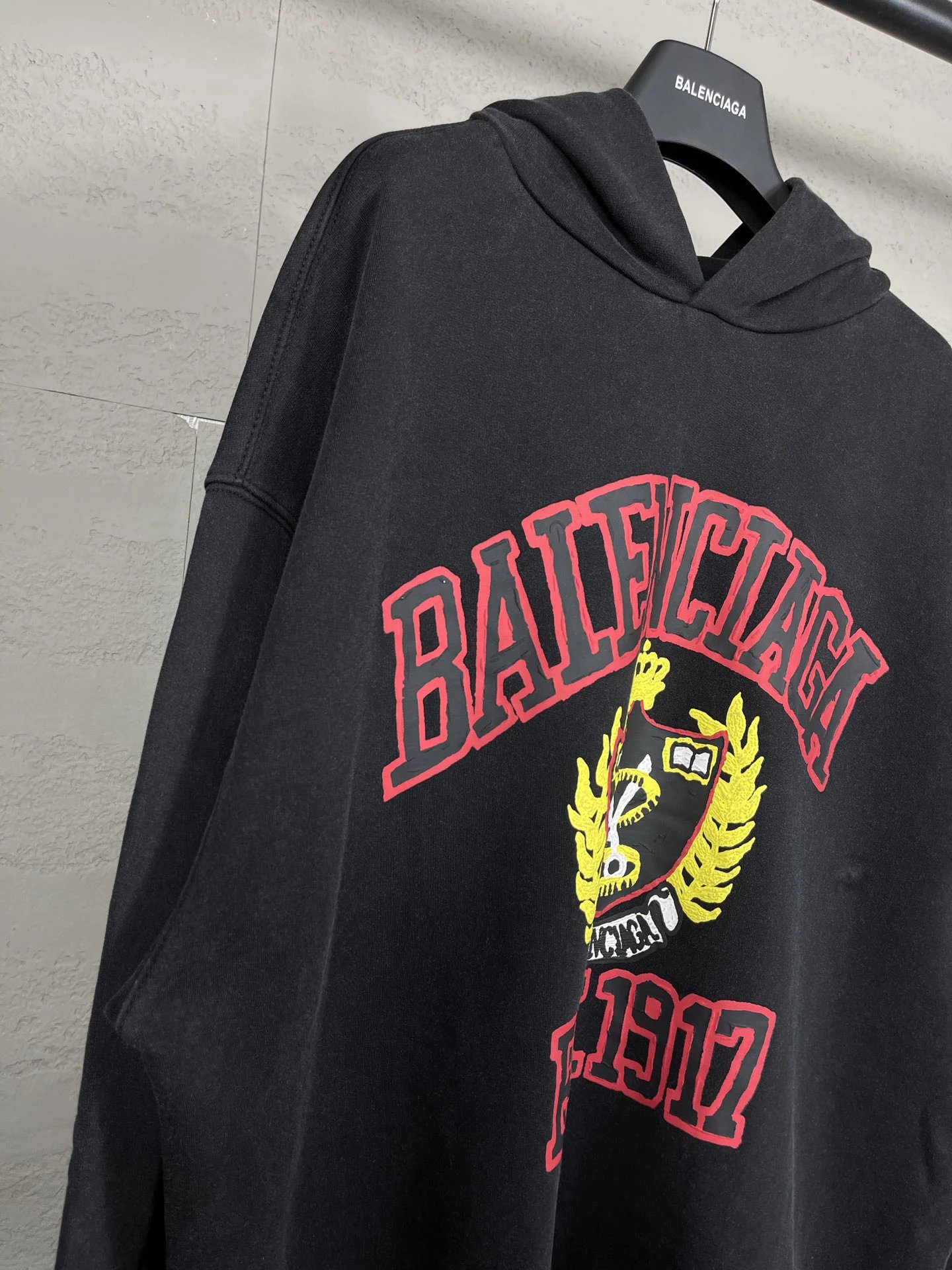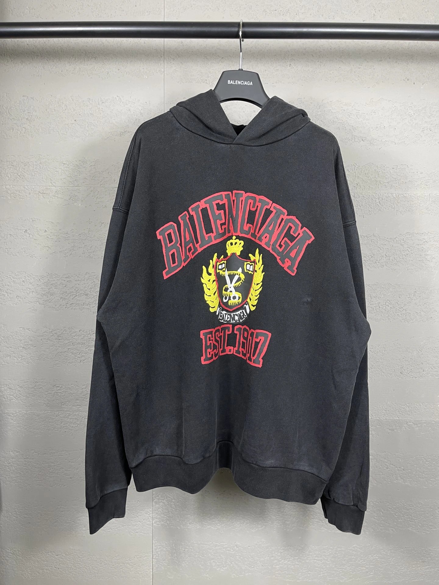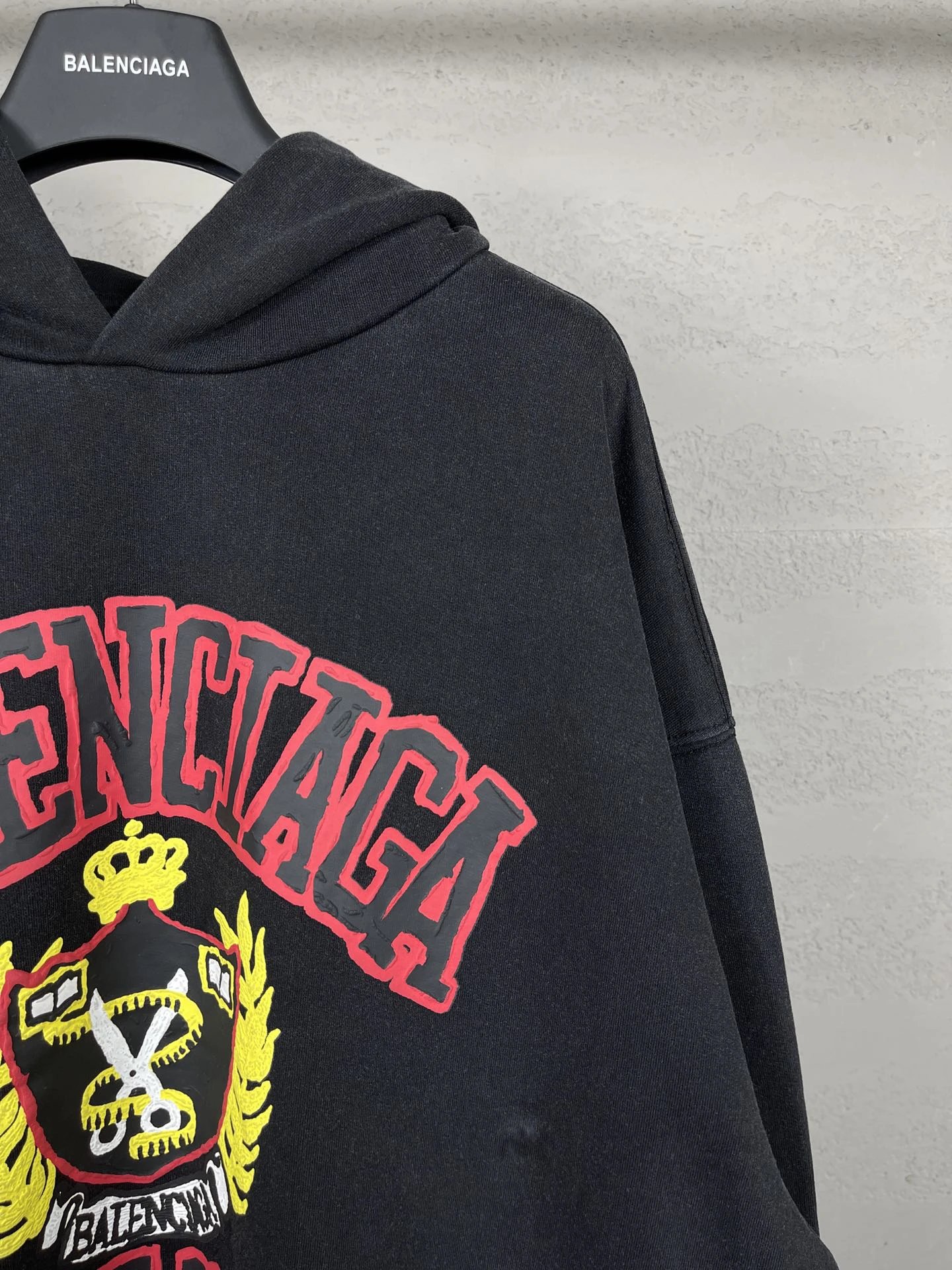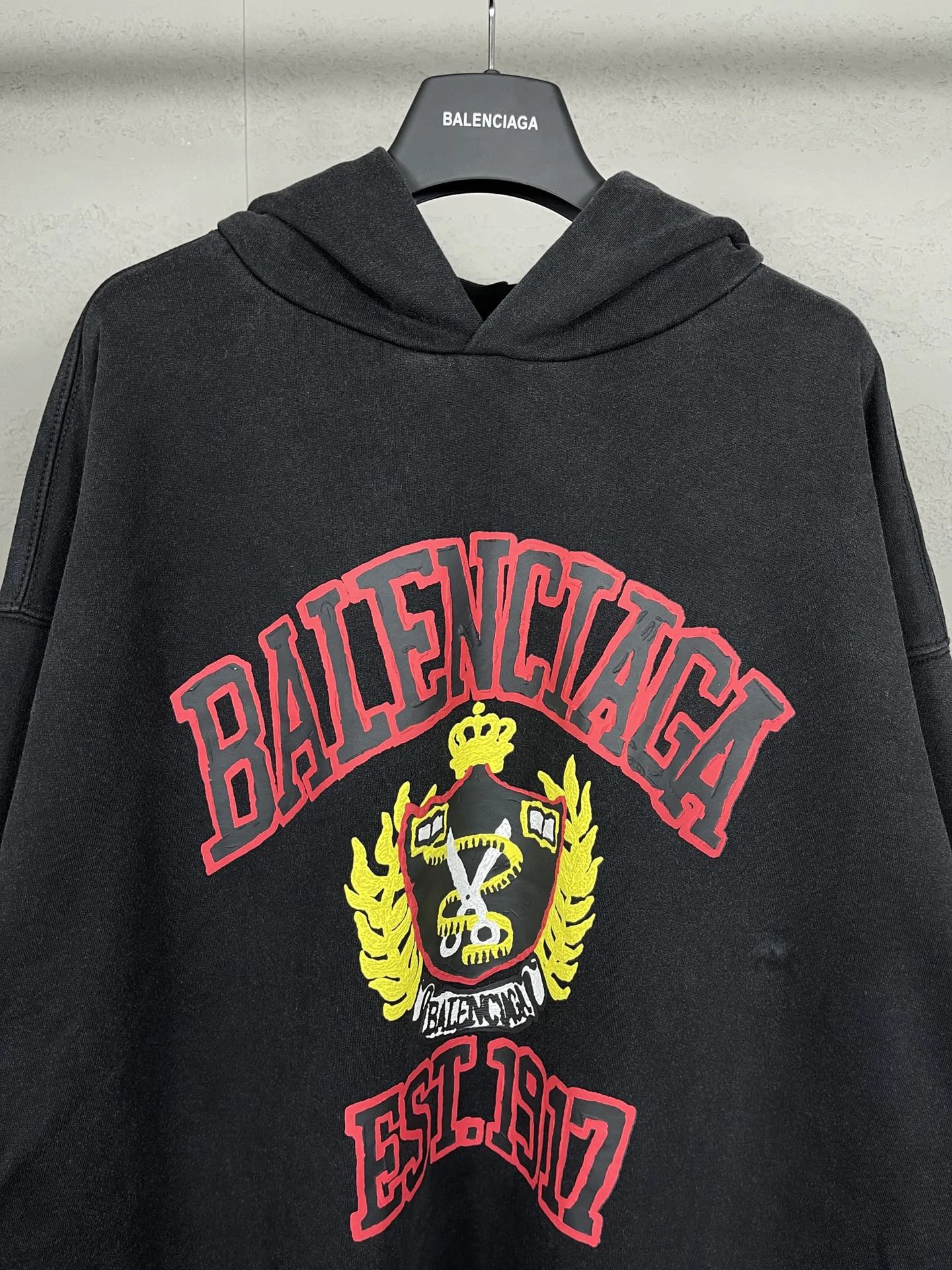 Balenciaga 2023 unisex hoodie: washed black & off-white, 450g cotton, oversized drop-shoulder fit.