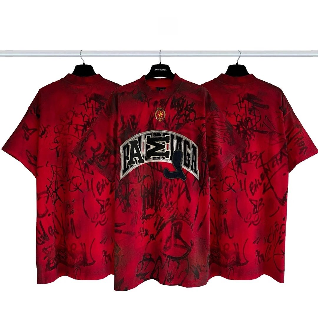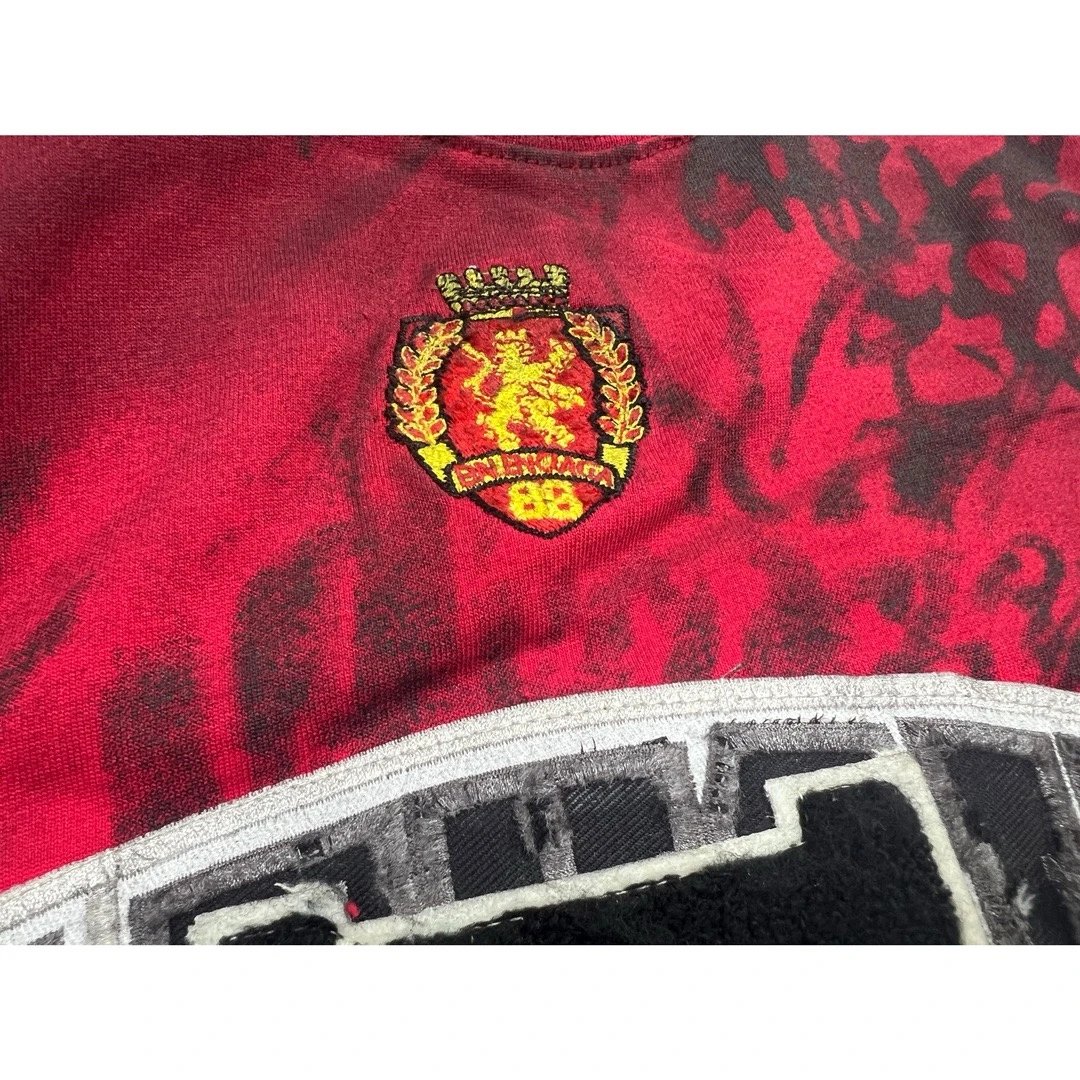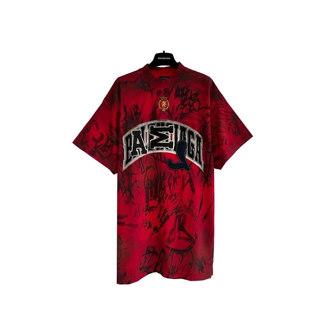 Balenciaga 2023 Manchester United red T-shirt with hand-painted graphic, embroidered logo & distressed details.