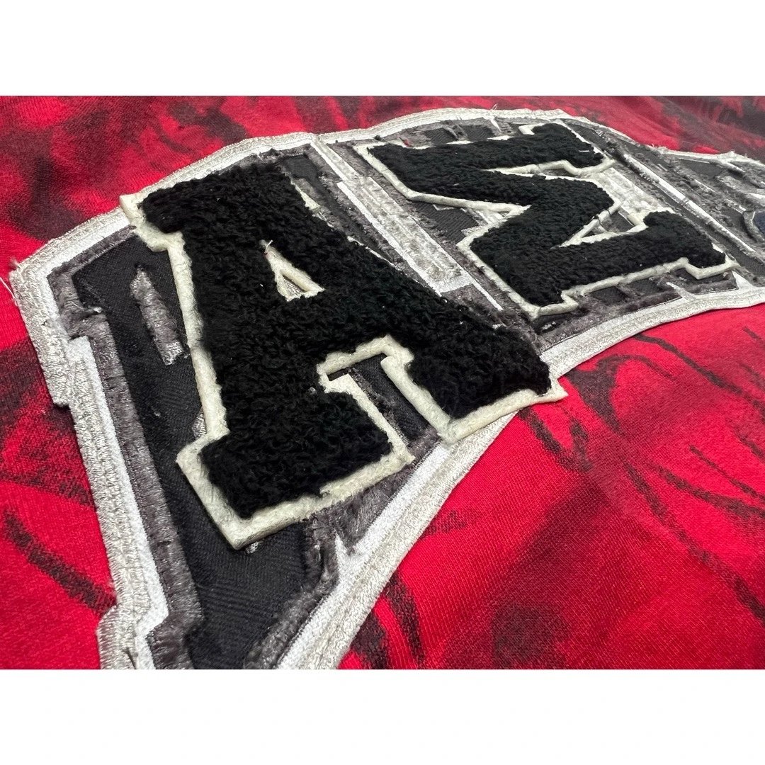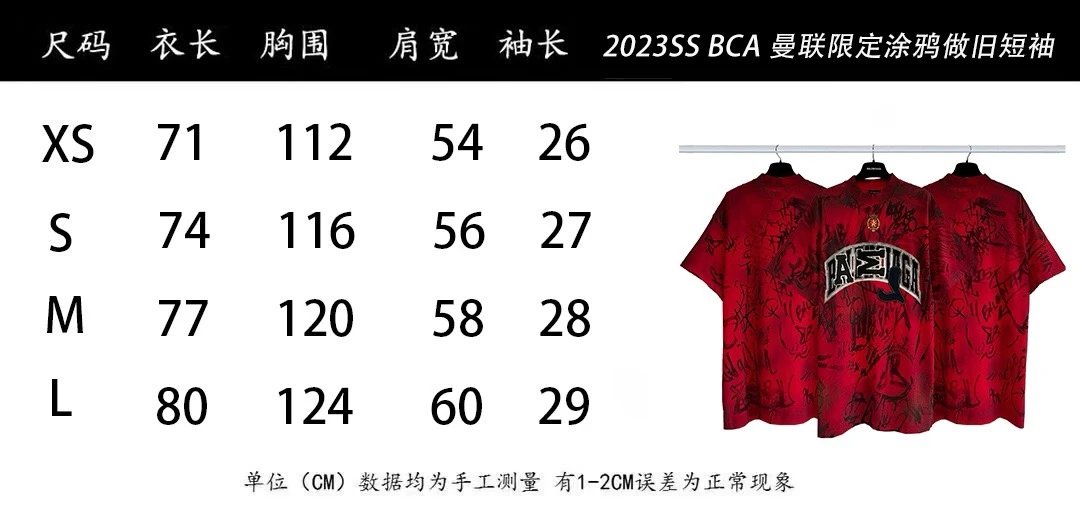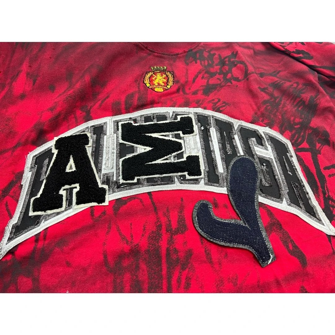Balenciaga 2023 Manchester United red T-shirt with hand-painted graphic, embroidered logo & distressed details.