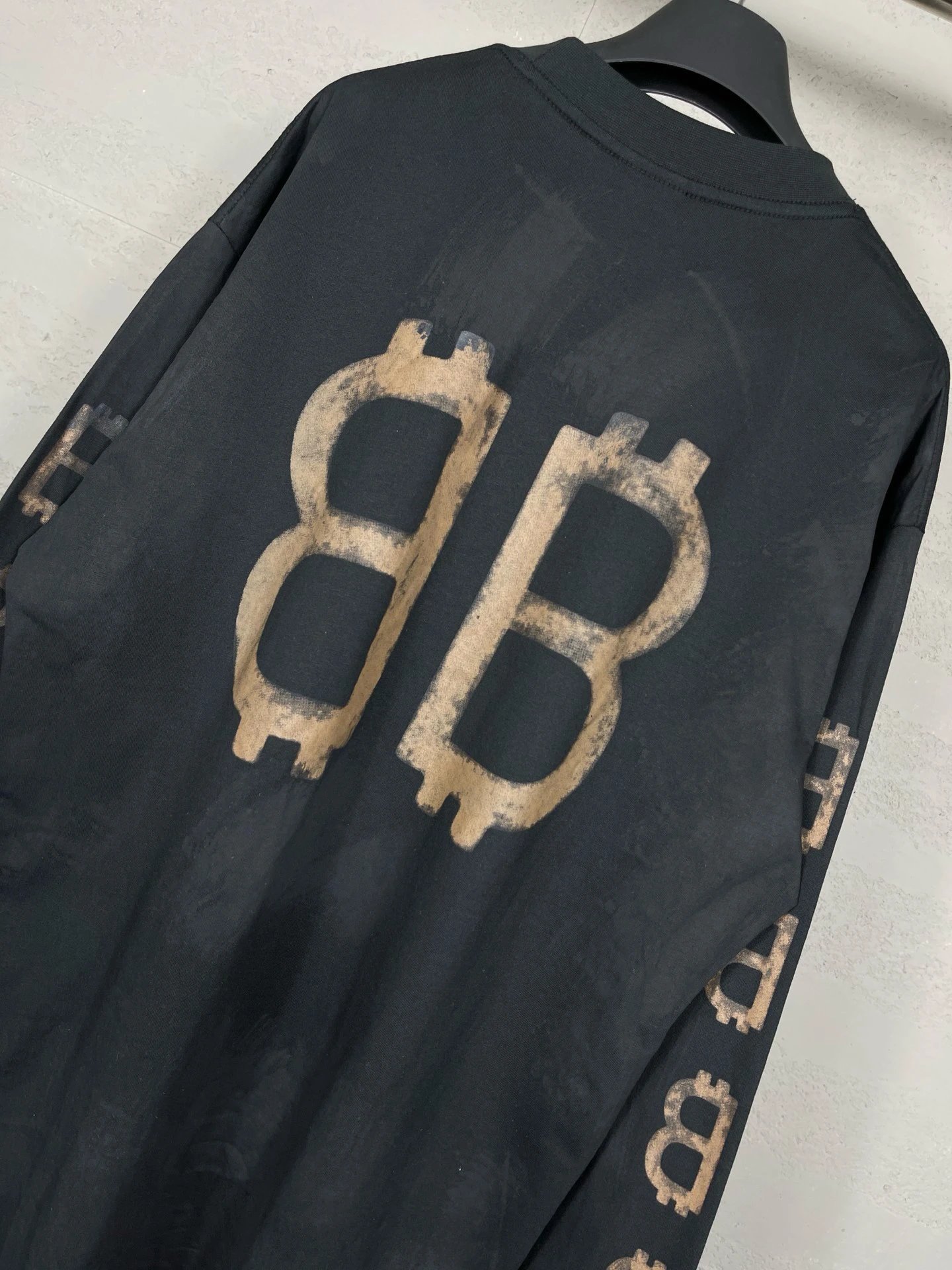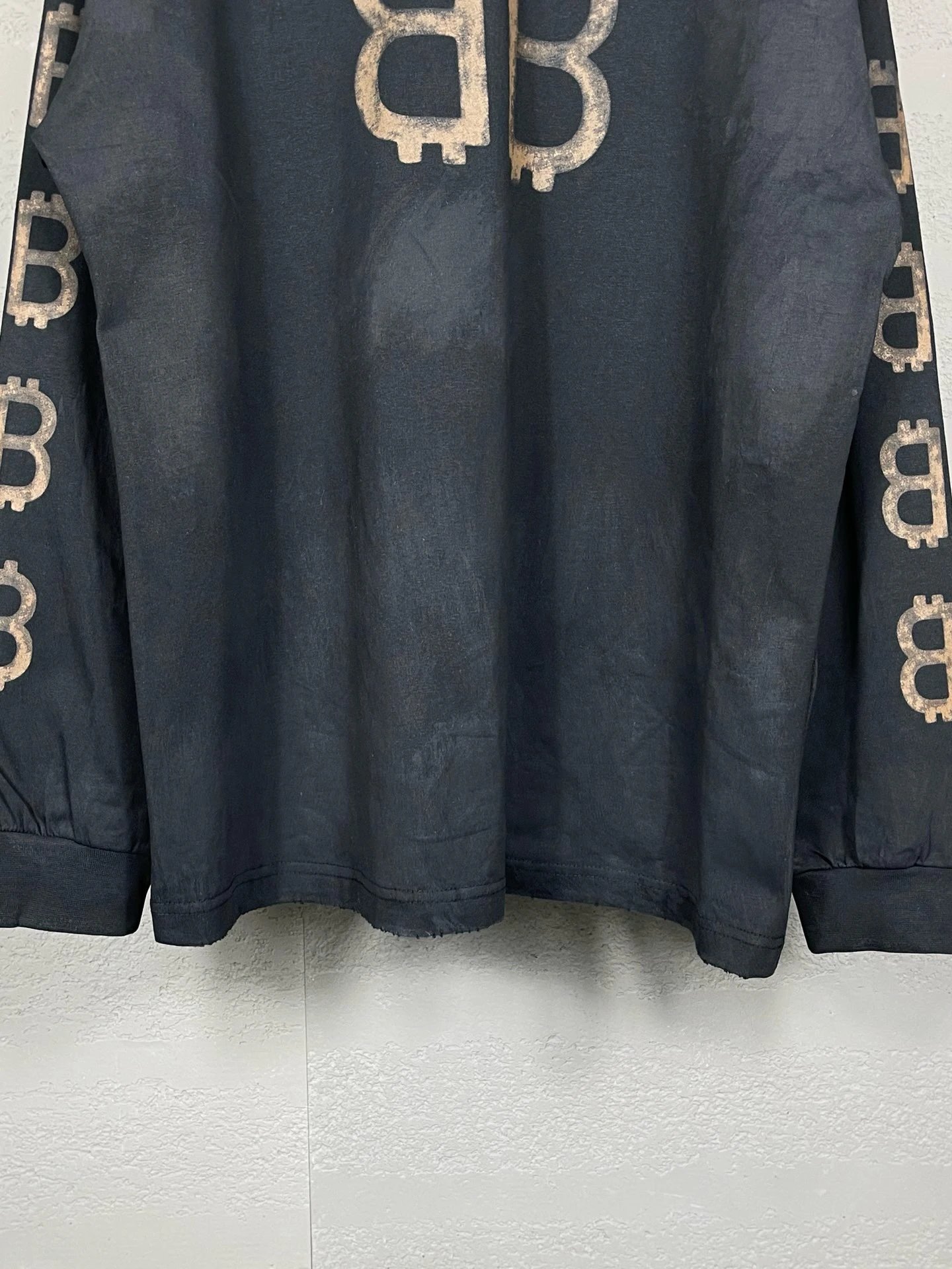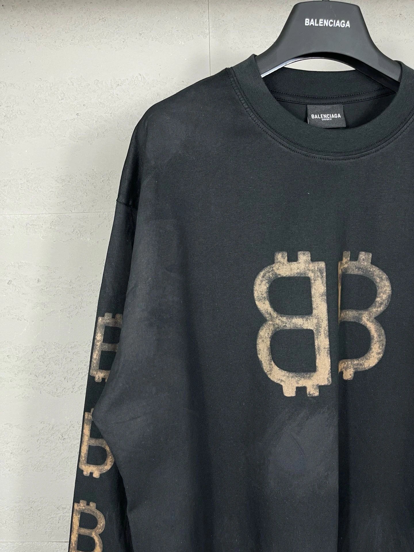 Balenciaga presents this 2023 distressed hand-painted long sleeve T-shirt, mirroring boutique quality.