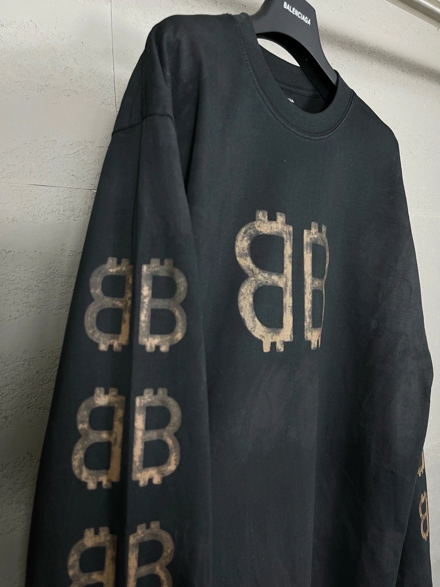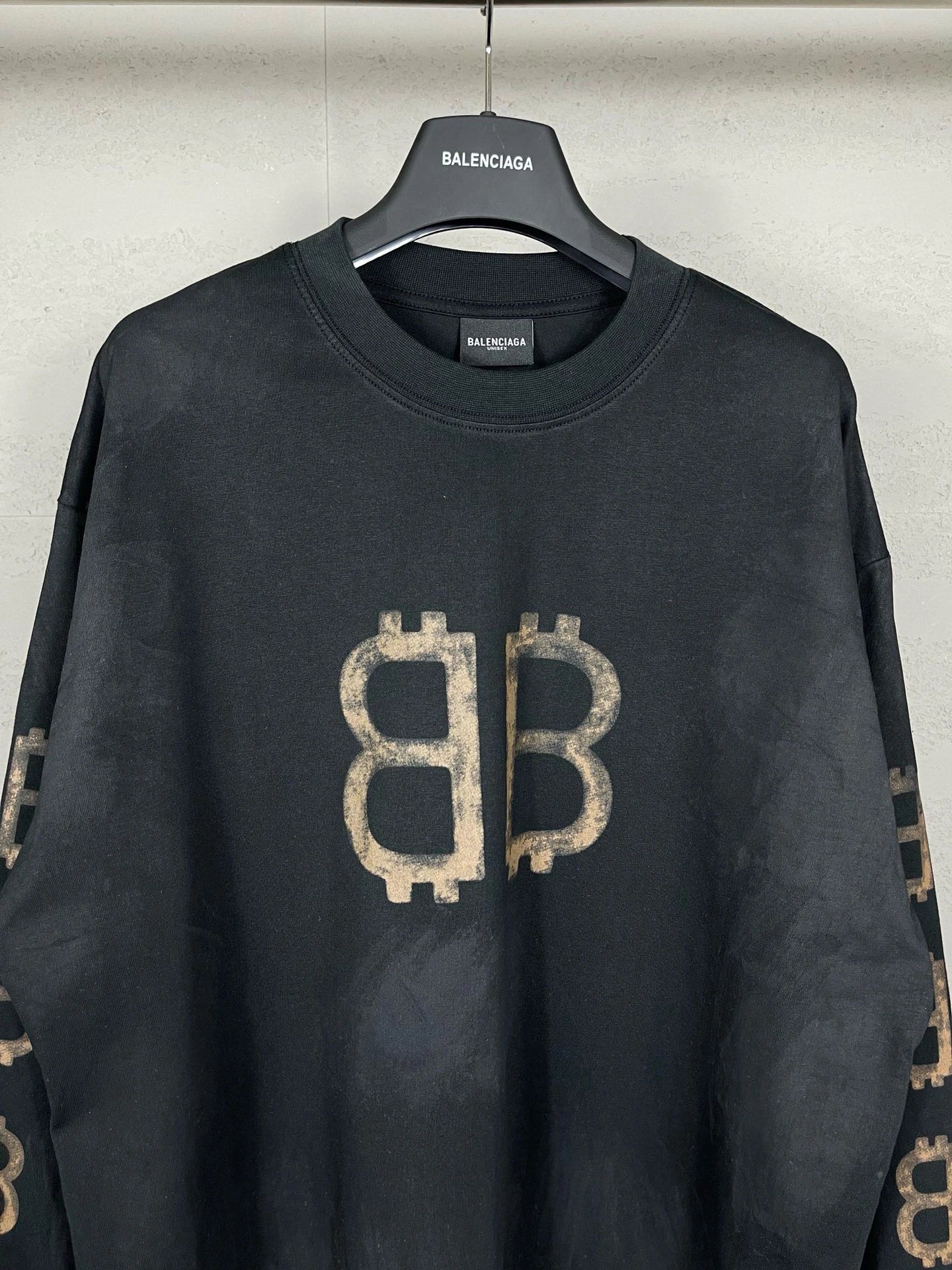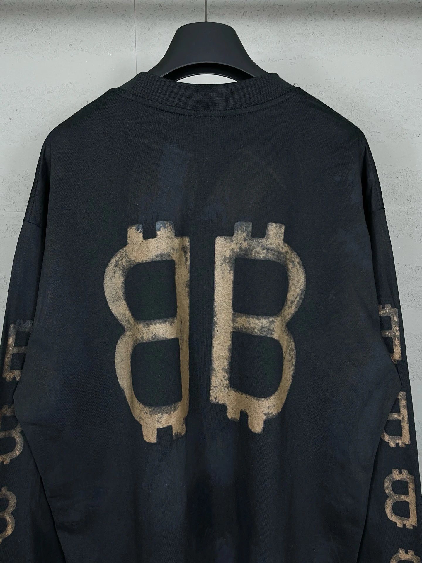Balenciaga presents this 2023 distressed hand-painted long sleeve T-shirt, mirroring boutique quality.